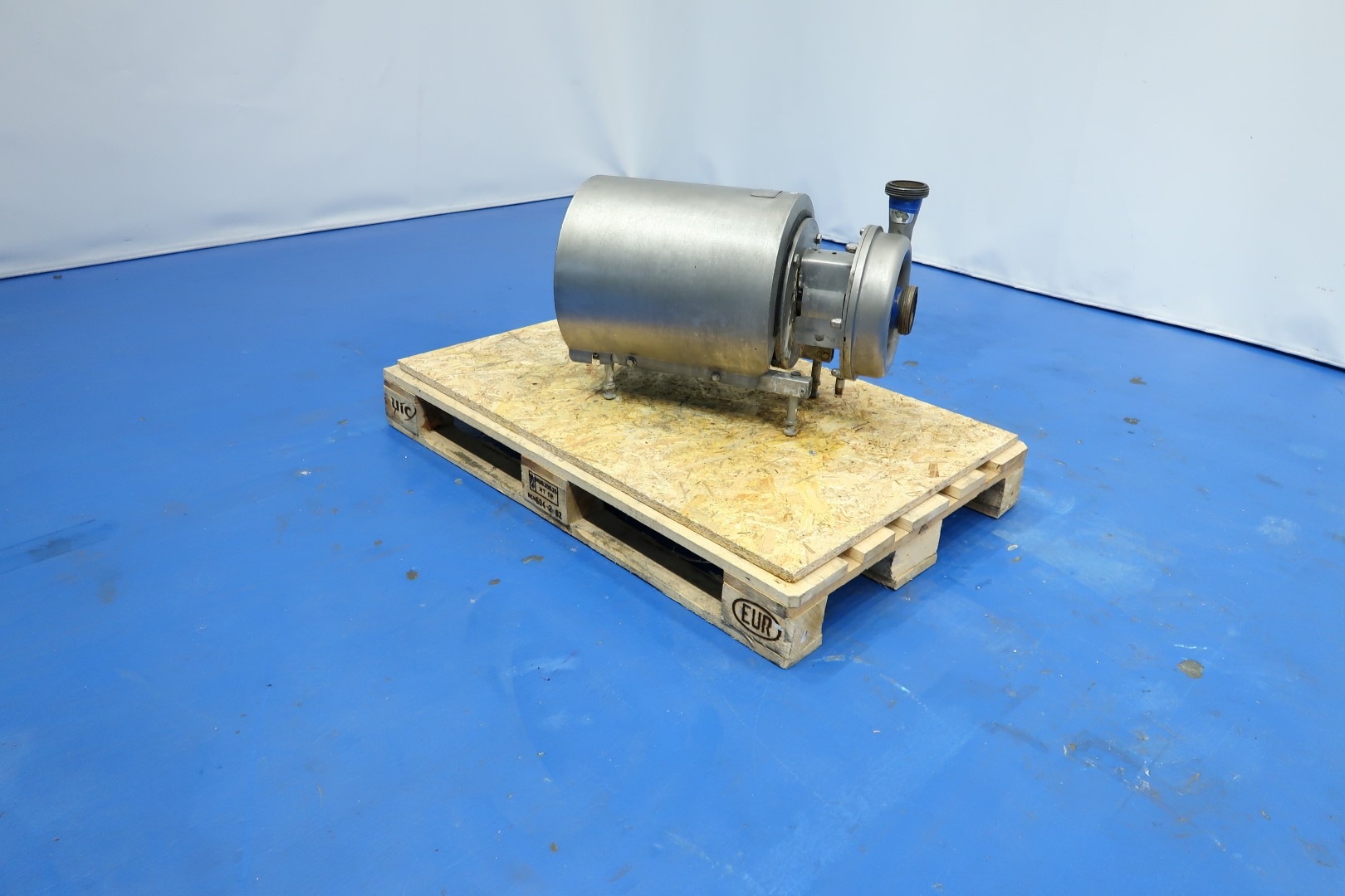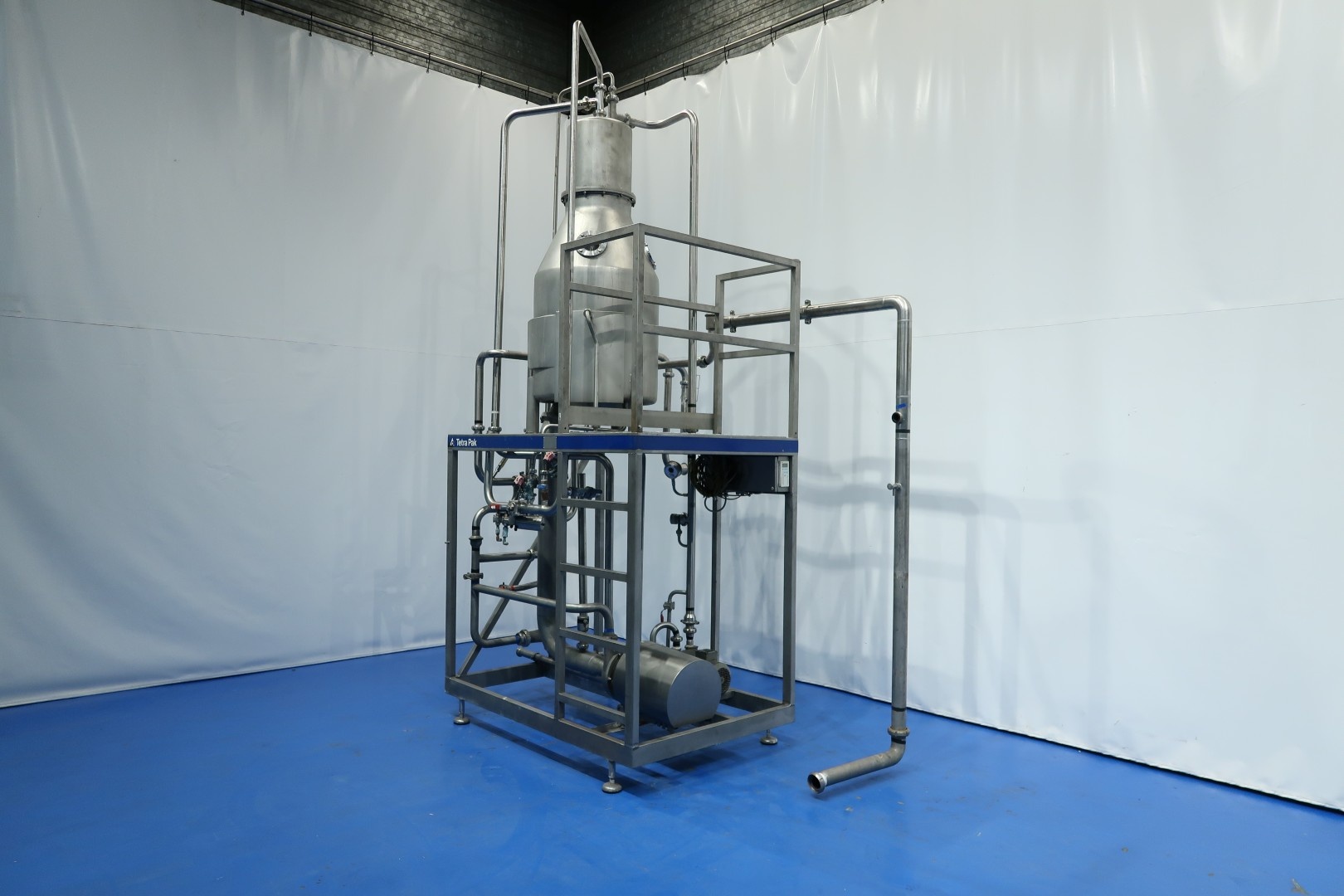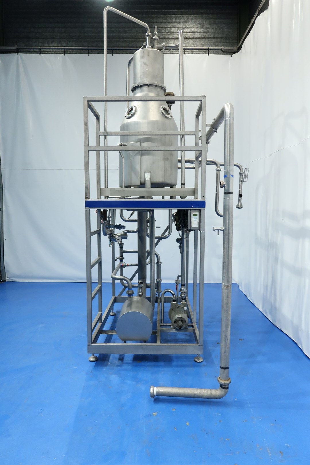 Vacuum dearator, skid mounted. Tank with Tangitial (side) inlet, partly double jacketed, vacuum pump, manometer, vacuum control valve (manual), infeed control valve (now set at 12,000/h) adjustable, double condenser: internal icewater cooled spiral heatexchanger in top of the deaerator for condens and flavour recovery, outfeed pump model: Tetra LKH-25/190 FSS (serial no. 036472 - bj 2001 - 7,5 kW - Ø 190 mm) - flushed seal. Capacity range deaerator unit: 8,000 to 20,000ltr/h. P&ID available. Documentation (electrical diagram and component details) included. Total dimensions: 270x205x420 (lxwxh) - weight: 605 kg.