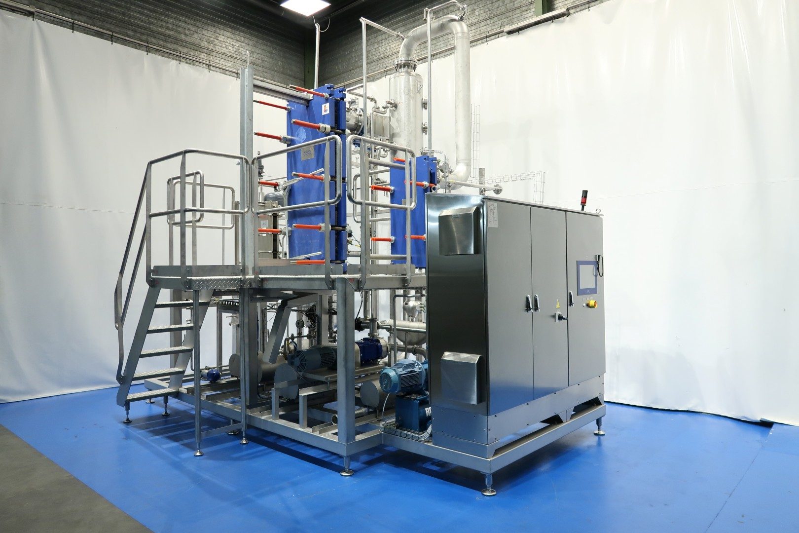 Pilot Alfa Laval evaporation system for concentrating feed from 12% to 65% (dry solids by weight percentage). Unit has a 1-effect evaporation system driven by motive steam. Product In: flow rate 200 kg/hr - pressure 1,5 barA - temperature 15 °C - concentrate 12%. Product out: flow rate 37 kg/hr - pressure 2 barA - temperature 63°C - concentrate 65%. Main equipment: Effect- PHE, Condensor PHE, Preheater PHE-Feed, Preheater-Water, Cyclone separator for Effect-1, Feed pump, Water loop pump, Effect-I reciruclation pump 1, Effect-I recirculation pump 2, Effect-1 condensate pump, Condenser condensate pump, drain pump and vacuum pump. Drawing no. 9661468089. State of the machine: Excellent. Documentation digitally available: Electrical diagrams, Technical documentation, PID, Component drawings, Installation and Operation Manual. Originally built for R&D factory, newly built and prepared for operation. However, never proactively used for (test) production. Unit can be used for: proces development and optimalisation, testing before industrial scale-up, testing new products or compositions, R&D, econom and technical feasibility study. With SS frame with 23 spare plate heat exchanger plates. Currently in our warehouse. Total dimensions: 590x355x467 (lxwxh) cm - weight: 5.290 kg.