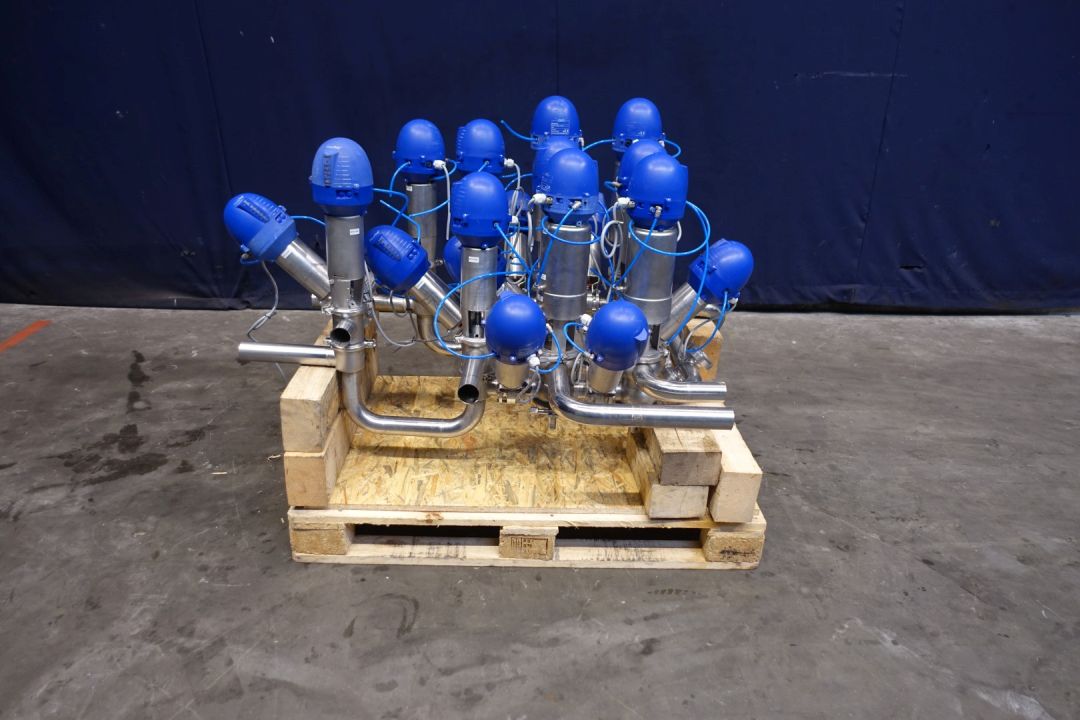 Valve manifold with 18x Alfa Laval valves: 8x Alfa Laval LK KA-t buttefly valves, 6x Alfa Laval SSV 3-way and 4x unique mixproof 4-way with seat lift. With 2 x sight glass by Bulls-eye. All valves with thinktops smart head All pneumatic activated. Diameter: 2" Weld-Weld. Dimensions: 140 x 130 x 80 cm - weigth 223 kg's. PID available used to split 2 incomming lines to 3 outgoing lines.
