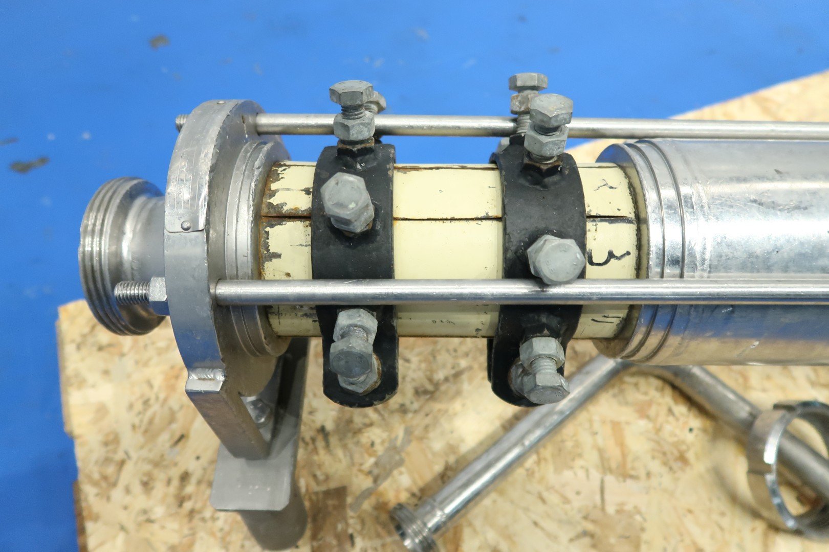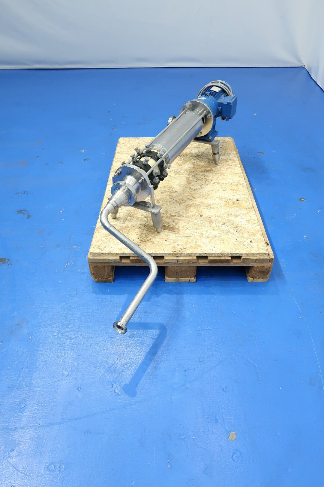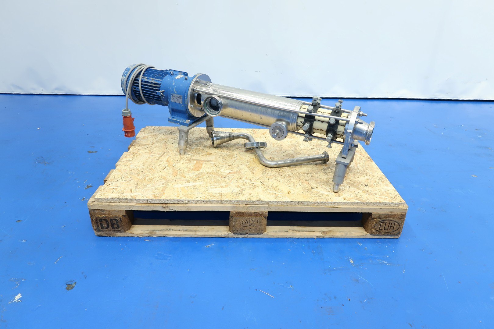 Eccentric screw pump. motor: 1,1 kW - 2,38 A - 50 Hz - n1 1.430 rpm - i = 10,56 - n2 pump speed 135 rpm. Mounted on 4 adjustable feet. Connections: (in) 3" Din / (out) 3" Din to 1,5" Din. Capacity estimated. Dimensions: 120x26x36 (lxwxh) cm - weight: 60 kg.