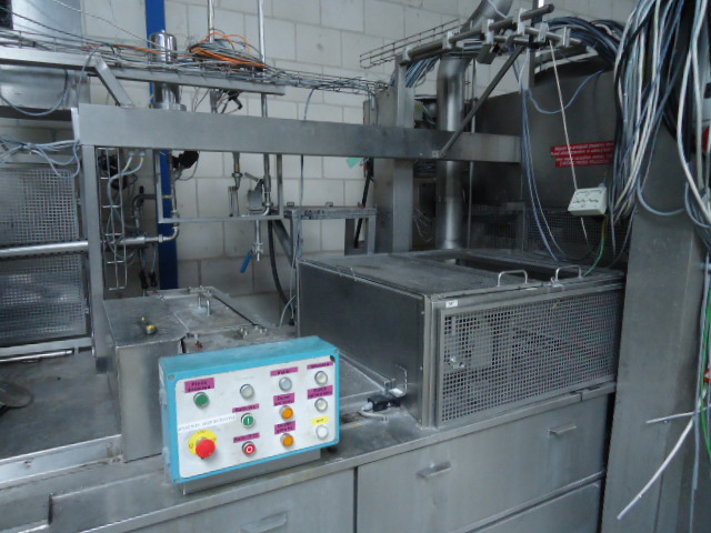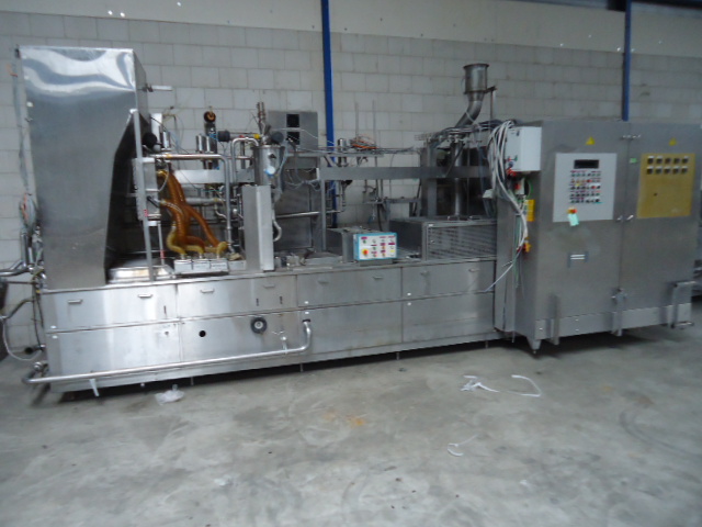 4 Lines, Cup filling and sealing machine for viscous products like yoghurt. Cup diameter 75 and 95 mm, double plates for automatic format change by moving chain 1 step forward or backward. Cup decontamination by UV light (air cooled Heraeurs cassetes) , main doser 100 - 550 ml (CIP cleanable), lid sealing and packer (only gripper 3x4, 95 mm). Control panel with Siemens S5 PLC. Dimensions filling machine only: length (without outfeed conveyors) 509 cm - width (without outfeed conveyors) 171 cm - heigth (max) 370 cm. Width +/- 8.000 kg.