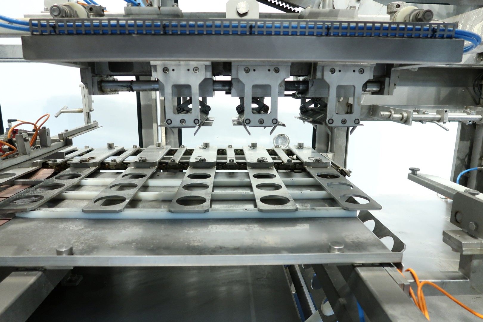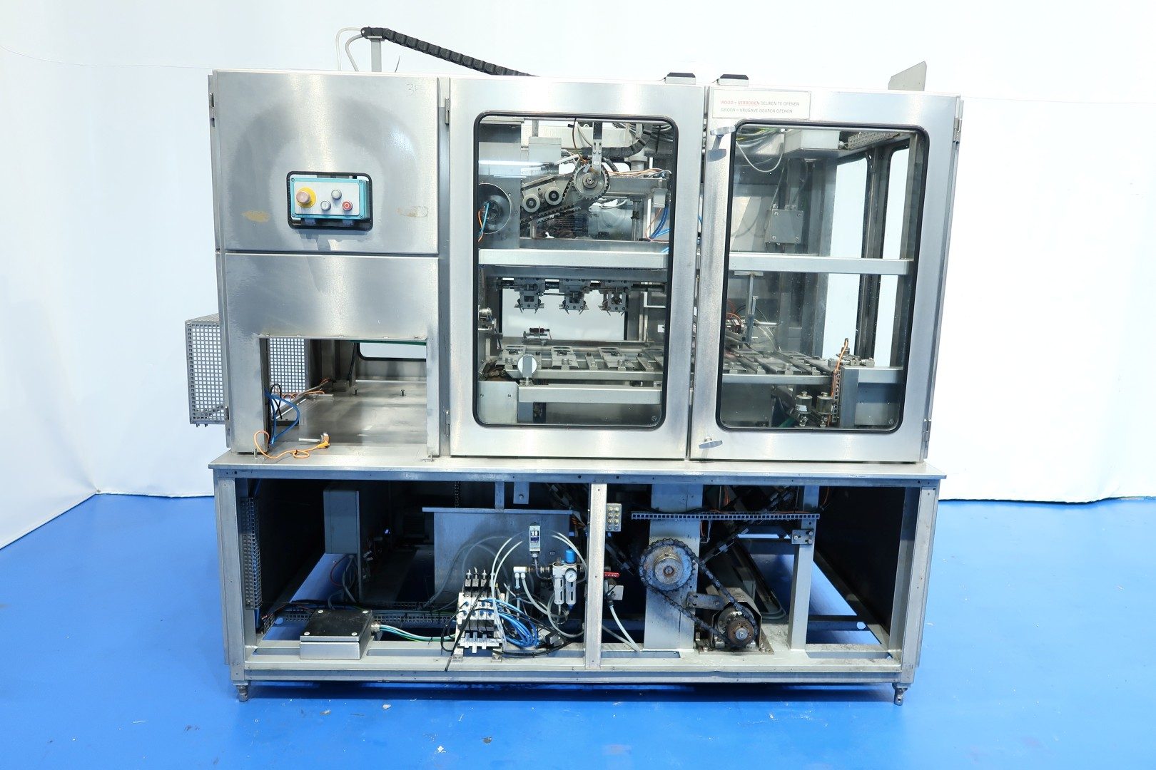 Fully automatic packer, for trays. Used for round cup 116 mm. Pack scheme: 3x2 = 6 cups per tray. Current dimensions of the tray: ca.250x360 mm. Motor: 3 kW - 50 Hz. Compressed air 14 Nm3/h - 7 bar. Controls: SIemens Simatic S7-1500. Original filling machine (Ampack KF1/3) also available under (STN15964). Total dimensions: 265 x 180 x 220 cm. Weight: 1.440 kg.
