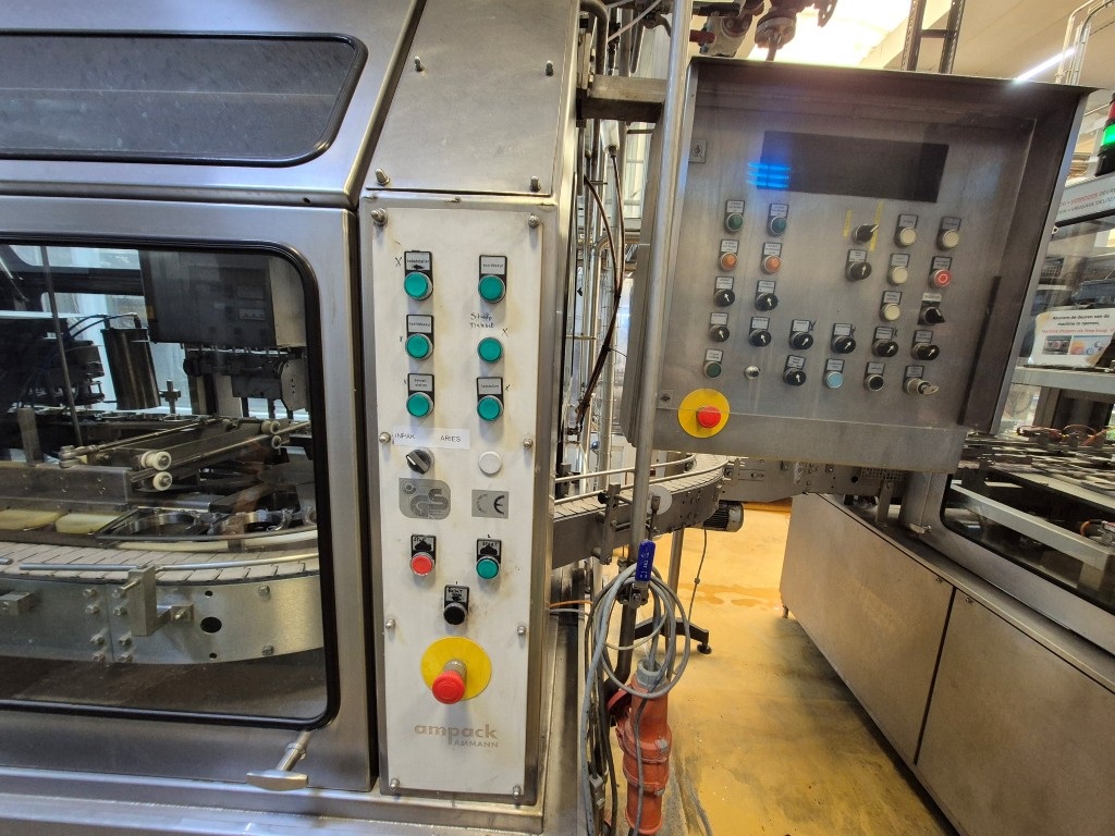 Carousel Cup filling- sealing machine. Formats on this machine round 95 mm. Capacity depends on viscosity and foam properties of the product and shape- and headspace of the packaging. Steps of the machine: 1) Preformed cups unstacking with vacuum, 2) Cup decontamination by peroxide injection and drying with superheated steam in 4 steps. Electric air heater built on the machine. 3)  Predoser, cutting of doser for viscous products like fruit jams,  CIP-cleanable by placing a cleaning bar. 4) Main doser, positive doser, combination filler, flexible for thinner and thicker products CIP-cleanable by placing cleaning bar. 5) Seal decontimanation (by infrared radiators) and applying station . 6) Heat sealing. 7) seal checking station by squeezing the cup and seal detecting. 8) Over Snap cap Lid pressure station (only for 95mm) 9) Outfeed to conveyor belt. Controls: Siemens Simatic S5. Original packer (ASGP4) also available under STN16003. Dimensions ca.: 600x175x280 (lxwxh) cm - weight: ca. 6.000 kg's.
