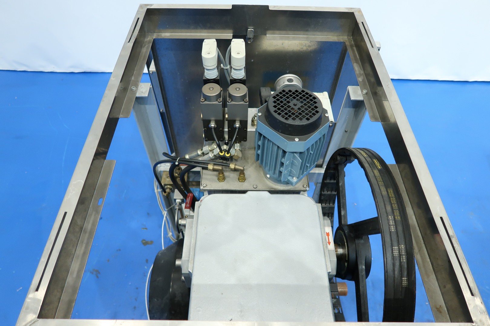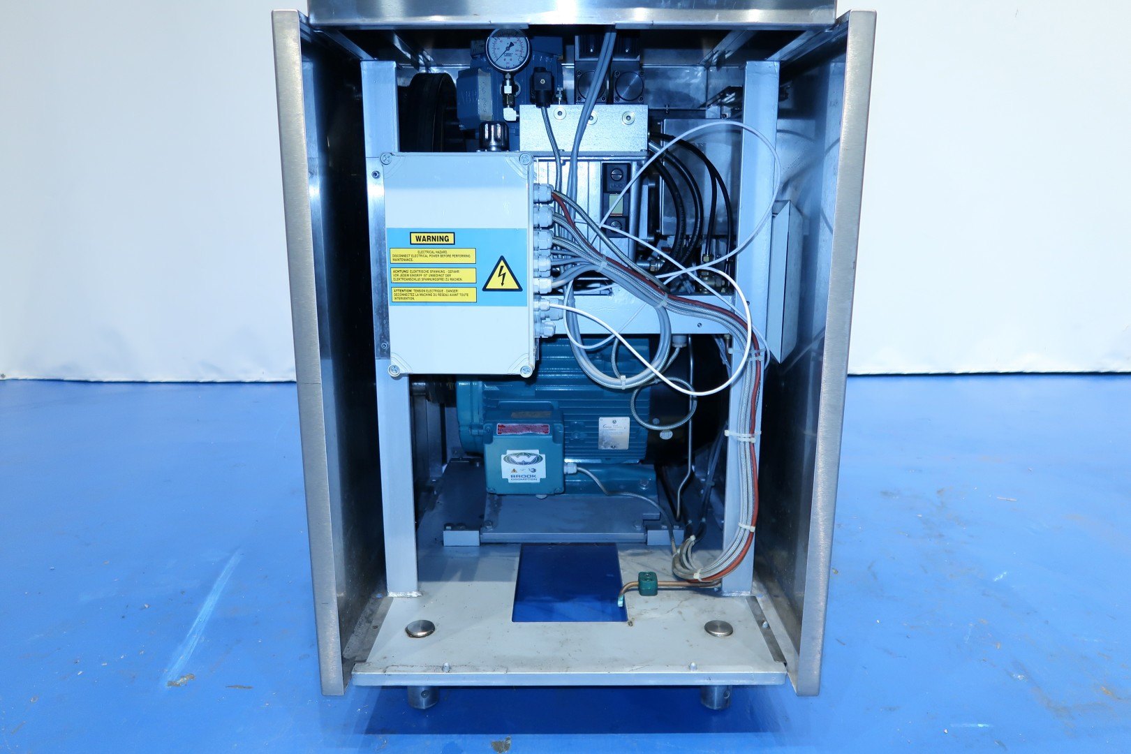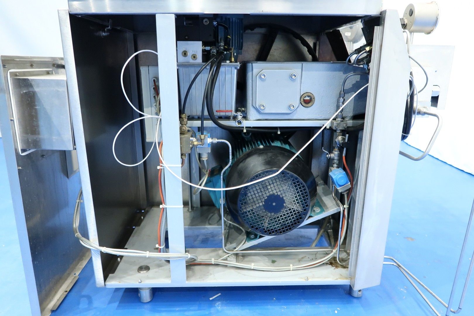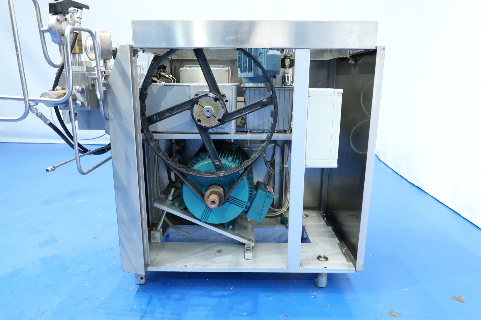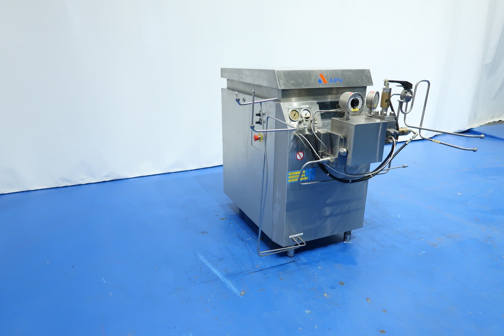 High pressure laboratorium homogeniser. 2 Stages with hydraulic pressure control. Ball valves for viscose products, 3 Pistons, piston diameter: 18 mm and stroke: 38mm. Connections: 1" Clamp. Motor power: 5,5 kW and maximum pressure in current confirguration with this motor up to 400 bar (5,800psi). oil circulation pump Built in control panel. with manual bypass valve. Manometer.Flowswitch on cooling water. Total dimensions: 144x113x143 (lxwxh) cm - weight: 482 kg.