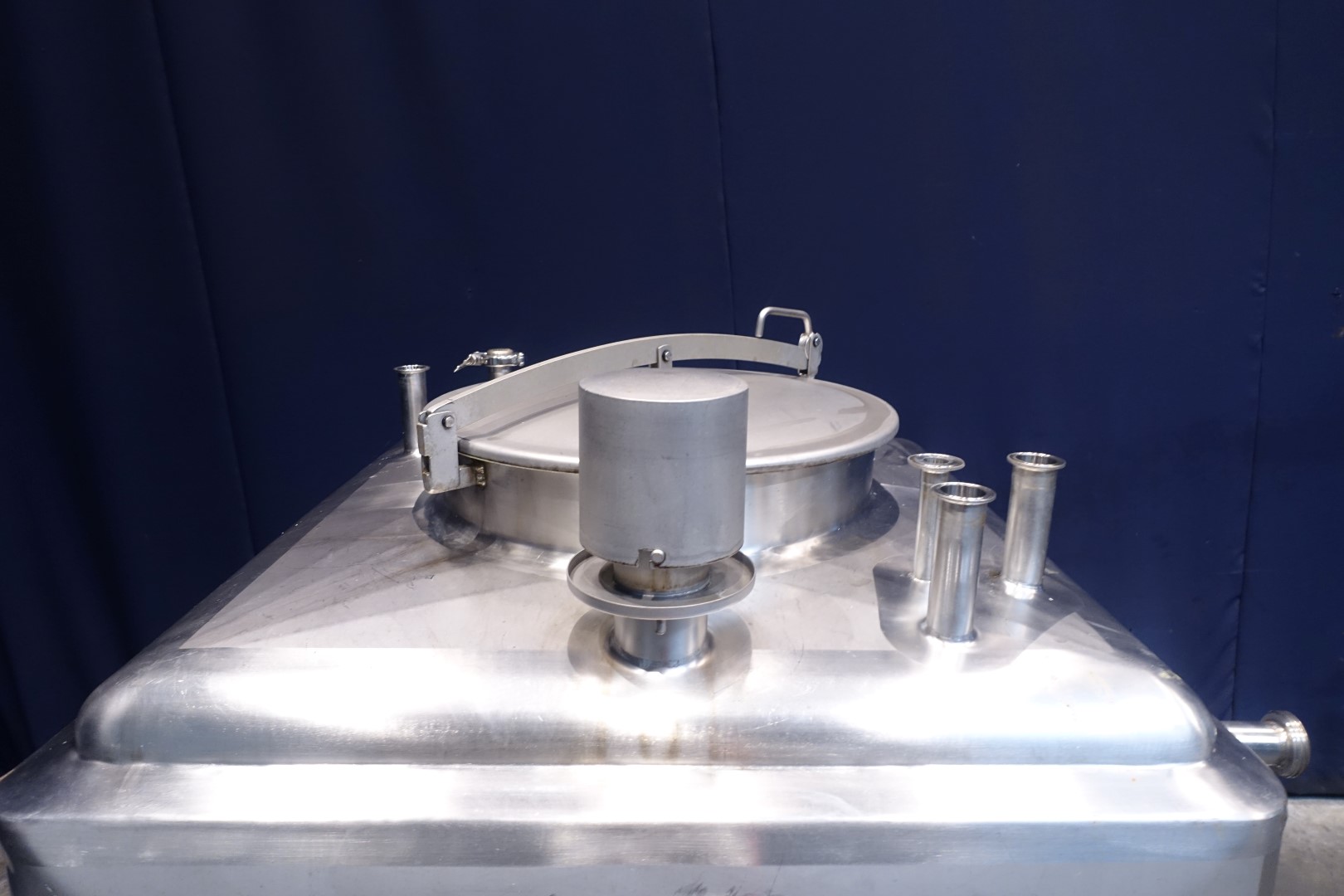 Liquiverter. Tank volume: 500 ltr. Double jacketed (slight explosion damage on jacket only not to inner tank). Spray bowl for CIP. Temperature indicator and manometer. Liquid ingrediënts inlet. Breather. Motor: 11 kW - 1.460 rpm. Total dimensions: 160 x 100 x 170 cm.