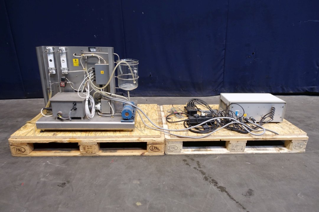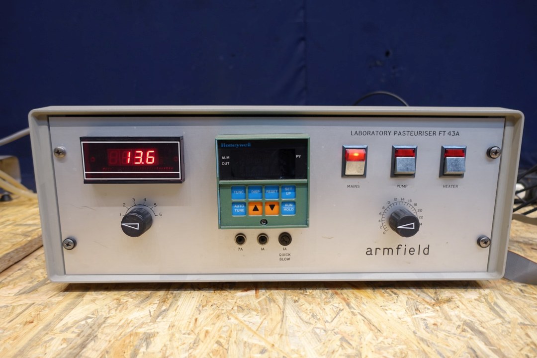 Armfield Laboratory Pasteuriser FT 43A. With controls. Set consists out of feed tank, pump, plate heat exchanger, hot water tank, pump, holding and diverter valve. Total dimensions: 76x55x65 (lxwxh) cm - weight 102 kg's. capacity estimated.