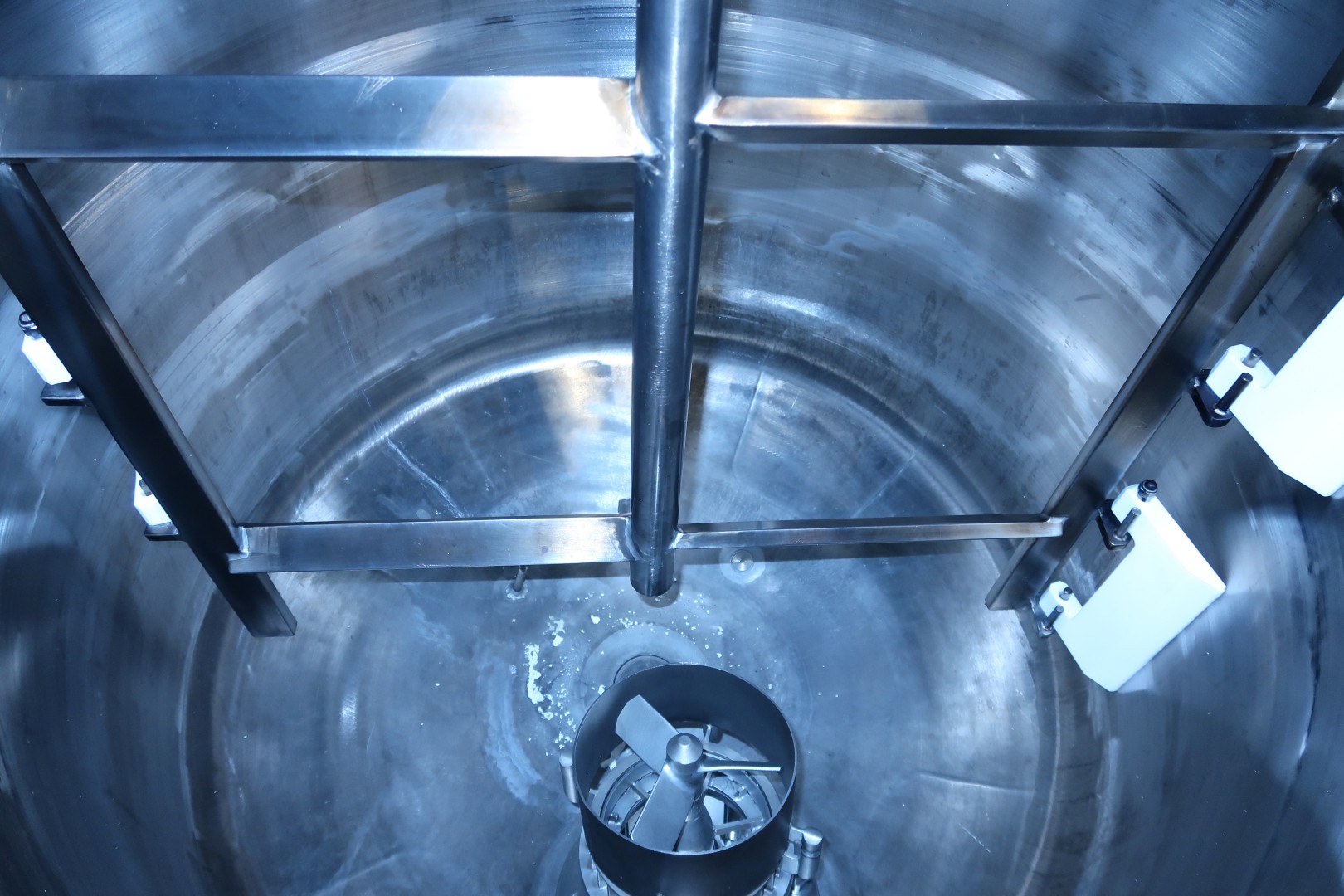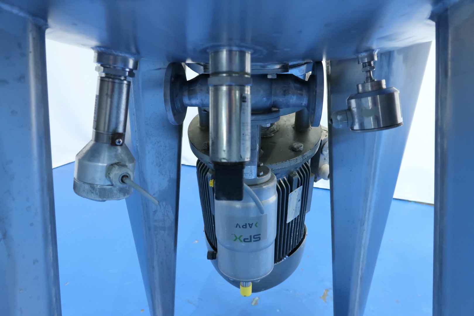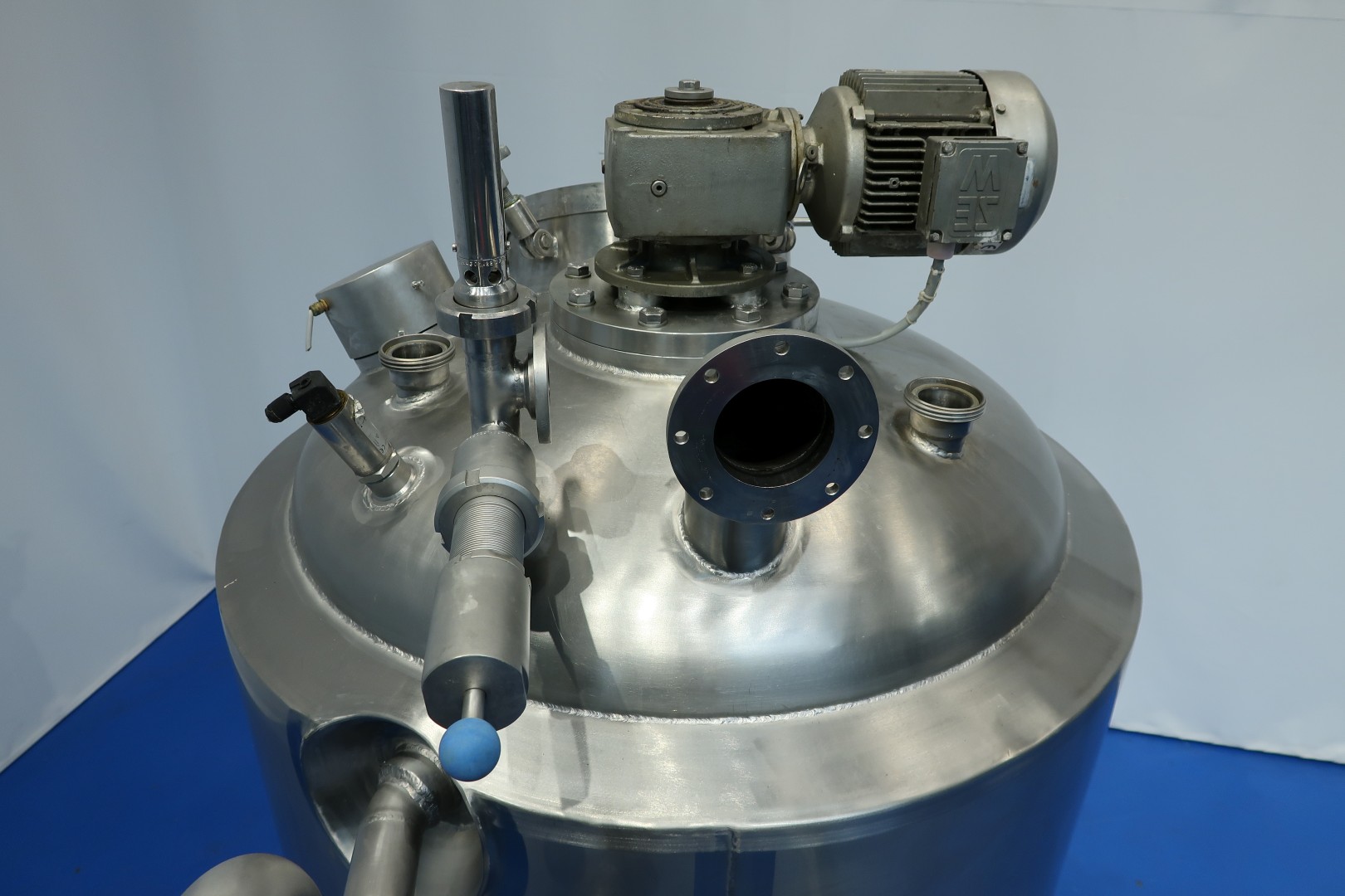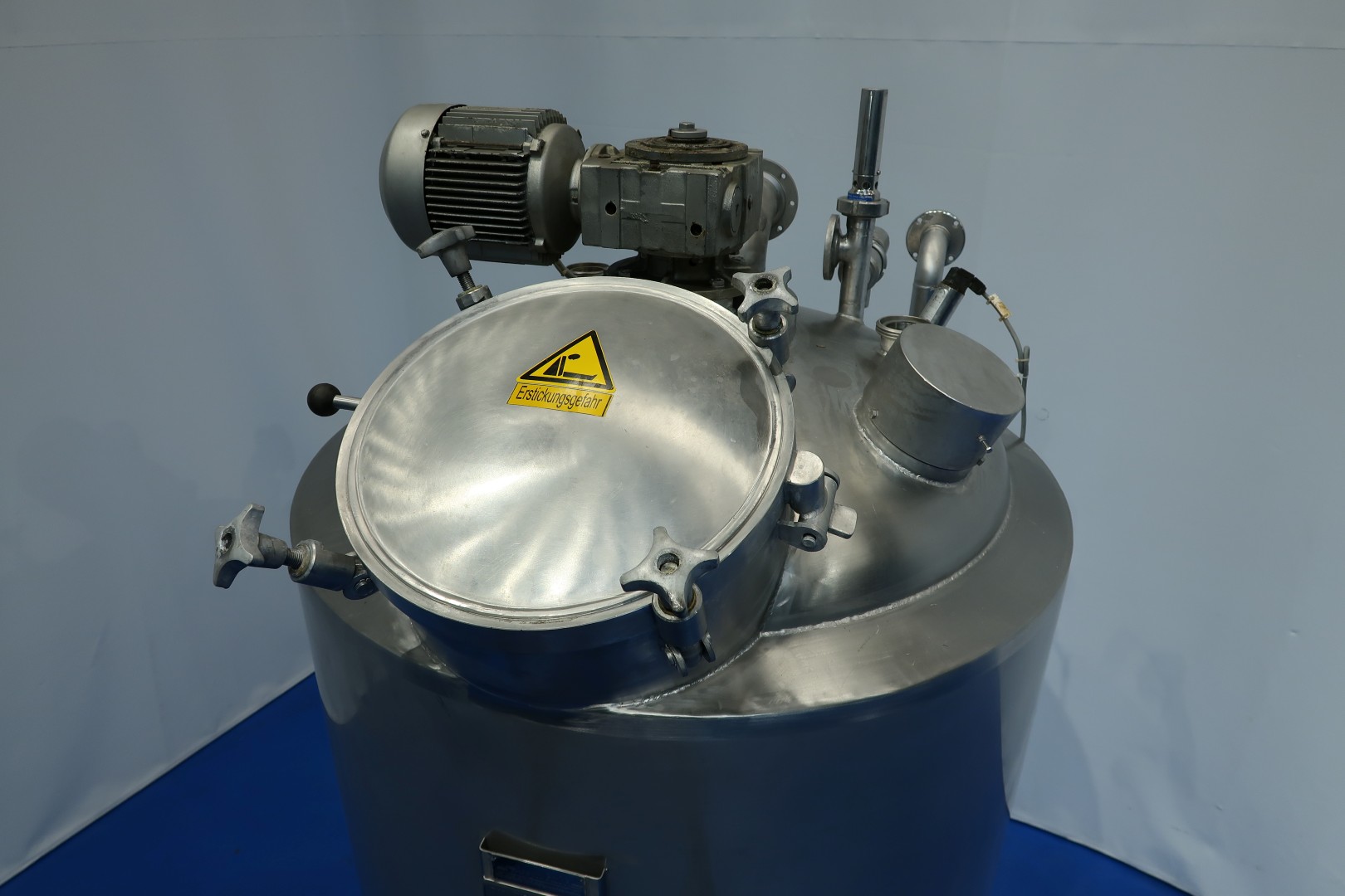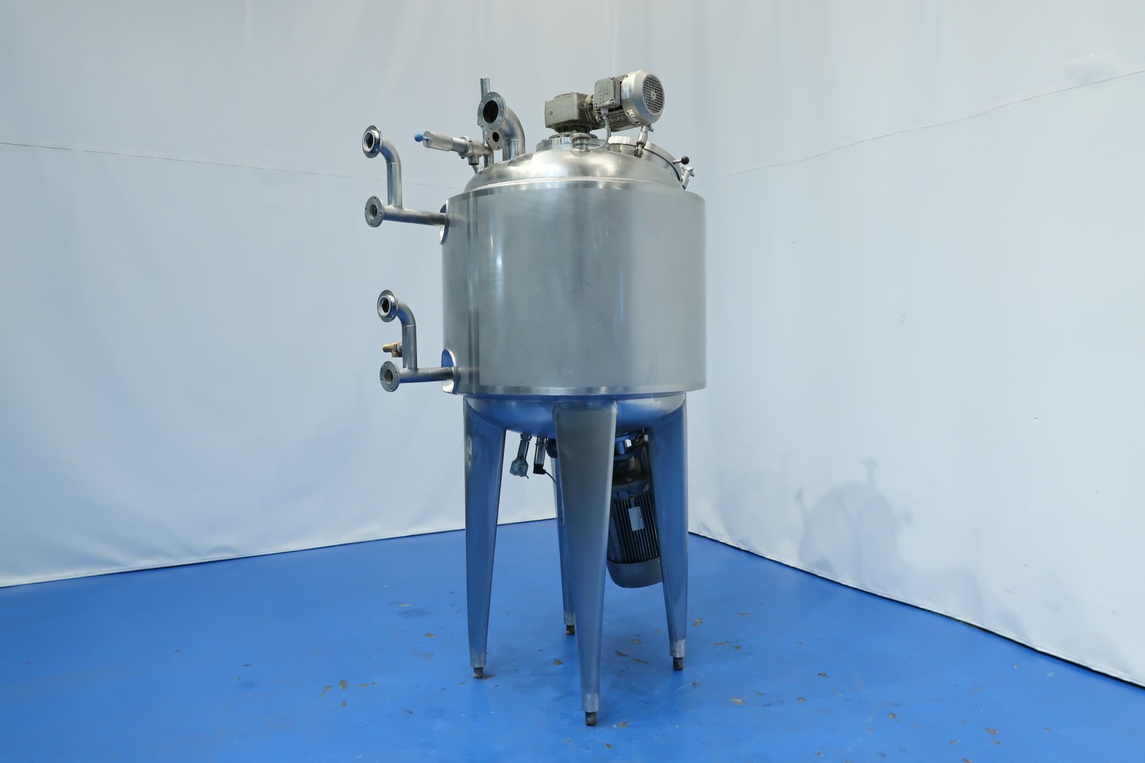 Vacuum process tank with double jacket for heating and cooling, 2 agitators. A heavy duty high speed Rotor/stator - screen - propellor mix agitator with motor power: 18,5 kW! speed: 2.920 rpm. + Scraper Agitator in cylinder part, Motor power: 0,86 kW, max 32 rpm. Pressure in jacket: 4 bar. Pressure in tank: vacuum -0,8 / +0,99bar over pressure. with over and under pressure protection valve mounted on top of the tank. Product outlet bottom valve 1,5" valve (make APV) with position sensor, outlet height: 93,5 cm. Including sample valve and light. Sensors in bottom Pressure sensor (PT), Temperature sensor (TT) and level sensor (LT), High level sensor in top HL. 2 Connections on top for CIP spray bowls in top (currently not inserted). Manhole, round, diameter 272mm. 3 Adjustable feet. Inside dimensions of tank: Ø 88,5 cm and cilindrical height 85 cm. Connections topside tank: 3x 2,5" Din and 1x DN80 - connections side of tank: 4x 2,5" - connections bottom: 2x 2" Din. Total dimensions: 140x95x240 (lxwxh) cm - weight: 620 kg.
