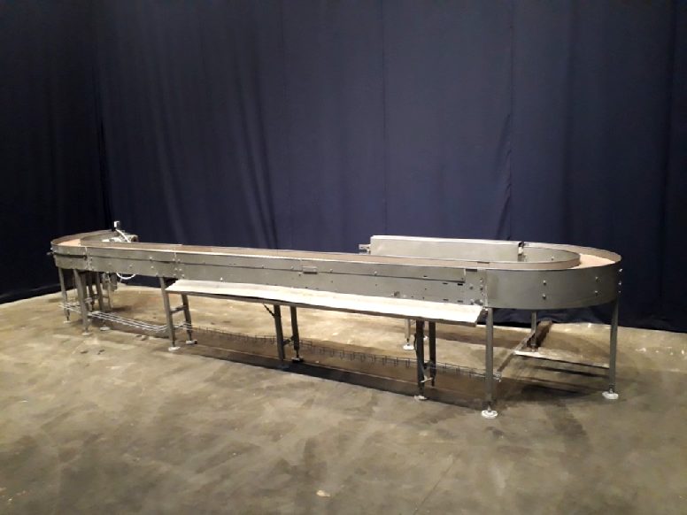 Chain conveyor with 90 ° infeed corner and 180 ° outfeed corner. Effective belt: 1.000 x 25 cm. Motor: 0,55 kW - 52 rpm. Horizontal. Total 160 x 650 x 115 cm.