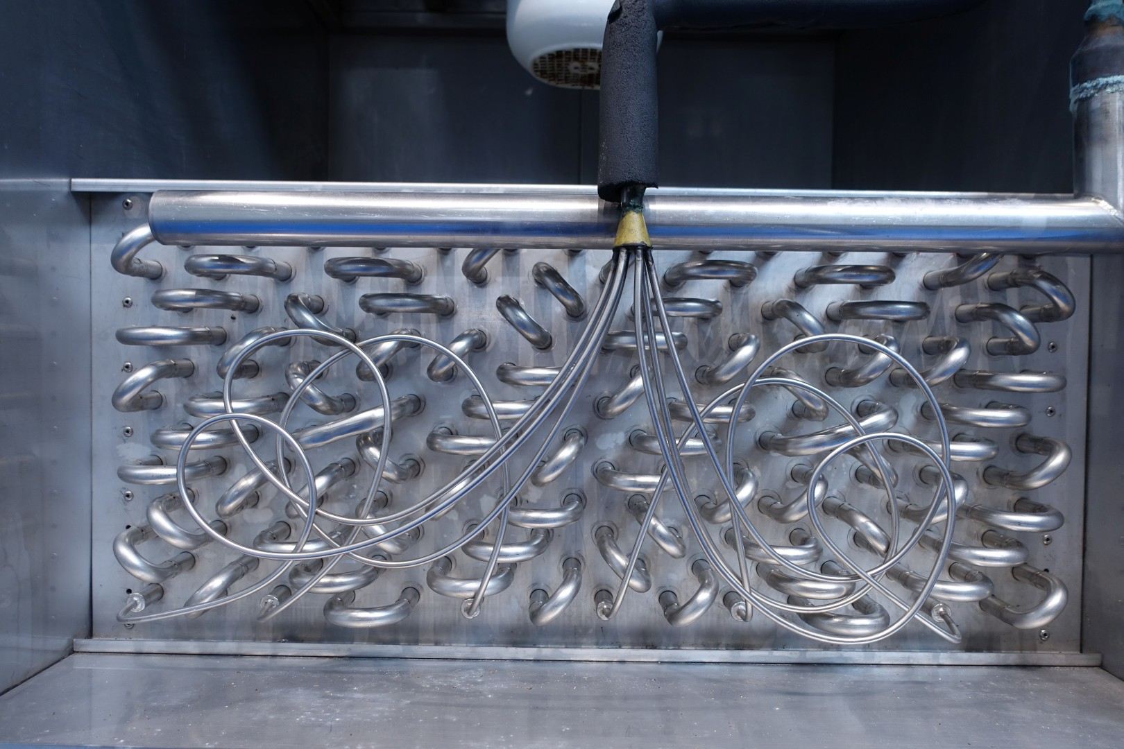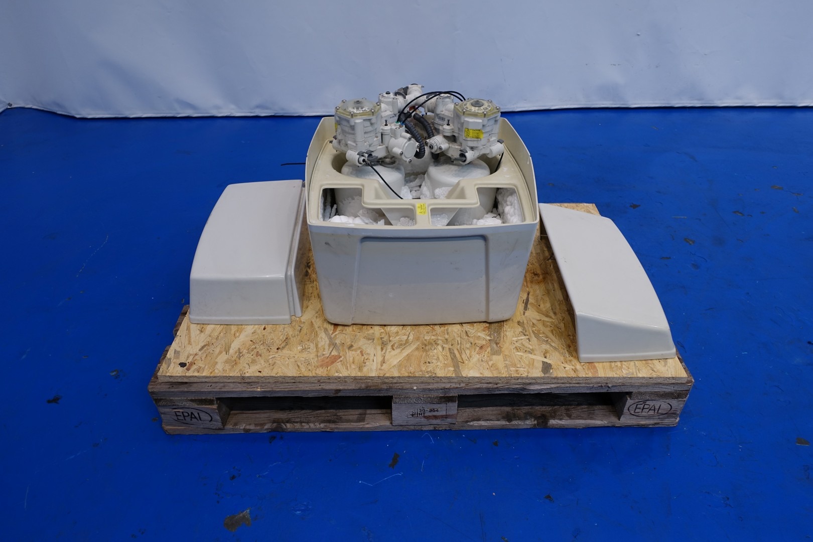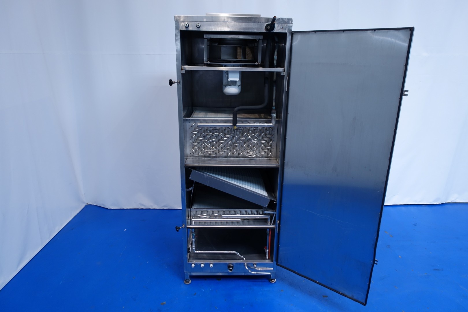 Cheese storage climatisation unit, to control air temperature and humidity in a cheese storage. Very compact design in stainless steel housing. Air treatment unit Blower, Filter, heating and cooling heatexchangers. Possible of water injection and water softening, by salt. Water circulation, pump-/RO filter system and controls. Box Dimensions: 110x110x280 (lxwxh) cm - total weight: 843 kg