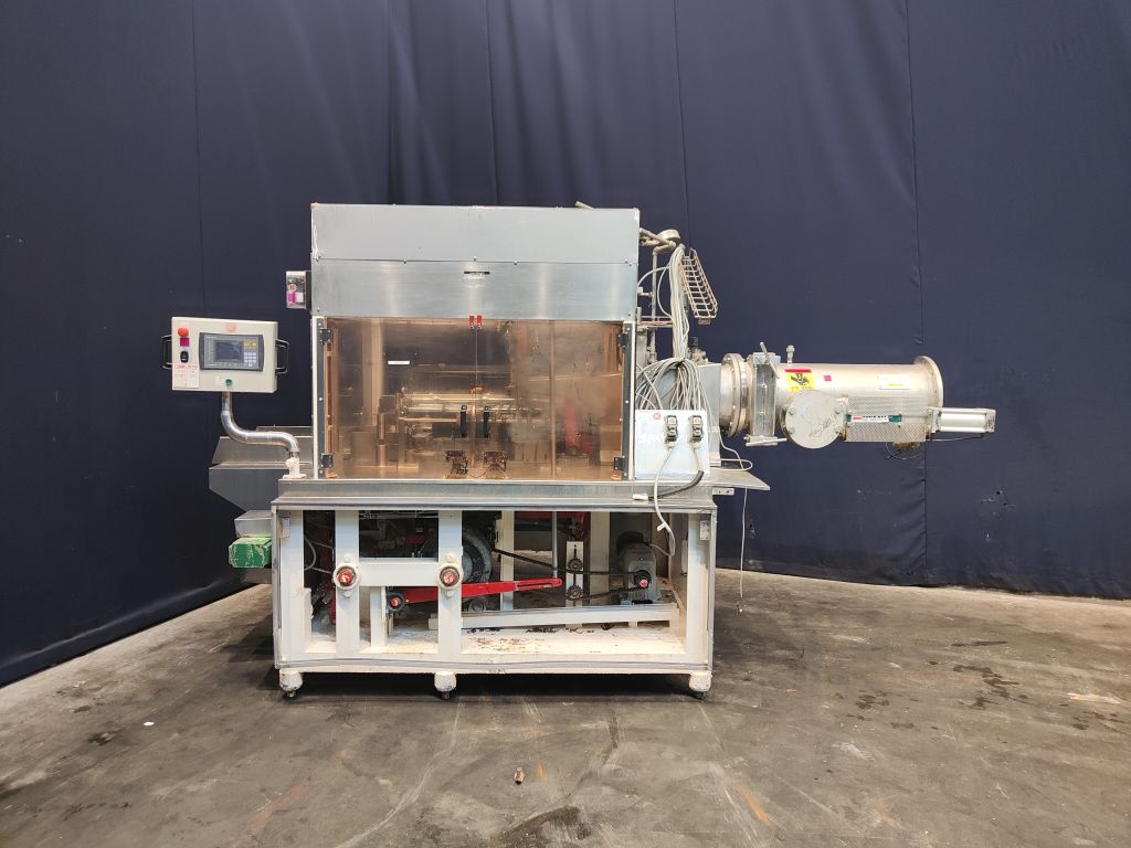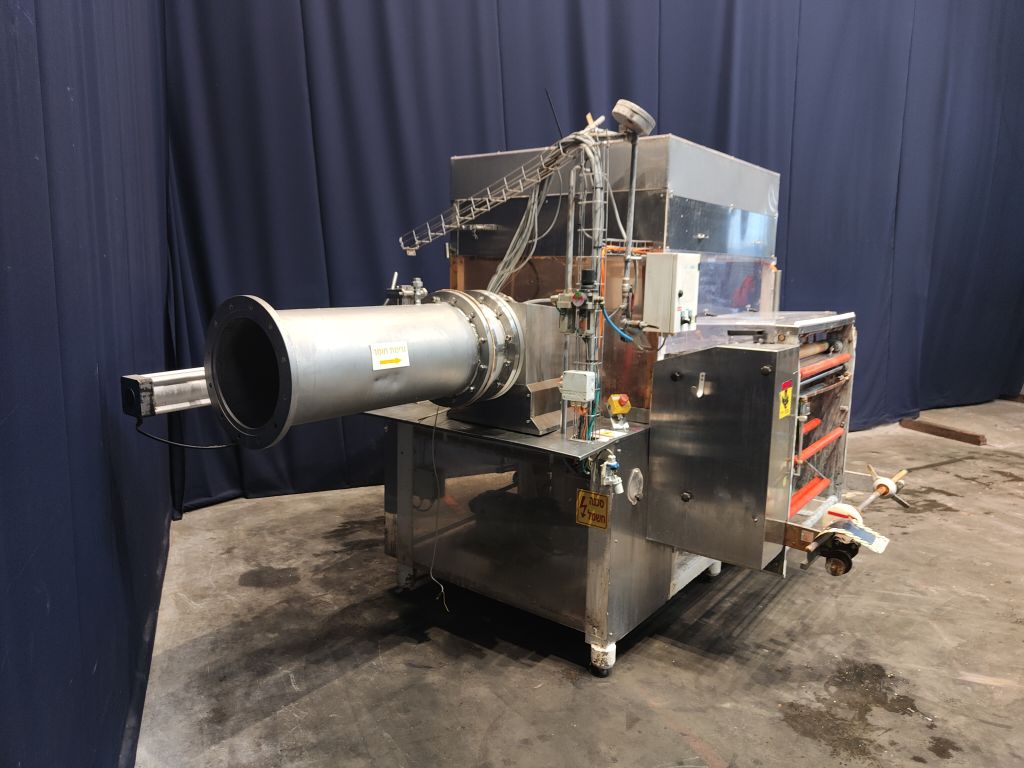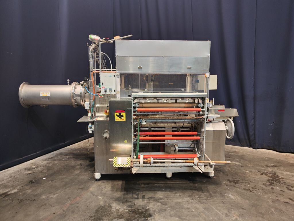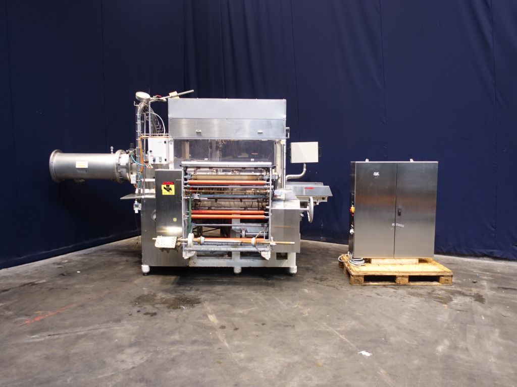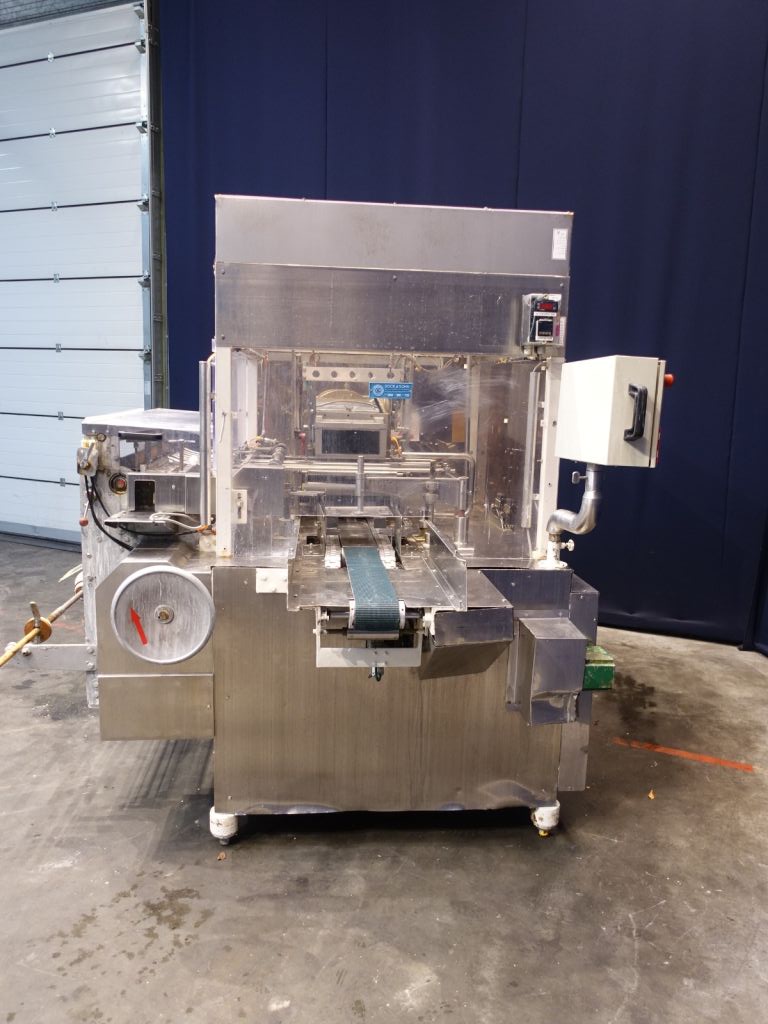 Fully automatic filling and wrapping machine for margarine in aluminum foil. Product feed by direct link. No date coder. Photo cell for print centring device (paper correction by spot mark). Outfeed conveyor of 75 cm. Format sets on this machine: 2,5 kg, 260 x 100 x 100 mm. Capacity: ± 750 blocks per hour, depending on format and product. Control panel with relay control. Complete with Bock en Sohn piston dosing unit with compensator and return line, serial number 122446, year 1997. 2 format sets (adjusting the stroke length) for the doser, 2 and 2,5 kg each stroke. Total dimensions: filling machine 350 x 230 x 230 cm and dosing unit 280 x 210 x 180 cm.