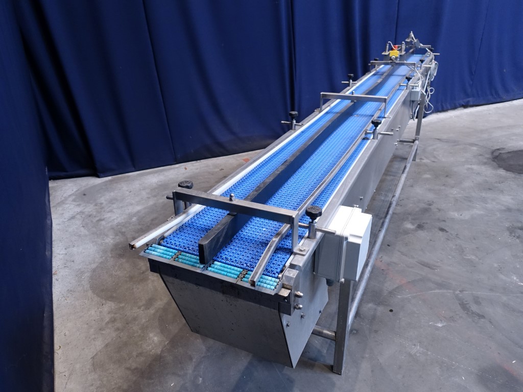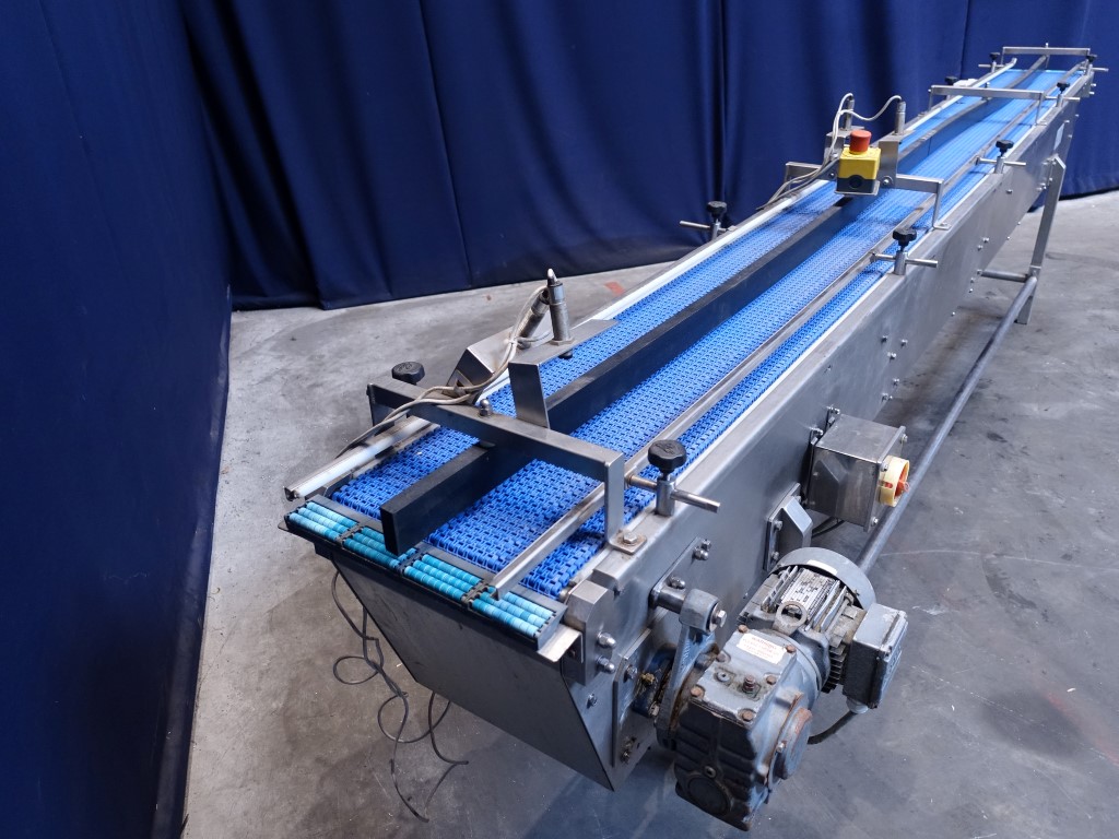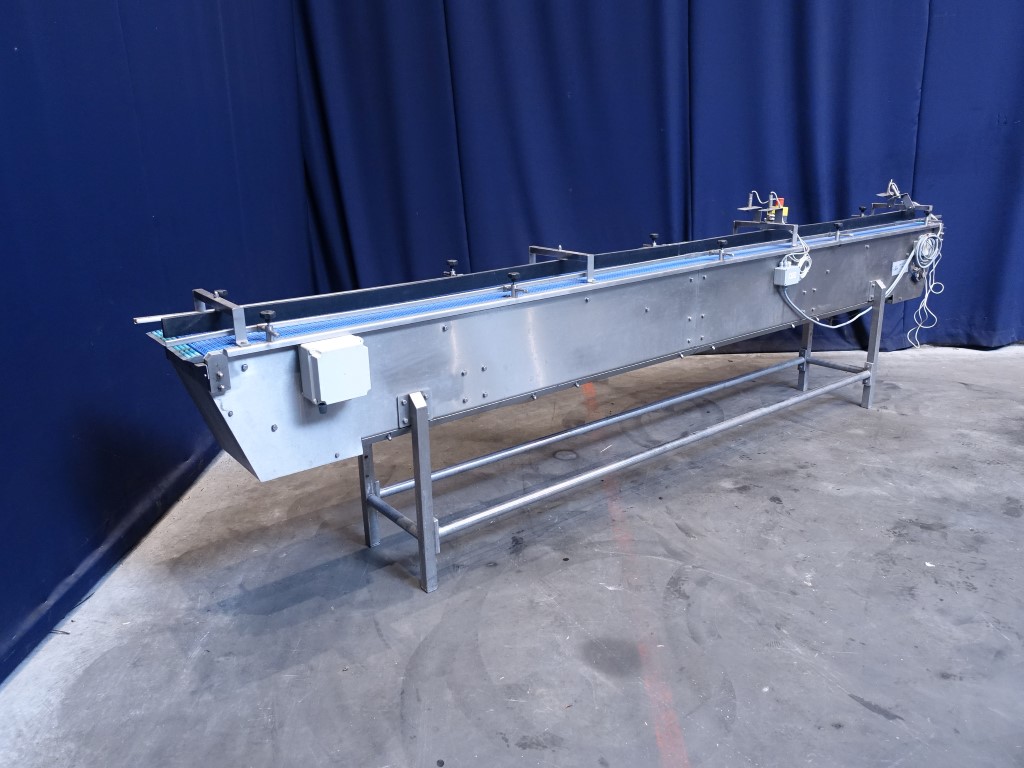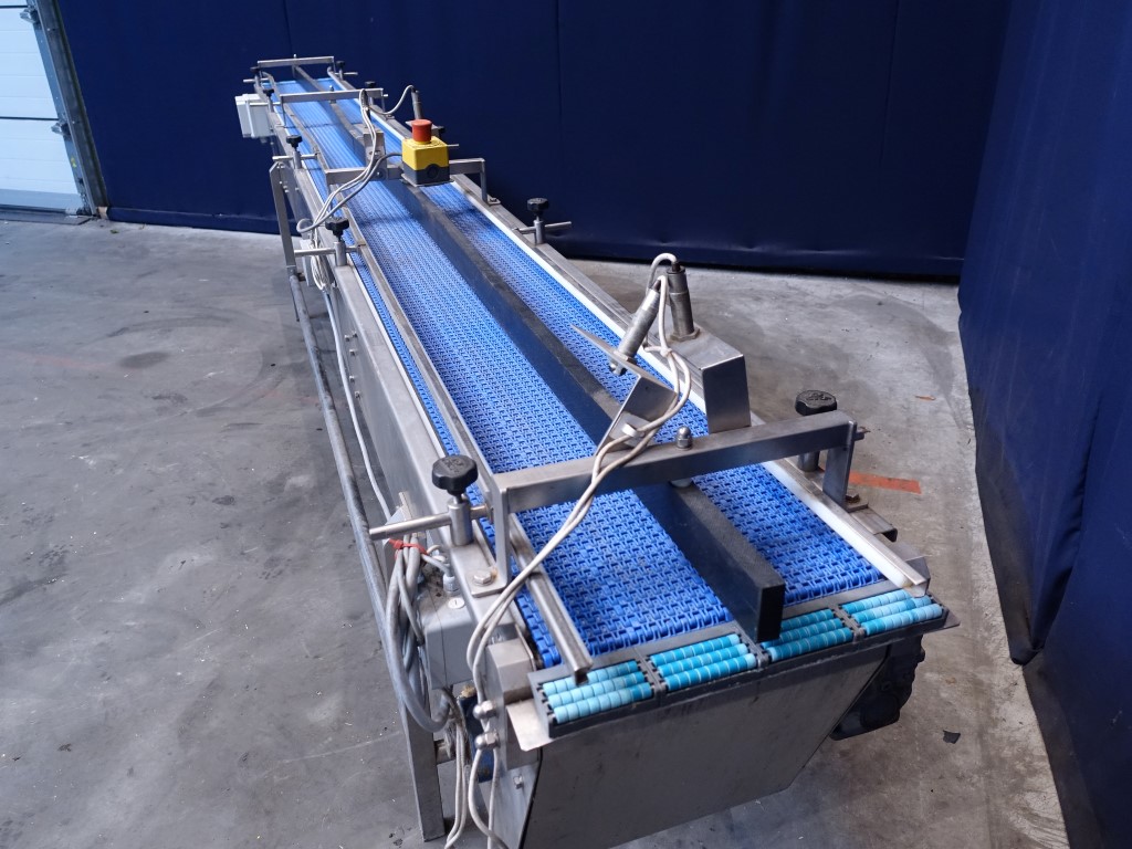 Chain conveyor. Effective belt 390 x 30 cm. Motor: 0,37 KW - 1380 rpm. Horizontal. Total Dimensions: 400 x70 x 120 cm. Was running together with Benhill filler and packer (STN13465+STN13466)