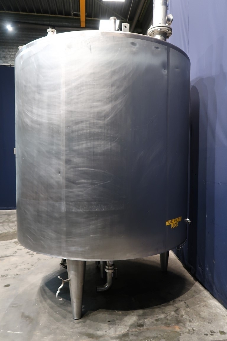 Vertical insulated cip tank. Previously used for lye. Nominal volume: 10.000 liter. Multiple connections in top and bottom. 2x Manual buttefly valves on outlet. With sample valve. 1 x Sight glass in top. 1 x E&H electronic pressure sensor/transmitter. 1 CIP spray bowl. Manhole in top, round Ø 47 cm. 3 Adjustable feet with with extension legs. Inside dimensions of tank: Ø 230 cm and cilindrical height 230 cm. interior needs cleaning. Total dimensions: Ø ca. 240 cm x h. 370 cm (without extension legs).