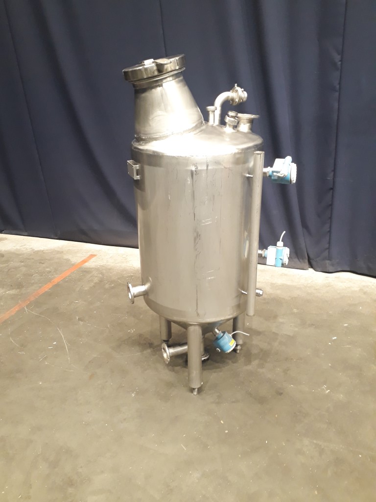 Closed vertical level tank. Pressure in tank atmospherique. Conical bottom. Product outlet 2'' DIN, outlet height: 10 cm. Connections for: PT-100 temp sensor, low level. 1 CIP spray bowl. Manhole in top, round diameter 200 mm. 3 Adjustable feet. Inside dimensions: Ø 580 mm and height 850 mm. Total dimensions: Ø 80 x 165 cm.