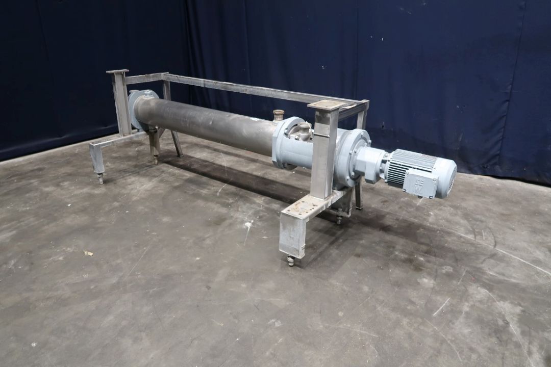 Scraped surface heatexchanger with 1 product cylinder, in stainless steel, tube diameter: 165 mm, length 1,830 mm. Rotor with 4 scrapers. Surface per tube 0,84 m² and volume per tube 40 ltr. Pressure: 150 psi (10 bar). Temperature: 400 °F (200 °C). Drive motor: 10 kW. Previous used for heating/cooling of food products (sauces/concentrate). On a stainless steel frame. Total dimensions: 310 x 110 x 90 cm. STN14965 was orginally mounted on top of this machine.