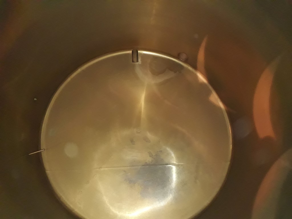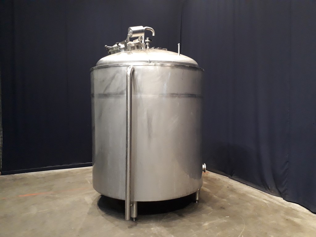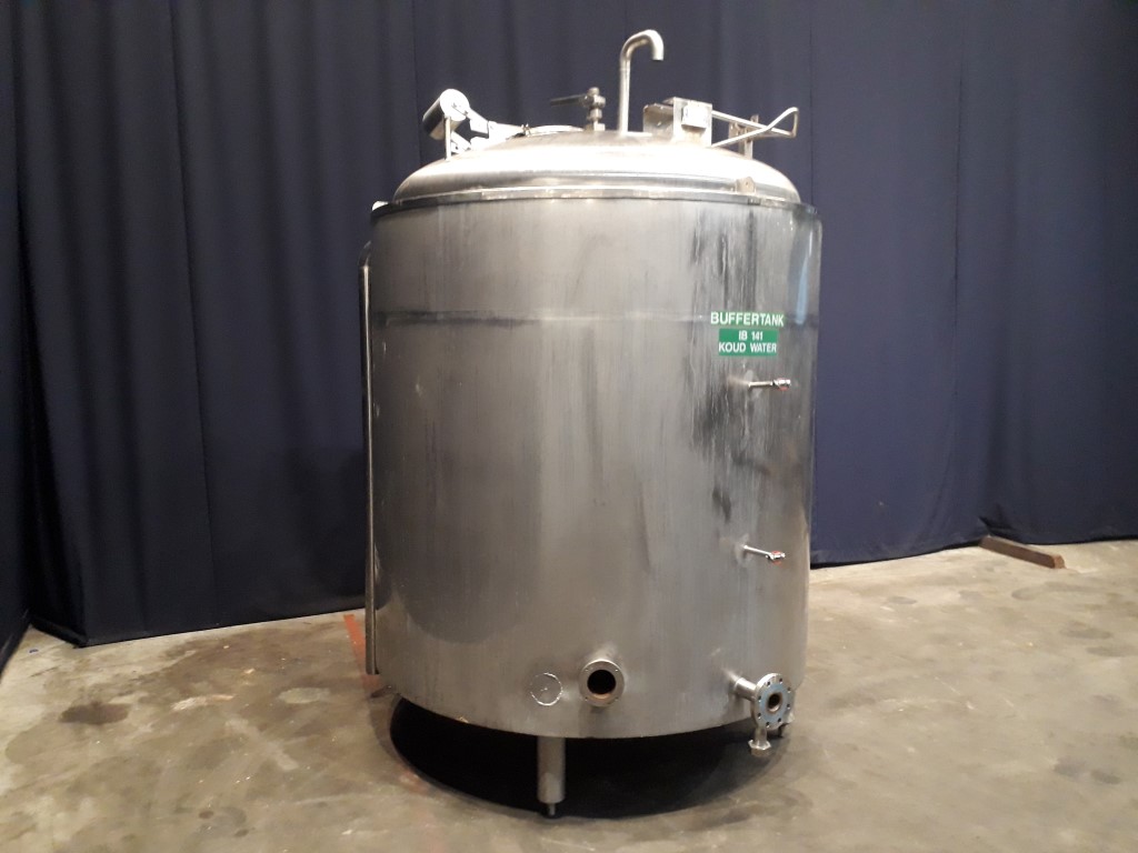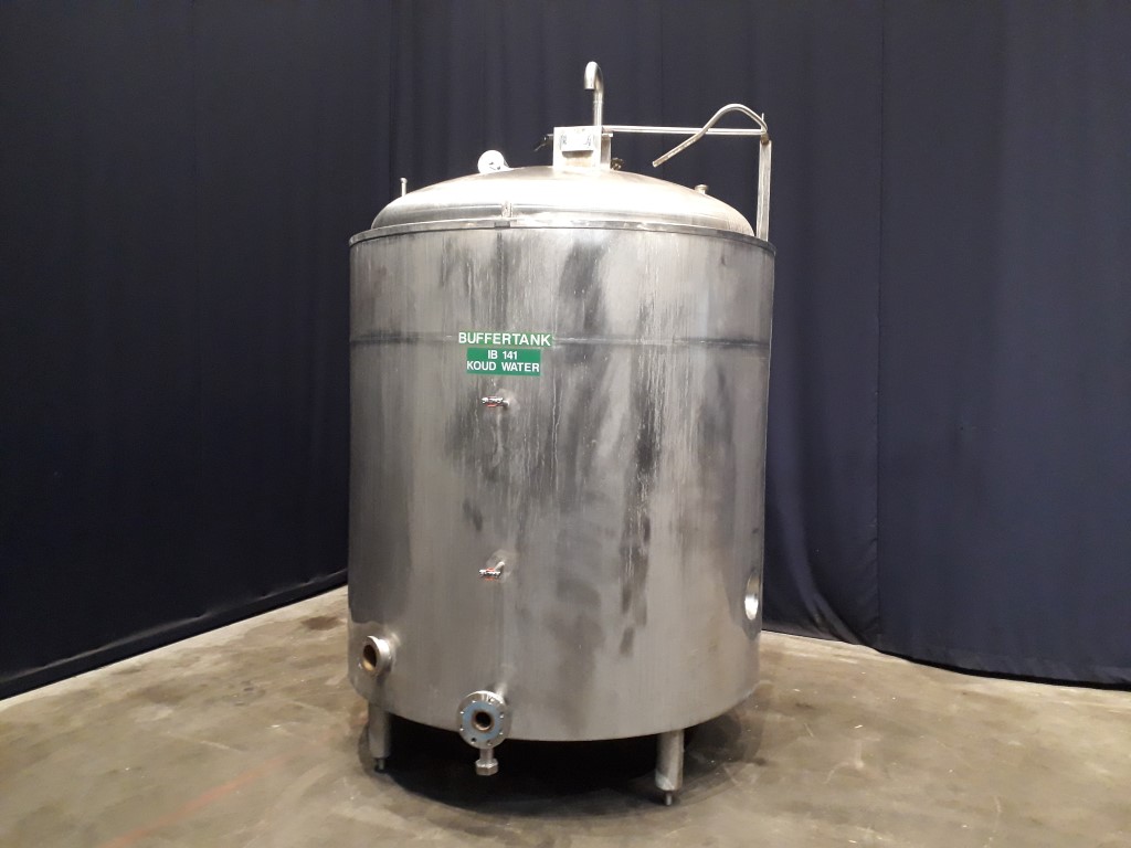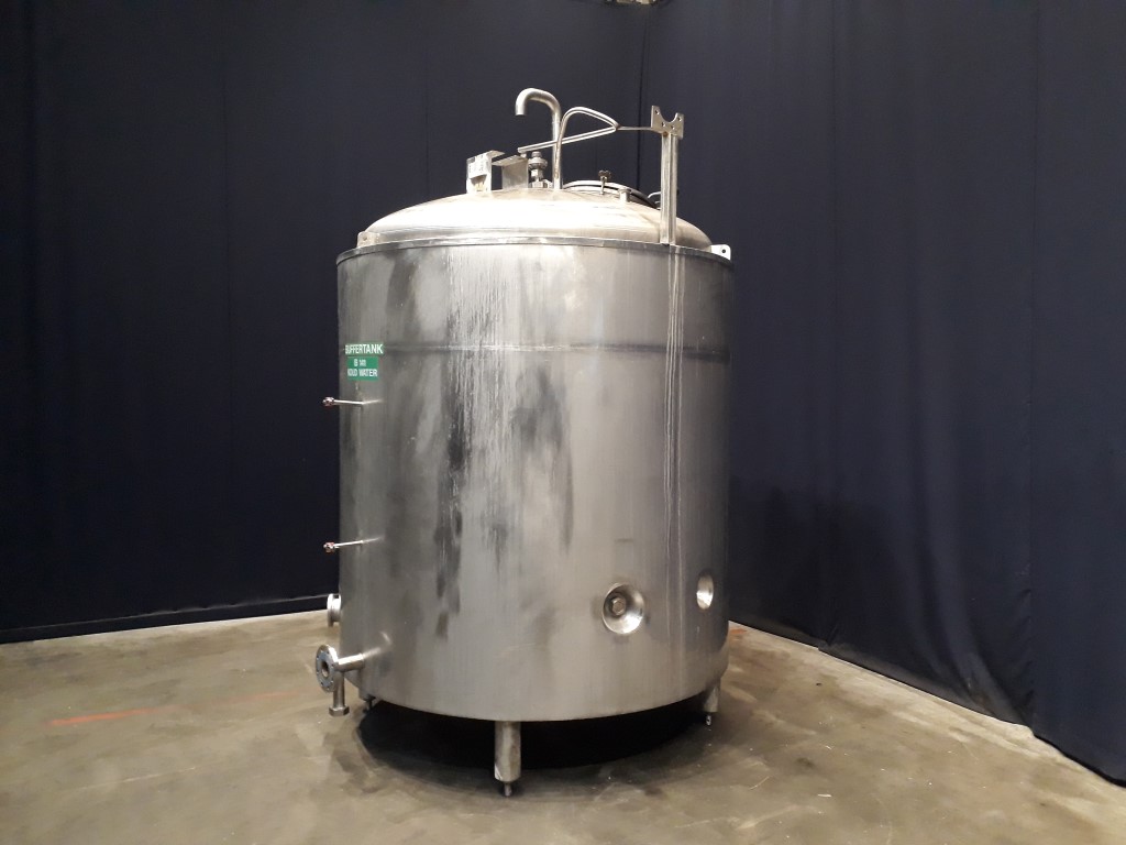 Vertical buffer tank, insulated side and bottom. Pressure in tank atmospherique. 2 Product outlets to the side, product outlet DN80 flange, outlet height: 47 cm, second product outlet DN100, flange, Outlet height: 52 cm. Connection for PT-100 temperature sensor. 1 Rotary CIP spray bowl. Manhole in top, round, diameter 500 mm, with counter weight for easy opening. 4 Adjustable feet. Inside dimensions of tank: diameter 175 cm and height 170 cm. Total dimensions: 200 x 200 x 310 cm.