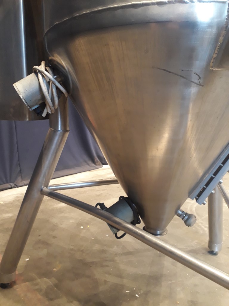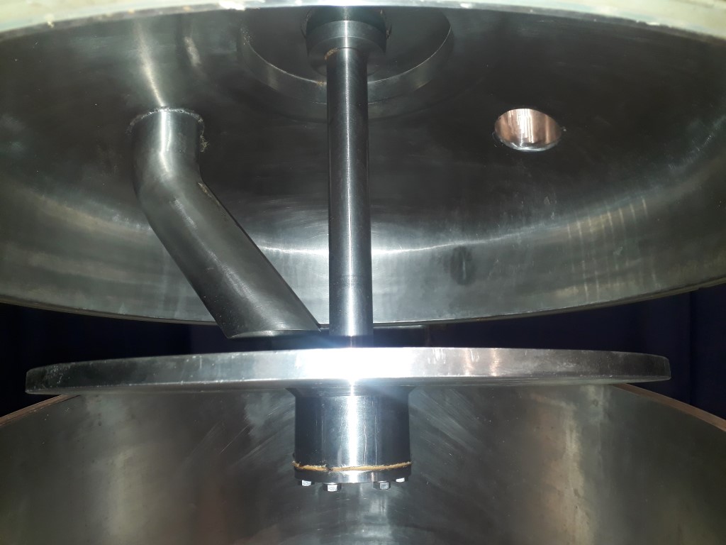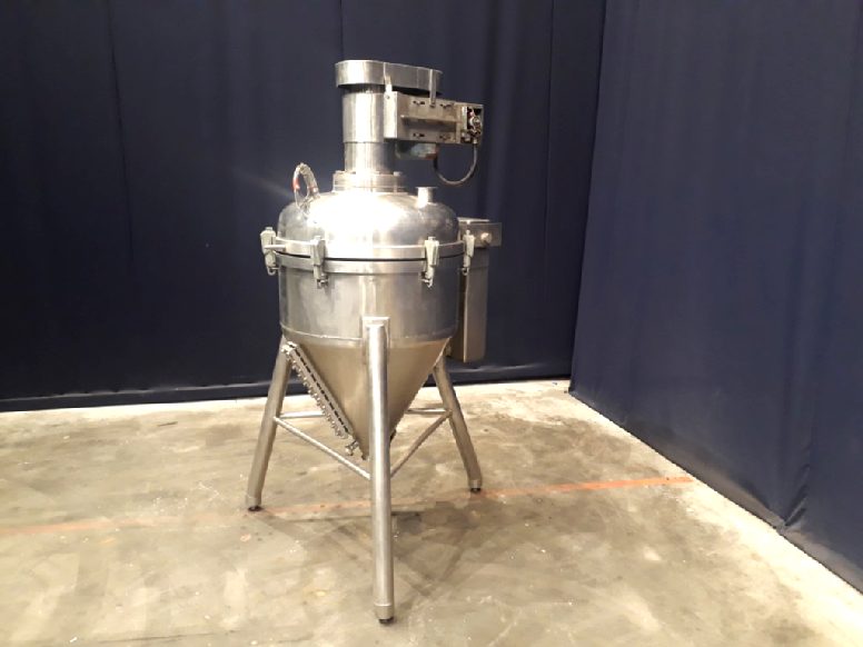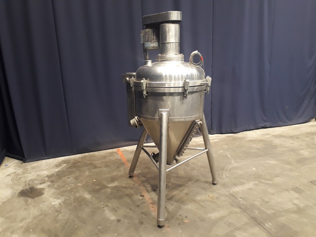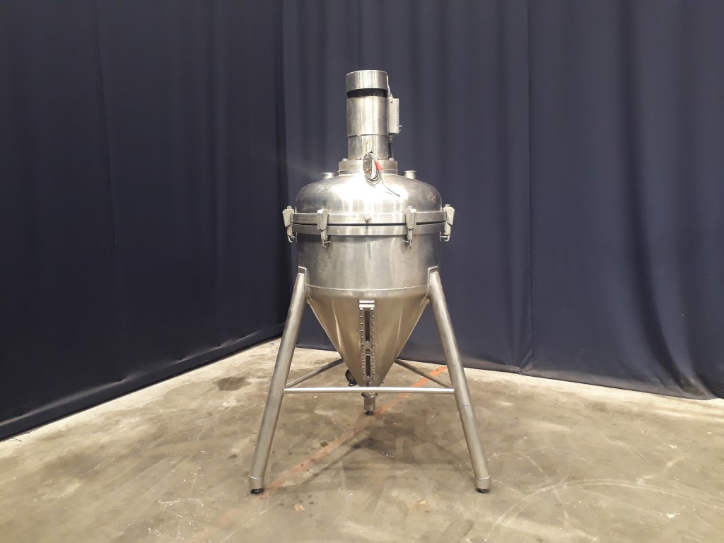 Deaerator for viscose products, Vacuum tank. Recently electrolytic polished inside. Outlet: 3'' Clamp connection. Outlet height: 37 cm. Motor agitator: 1,5 kW. 3 adjustable feet. Total dimensions: 120 x 120 x 210 cm.