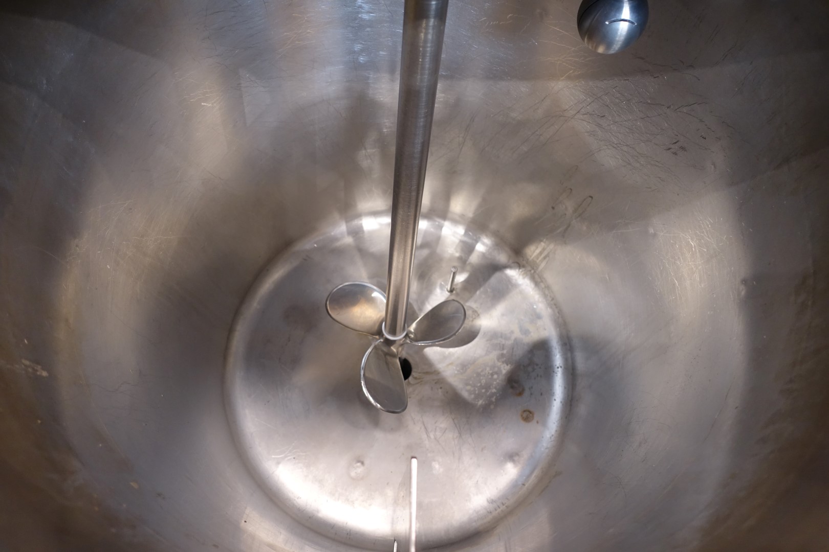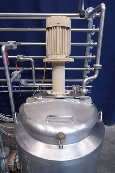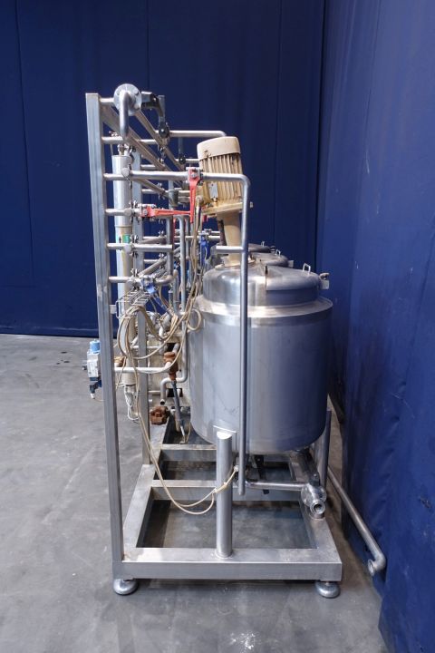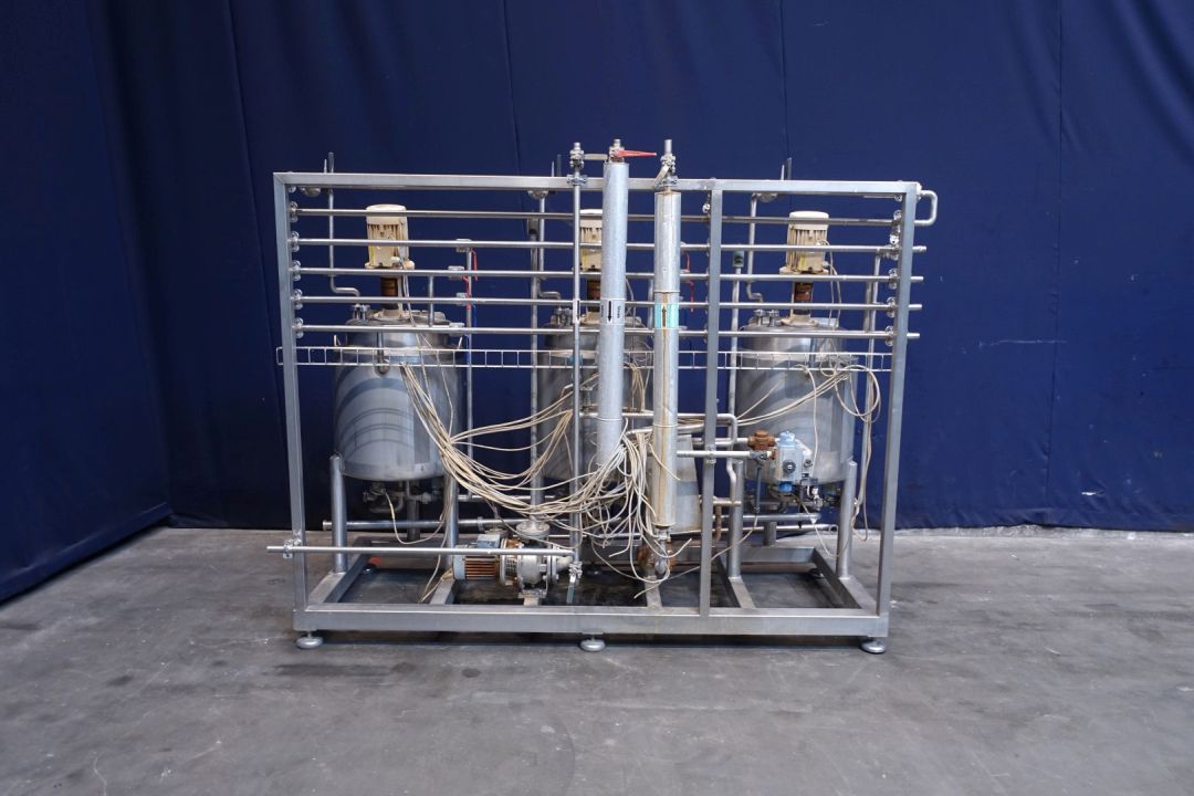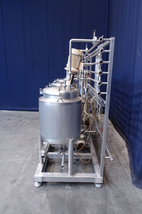 Set double jacketed tanks. eacht tank is heatable or coolable, with circulation set, heatexchanger steam/water and circulation pump of water through the jackets. Volume per tank: 3 x 80 ltr. Inner dimensions per tank Ø 45 cm, 50 cm heigth. Each tank with propellor agitator Ø 20 cm, 1 x cip spray bowl and 1 x temperature sensor in bottom. Connections In: 1" SMS, Out: 1,5" SMS. Manual 3-way valve per tank. Motor agitator: 1,1 kW - 400 V - 3,15 A - 50 Hz - 940 rpm. With Fristam FC32/133F centrifugal pump, motor 1,1 kW - 4-- V - 2,55 A - 2855 rpm. Total outside dimensions: 270 x 130 x 200 cm.