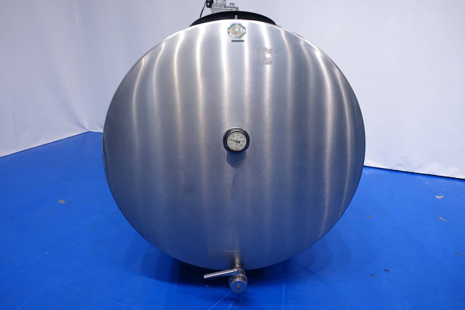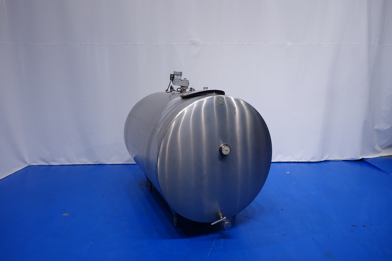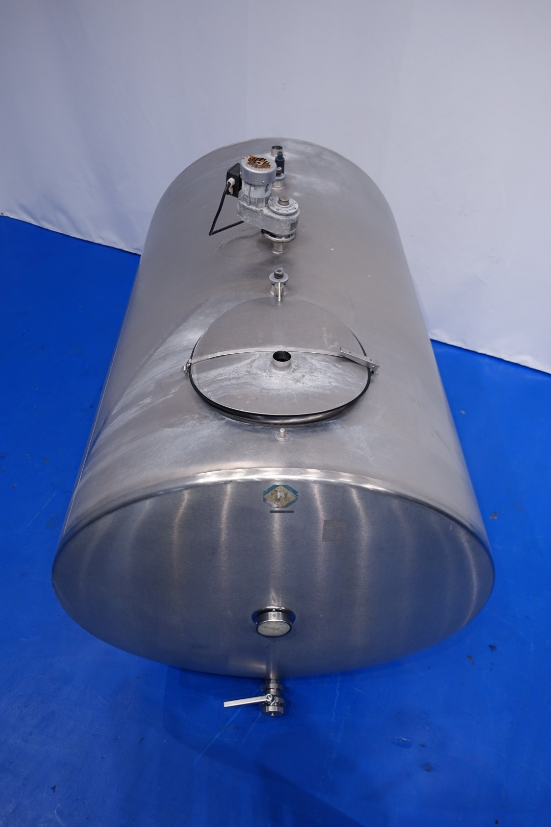 Horizontal former farm tank. Nominal volume: 2.500 liter. Without cooling compressor unit for freon but also Icewater can be connected to the jacket. Top driven propellor, motor: 133 W - n1: 2.800 rpm - n2: 25 rpm. Totally Insulated. Product outlet 2,5" Din with manual butterfly valve and outlet height: ca. 20 cm. 1x temperature gauge. 2 CIP spray bowls. With 1 x measuring rod. Manhole in top, round Ø 44cm. 4 Adjustable feet. Total dimensions: 236x144x187 cm - weight: 394 kg.