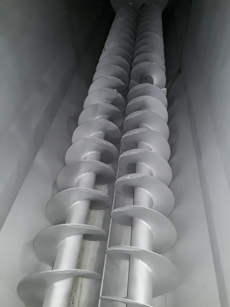 Closed stainless steel butter silo with pneumatic cover. 2 Augers. 1 Motor with reductor. CIP cleanable with spray bowls in silo and at outfeed augers. 4" DIN outfeed for butter pump. Inside measurements of silo: ± 4,0 x 1,0 x 0,9 meter. Includng butter pump, Egli, EBP53 112-147-K, motor: 4 kW - 8,8 A -1420 rpm with variable speed gearbox and CIP return pump, APV, PUMA. Excluding control panel. Total dimensions: 6,0 x 2,0 x 2,5 meter. The butter shredder, STN12639 was standing above the silo, for entering slivers of butter.