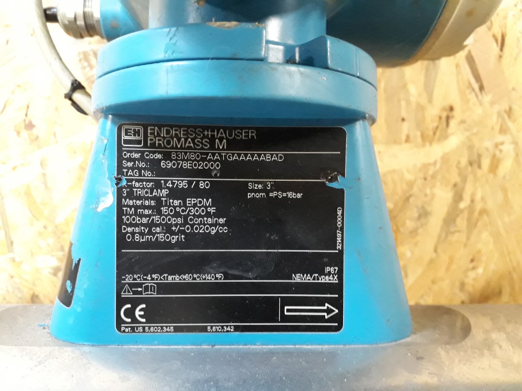 Mass Flow Measuring System (transmitter and sensor) for measuring the mass and volume flow of fluids having widely different characteristics such as condensed milk, oils and fats, acids, chocolate, syrups etc. Connections: 3''. Electronic display. 3'' Tricalmp pnorm = PS = 16 bar. TM: 150 °C. 100 bar Container. Materials: Titan EPDM. IP67.