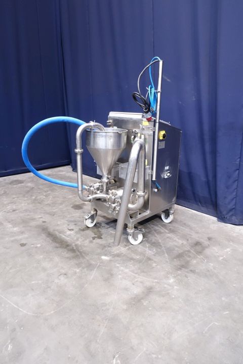 Dosing unit. a skid mounted unit with 2 pumps, 1 pump pumping the product in the hopper and 1 pump dosing the product. 1-Line. Existing out of: 2x duo lobe pumps with stainless steel lobes. (1st: Waukesha, type: 018-U1, year: 2010, serialnr 1000002455977, diameter lobbes: 85 mm, displacement per revolution: 0,12 ltr, nominal capacity: 7,5 m3/h, current drivework: servo driven: SEW Eurodrive, Movidrive, MDX61B0030-5A3-4-00, connections: DN40/DN40 SMS. 2nd: Waukesha, type 030, year: 2007, serialnr: 450679, diameter lobbes: 110 mm, displacement per revolution: 0,27 ltr, nominal capacity 15,9 m3/h, current drivework: motor 1,1 kW - n1: 2850 rpm, i: 9,09 - n2: 314 rpm, connections: DN40/DN40 SMS), hopper and control panel with operation panel. Total dimensions: 150 x 125 x 185 cm.