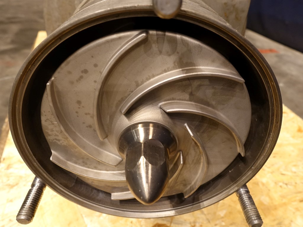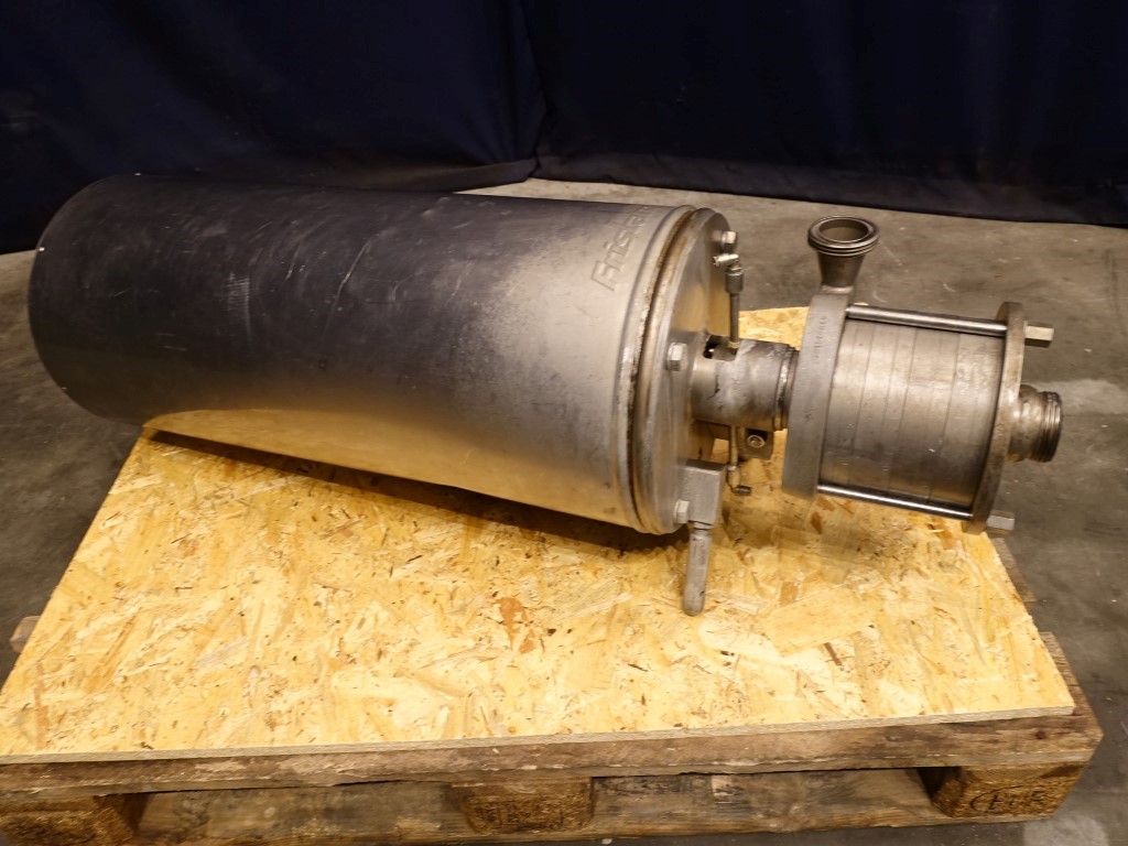 Sanitary centrifugal pump. Current motor: 11 kW - 21,8 A -2910 rpm - 60 hz. 5 Stages. High pressure. Impellor diameter: 160 mm. Flushed seal. Connections: 2'' / 2'', SMS.