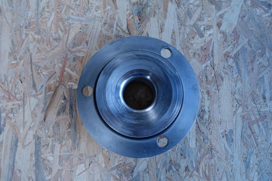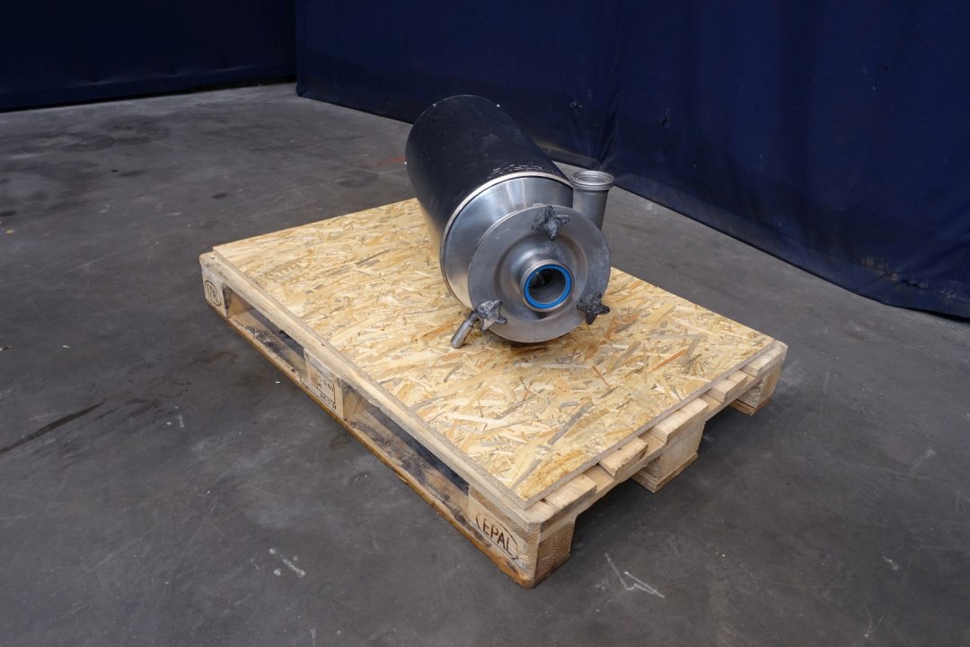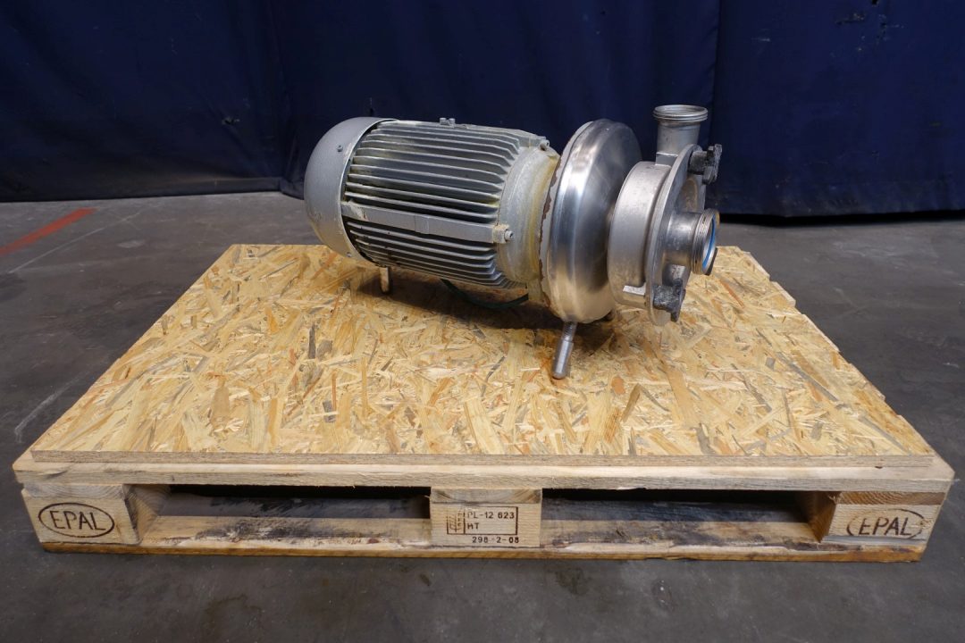 Sanitary centrifugal pump. Current motor: 7,5 kW - 13,5 A - 2.900 rpm. Impellor diameter: 165 mm. Connections: (in) 3" Din / (out) 2,5" Din. Dimensions: 72x30x37 (lxwxh) cm, weight: 146 kg. Slight damage on impellor