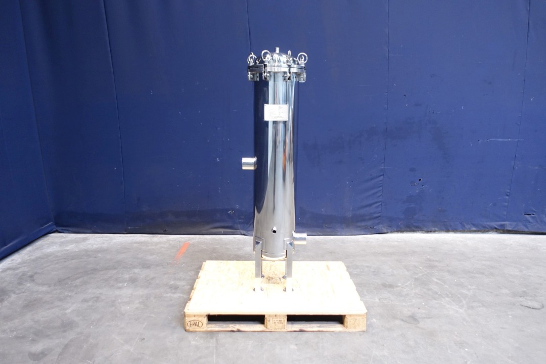 Vertical filter housing, unused, in original packaging. Including insert with a diameter of 43,18 mm per hole. Length filter house 108 cm. Sanitairy for liquids. Volume: 84 Ltr. Connections 2x 83 mm pipe and 3x 26 mm pipe. Only housing, excluding filters. Dimensions: 45x45x168 (lxwxh) cm - weight 91 kg.