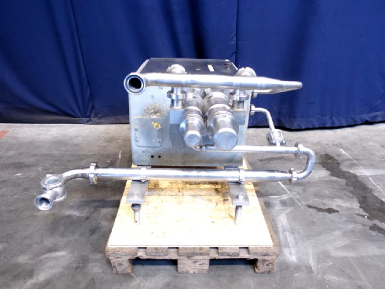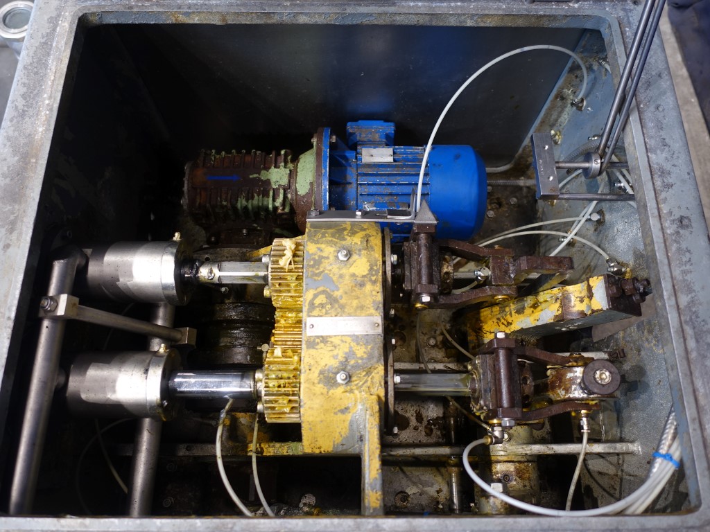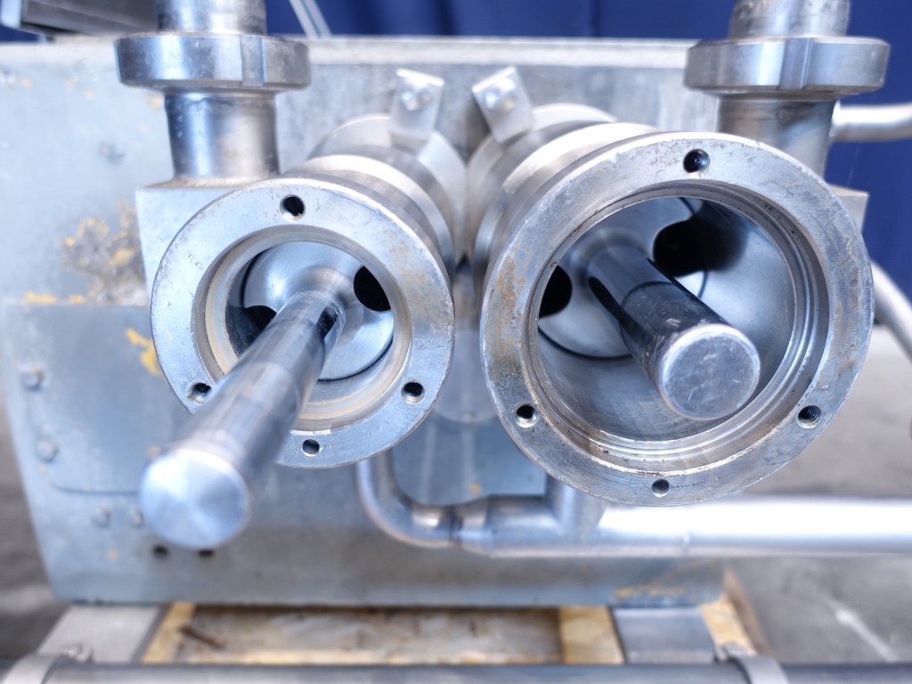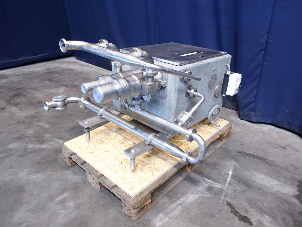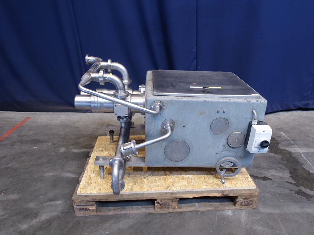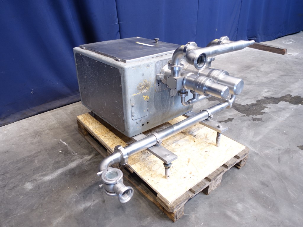Yoghurt / Fruit mixing unit. Mechanical driven piston pump for automatic injection of fruitpulp to a stirred yoghurt or quark. 2 Different sizes of piston dosers. #01: piston diameter 89 mm, stroke 85 mm, volume ± 500 cc. #2: piston diameter 55 mm, stroke adjustable max 85 mm, max volume: ± 200 cc. 1 Drive shaft make a syngronic dosing of yoghurt and pulp even if speed is variable. No frequency converter or flowtransmitters needed. CIP cleanable. Motor power: 1,3 kW - 2,5 A - 3.400 rpm. Connections: 2'' DIN. Total dimensions: 140 x 120 x 80 cm.