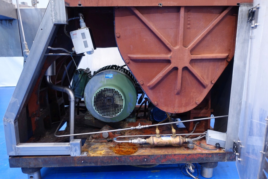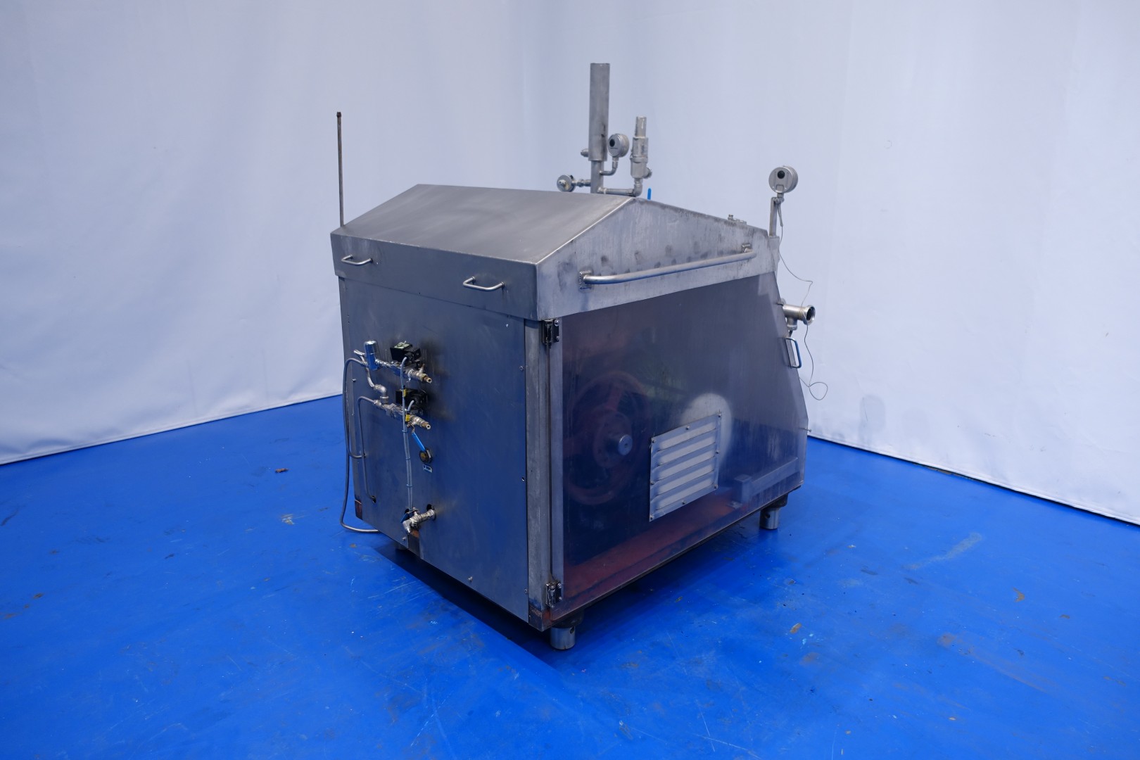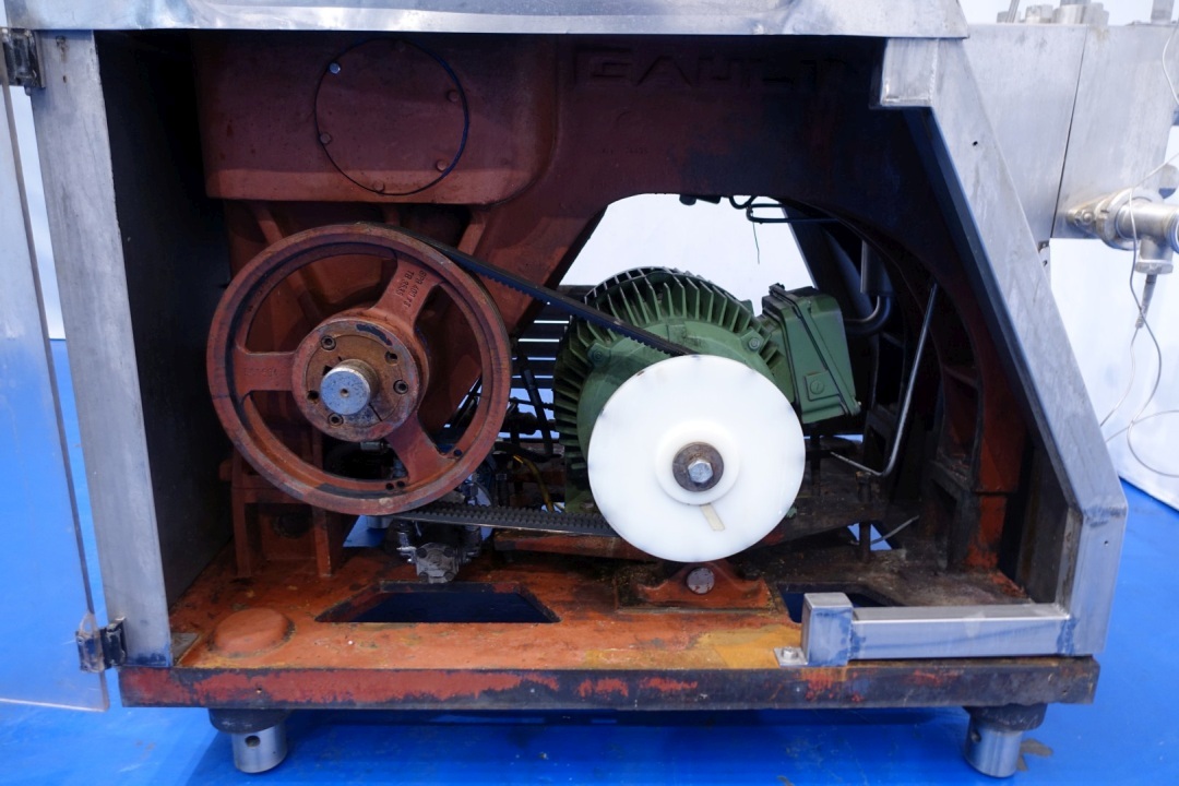High pressure homogeniser. 1 stage with manual pressure control. 3 Pistons, piston diameter: (1-15/16') 50 mm. Connections: 2 Din. Current motor power: 30 KW - 57 A - 1.465 rpm - 50 Hz and maximum pressure in current confirguration with this motor 250 bar. With overpressure valve. Manometer on in and outlet. With electronic pressure transmitter. Flowswitch on cooling water. Total dimensions: 165x148x182 (lxwxh) cm - weight: 2.300 kg.