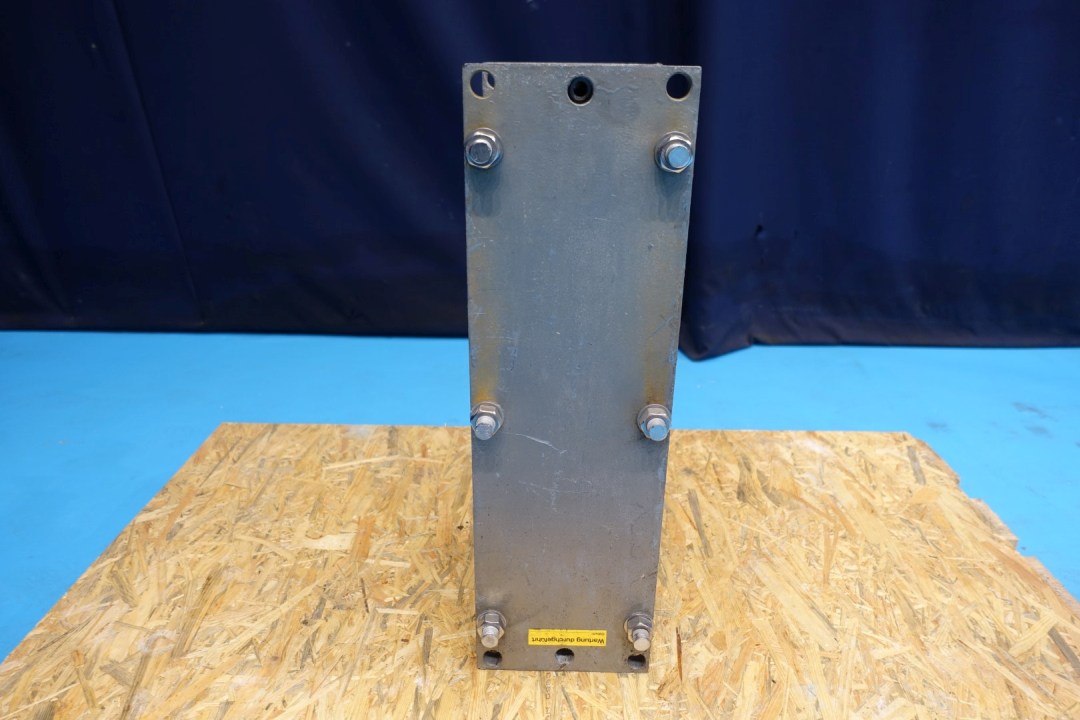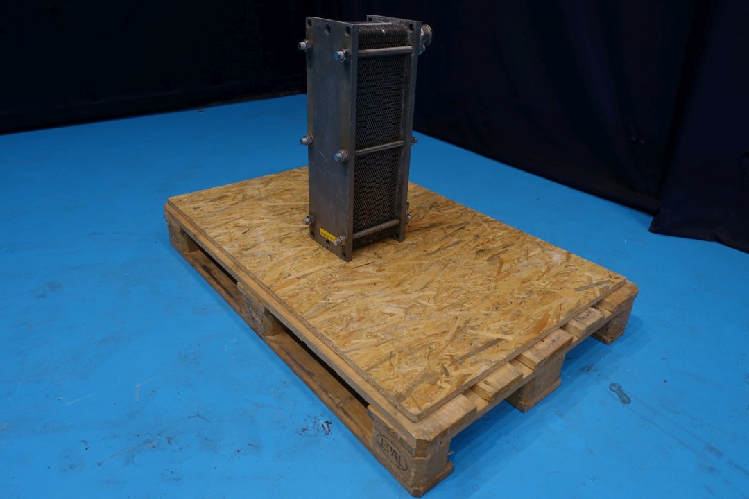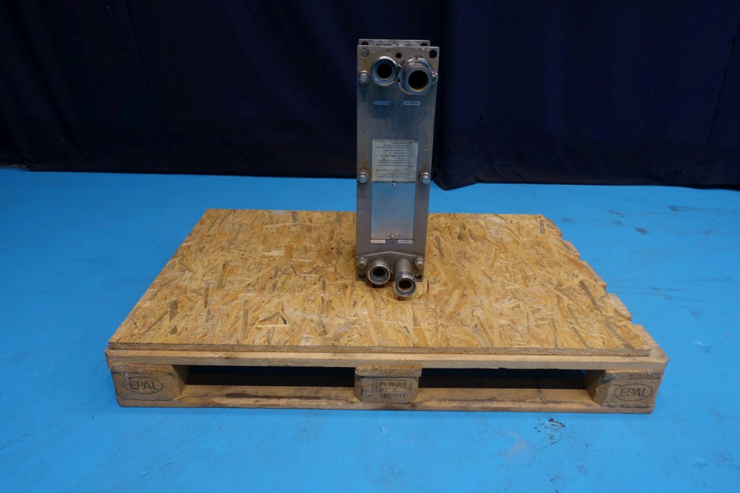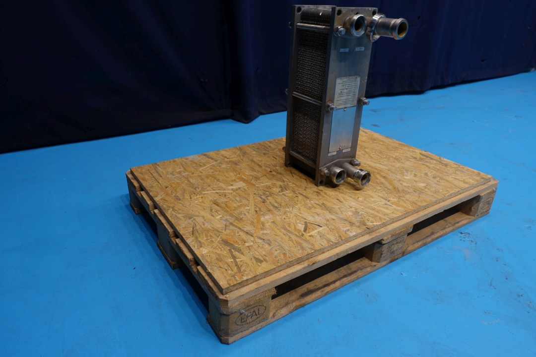 Plate heat exchanger, sanitary (PHE). Max working pressure: 6 bar. Beam length: 165 cm, connections: 4x2" Din. Current configuration: 1 Section: 50 plates. Connections follower: 2 up/2 down. Dimensions: 38x17,5x57 cm - weight: 49 kg.