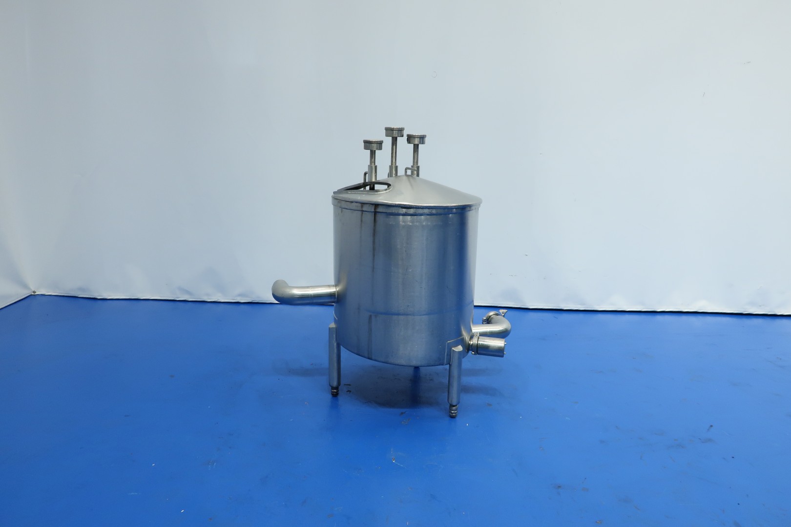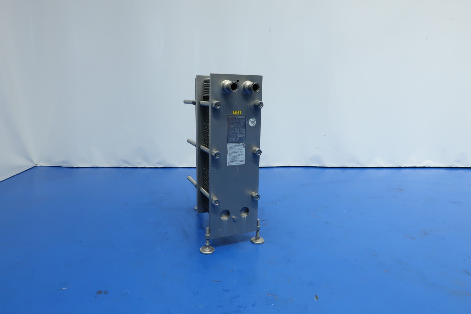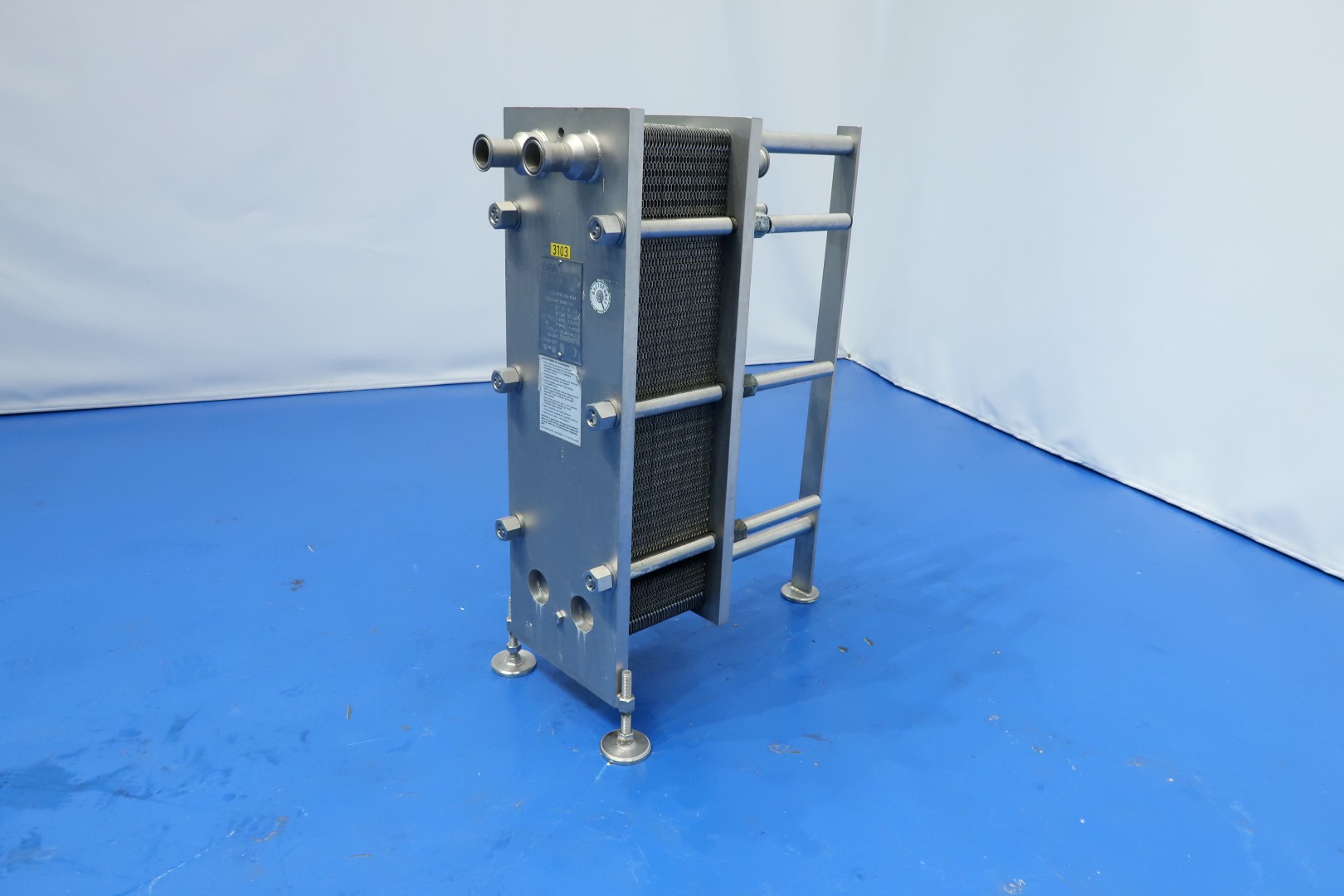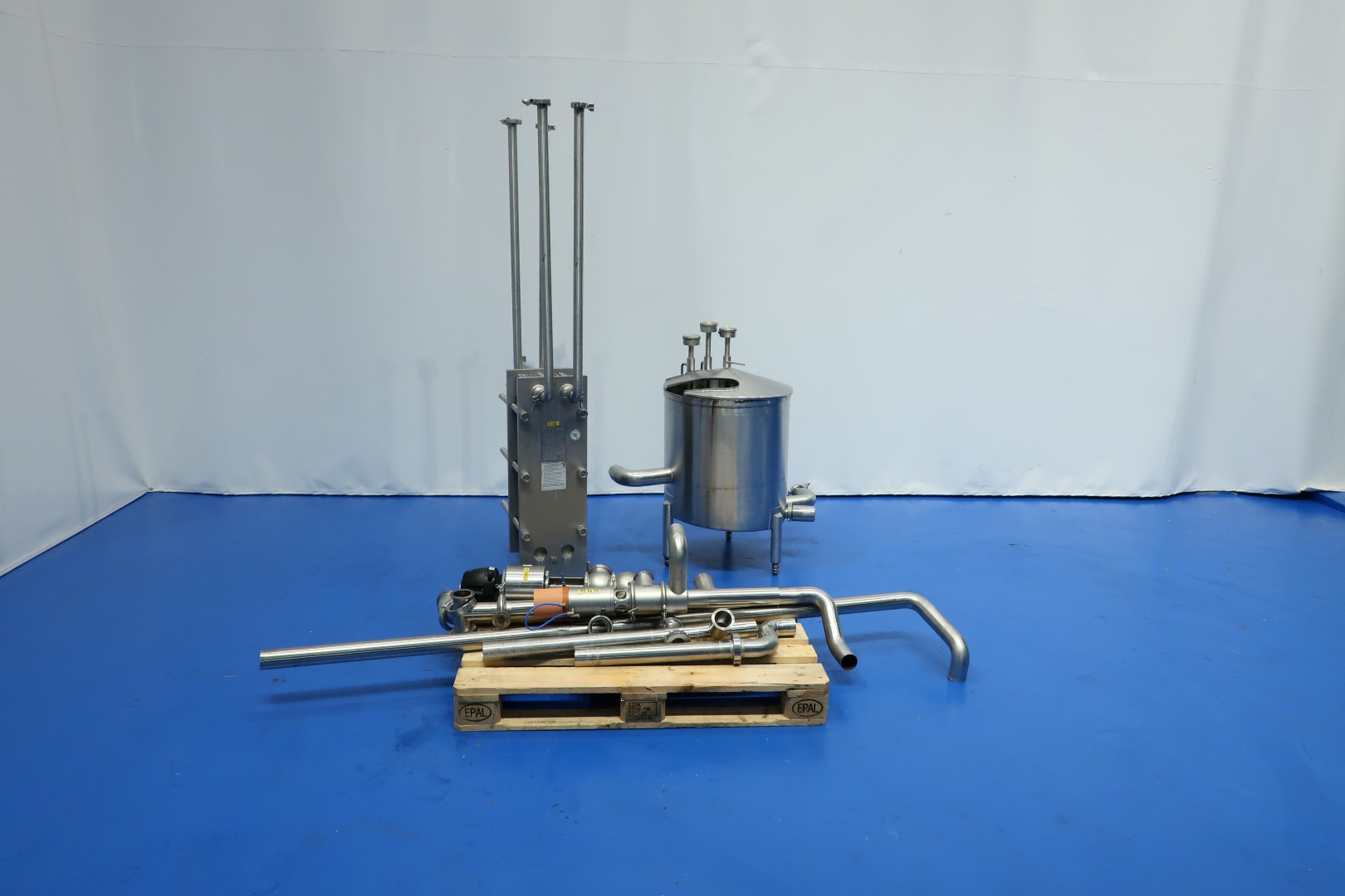 Plate heat exchanger, sanitary (PHE). Max working pressure: 6 bar - max working temperature: 100 ­°C. Beam length: 62 cm, connections: 4x 1,5" Tryclamp. Current configuration: 1 Sections: 61 plates - Connections head: 2 up, follower 2 up. Originally used as cream cooler ± 55 -> 4°C at 1,500ltr/h but can also be used for other liquid products with different flow/temperatures capacity approx 75kW. With balance vessel (ca. 160 ltr.) with level sensors, valves and piping.
