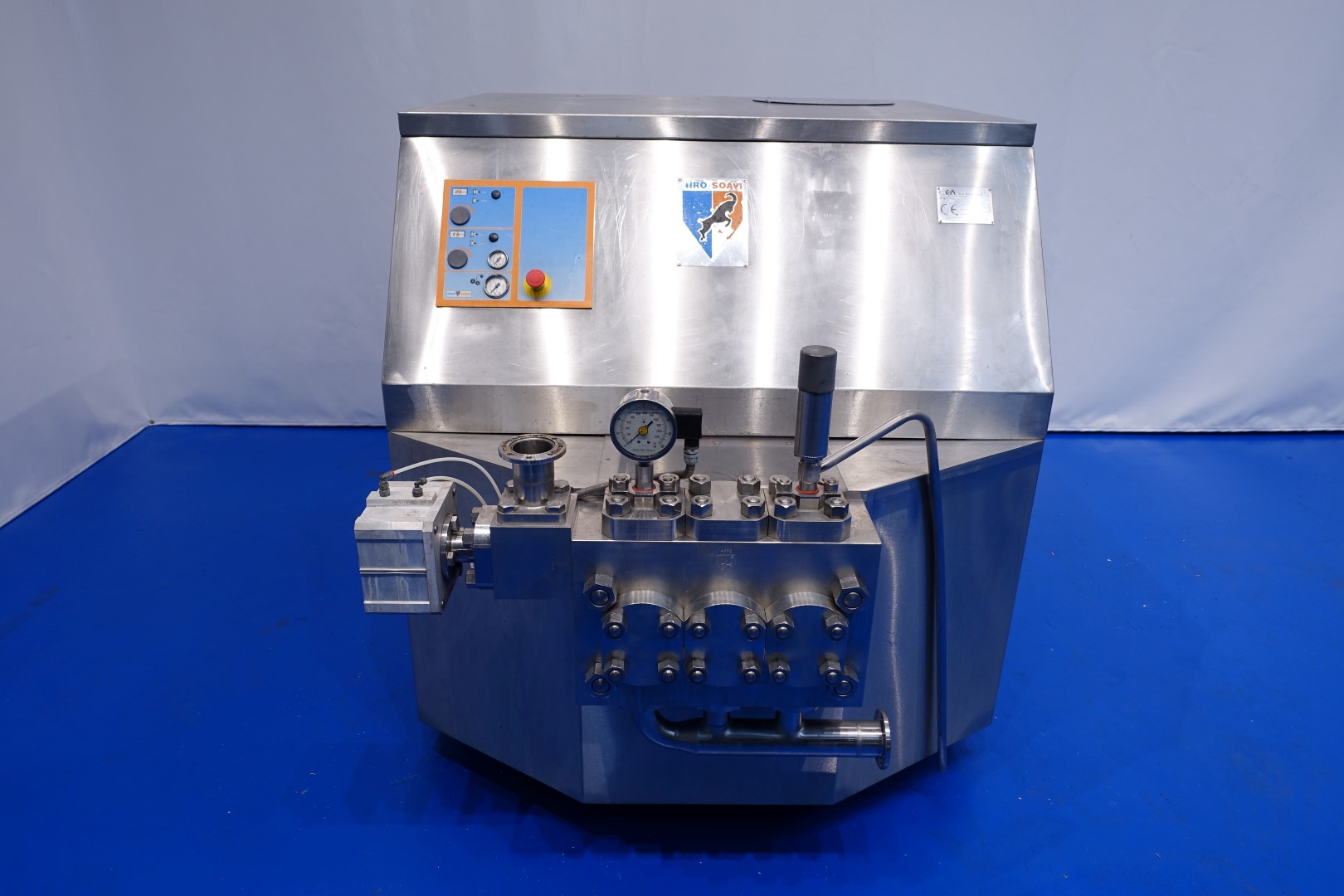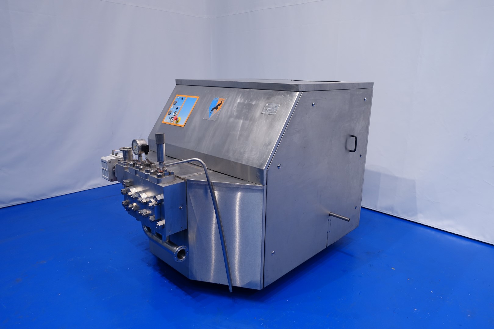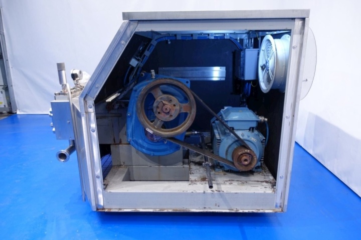 Single stage high pressure homogeniser. 1 stage with automatic pneumatic remote pressure control. Piston diameter: 50 mm. Current motor power: 30 kW - 59 A - 1.479 rpm - 50 Hz. Main motor. Maximum pressure in current confirguration with this motor 100 bar. but by motor pouly change 4,000ltr/h at 220bar is possible. With overpressure valve. Manometer with electronic signal. Flowswitch on cooling water. Oil-levelgauge. Oil pump 0,55 kW. Connections: 2 x DN65 Try clamp. Total dimensions: 200x160x150 cm (lxwxh) - 1.998 kg. Excluding (remote control panel).