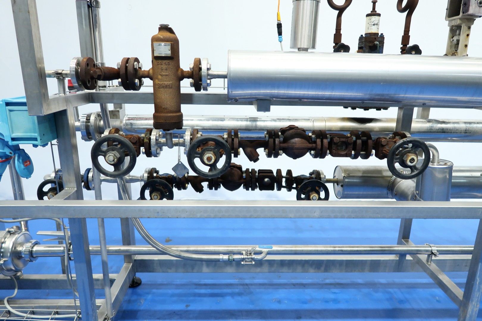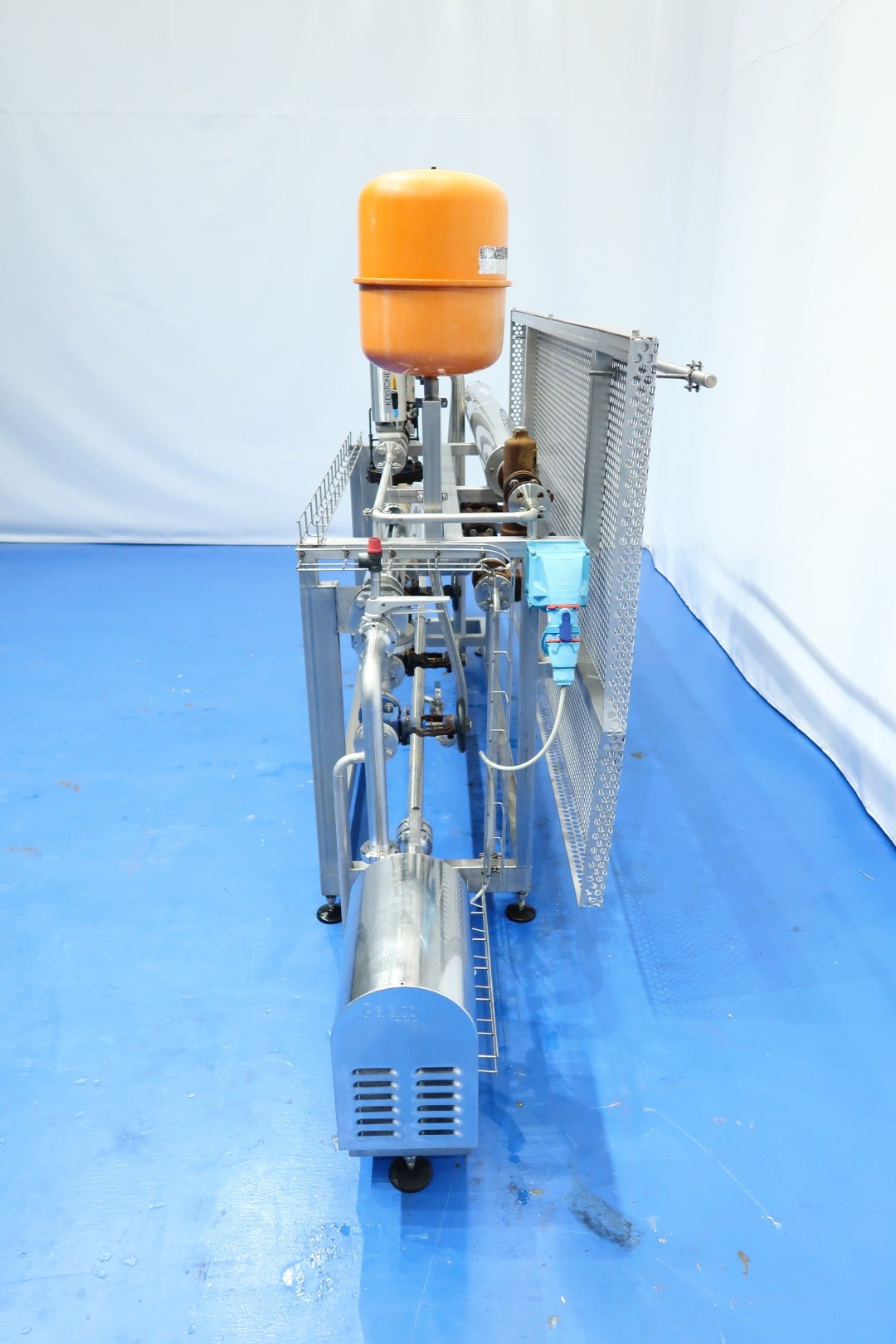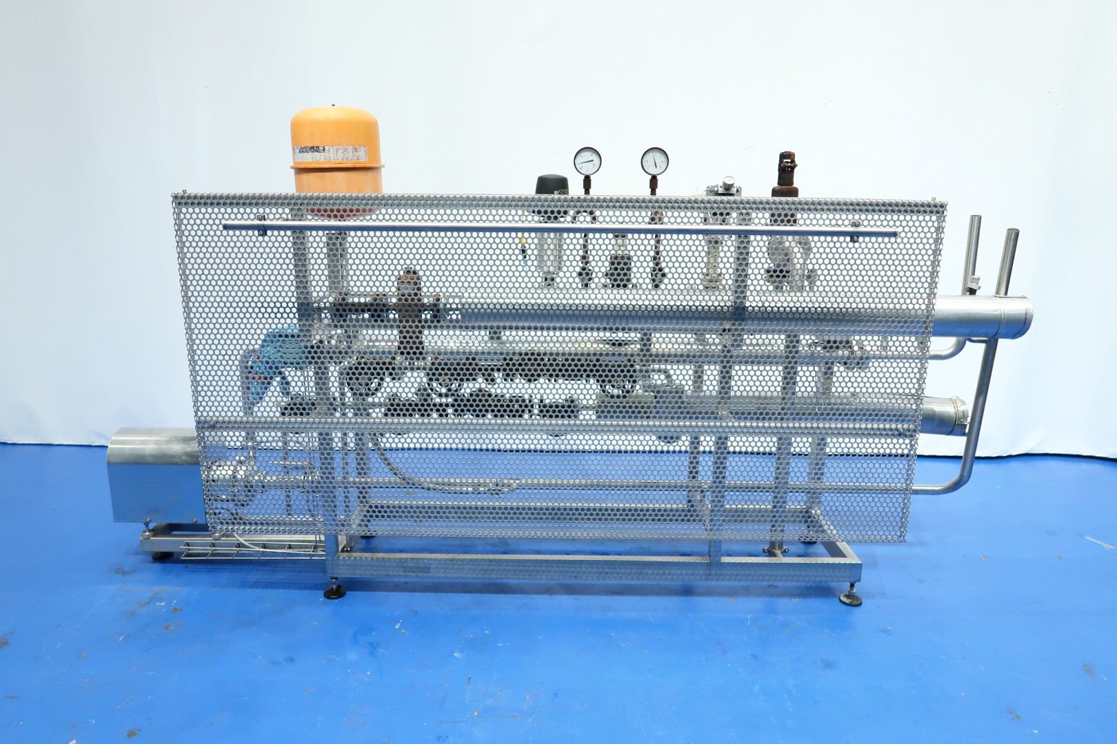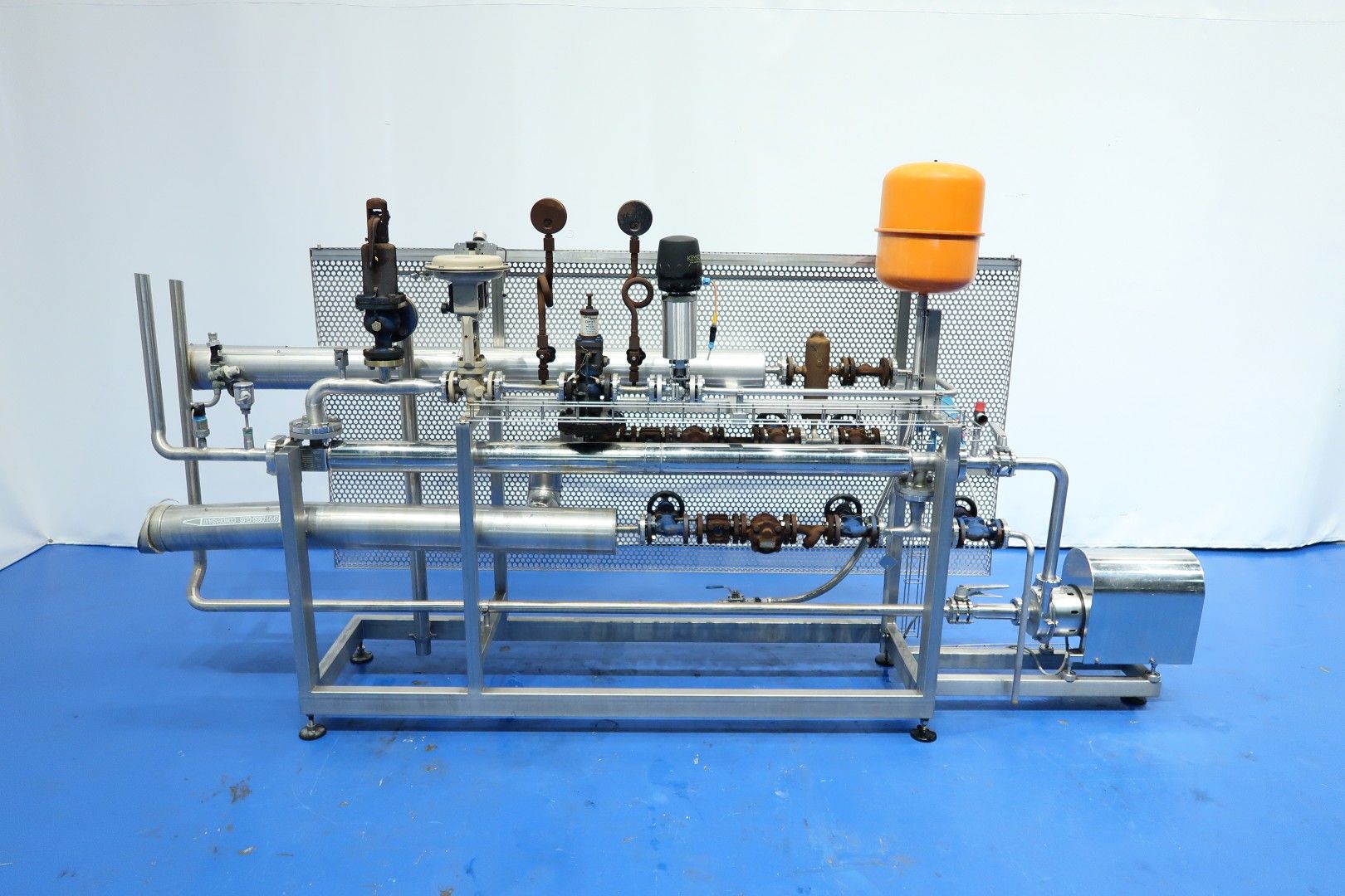 Steam street built on SS frame with safety heat shielding (perforated SS plate). Including: steel pressure vessel, GEA THE, several steamvalves (also Samson), overpressure safety valve, pressure manometers and Packo centrifugal pump (type: ICP4/32-125/082, build in 2011 - serial nr. 93355 - capacity 2.000 ltr/h.). GEA THE (built by TDS-Ahaus) - capacity inside: 23 bar - 150°C - 1,6 ltr. outside: 12 bar - 190°C - 3,5 ltr. Total dimensions: 335x68x173 (lxwxh) cm - weight 258 kg.