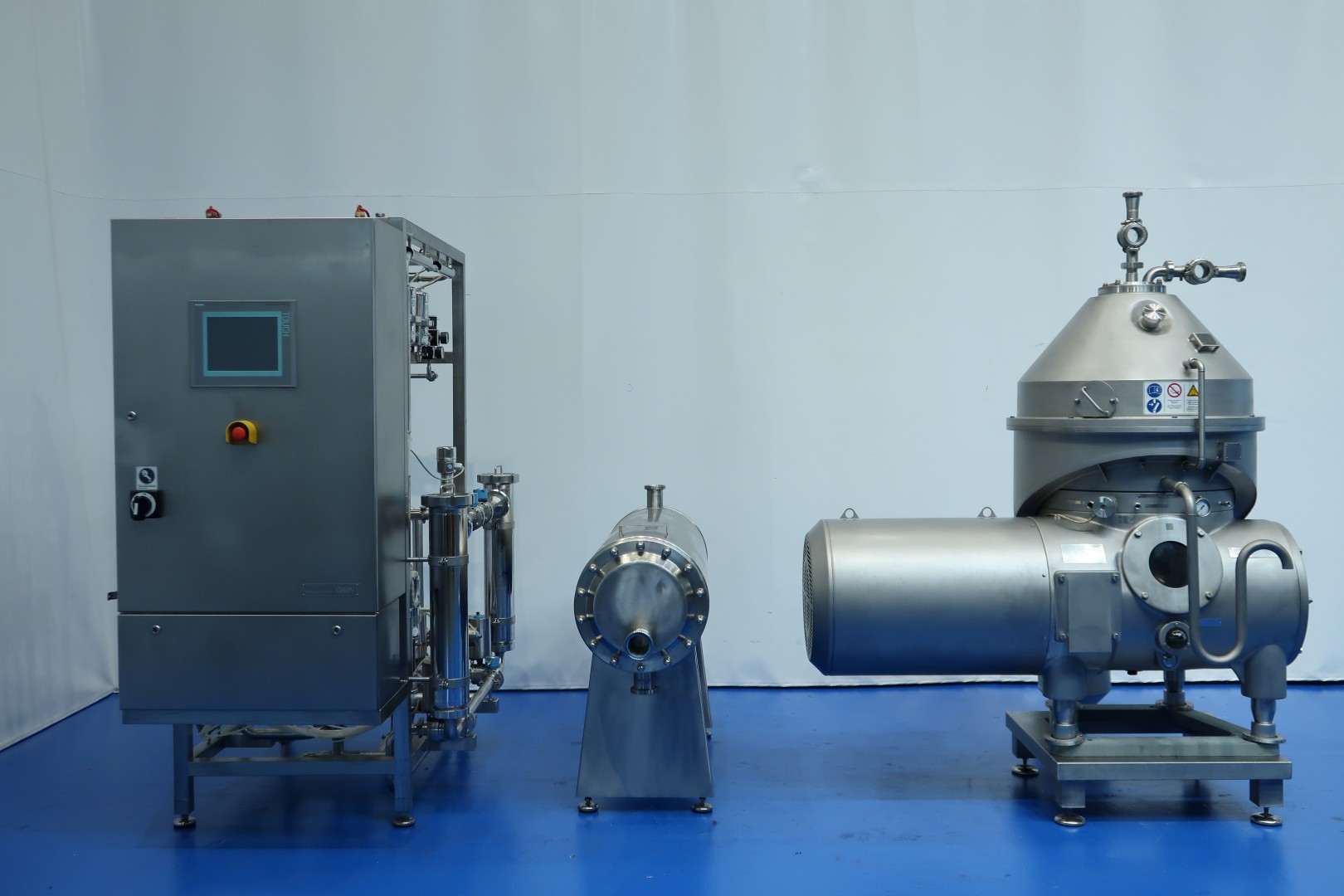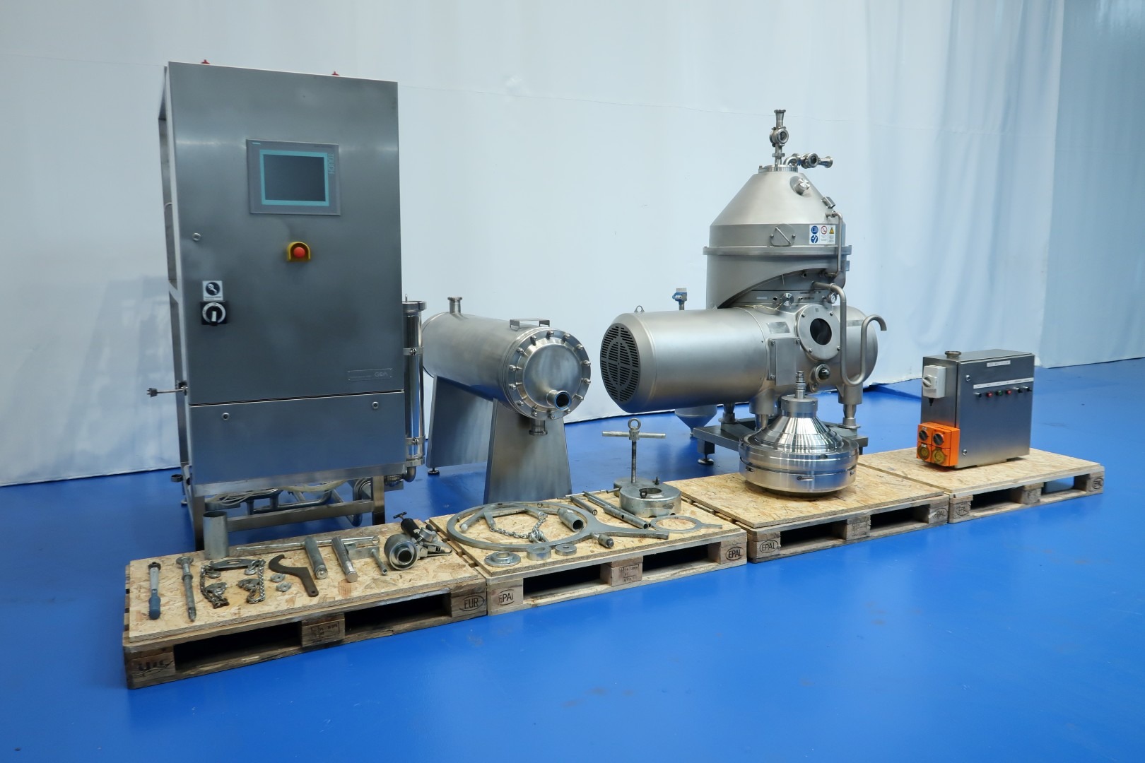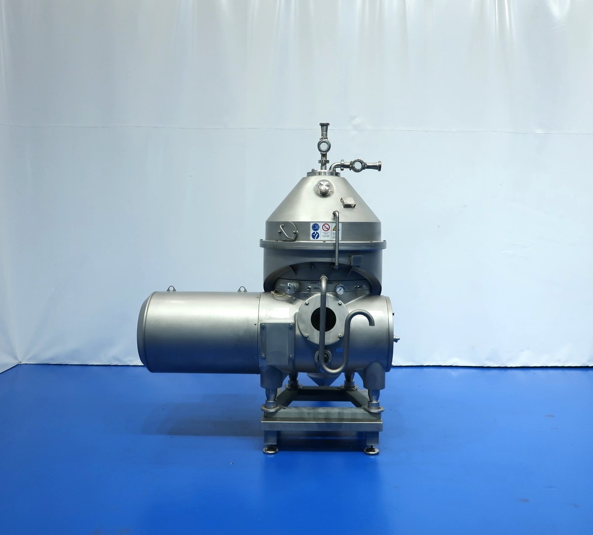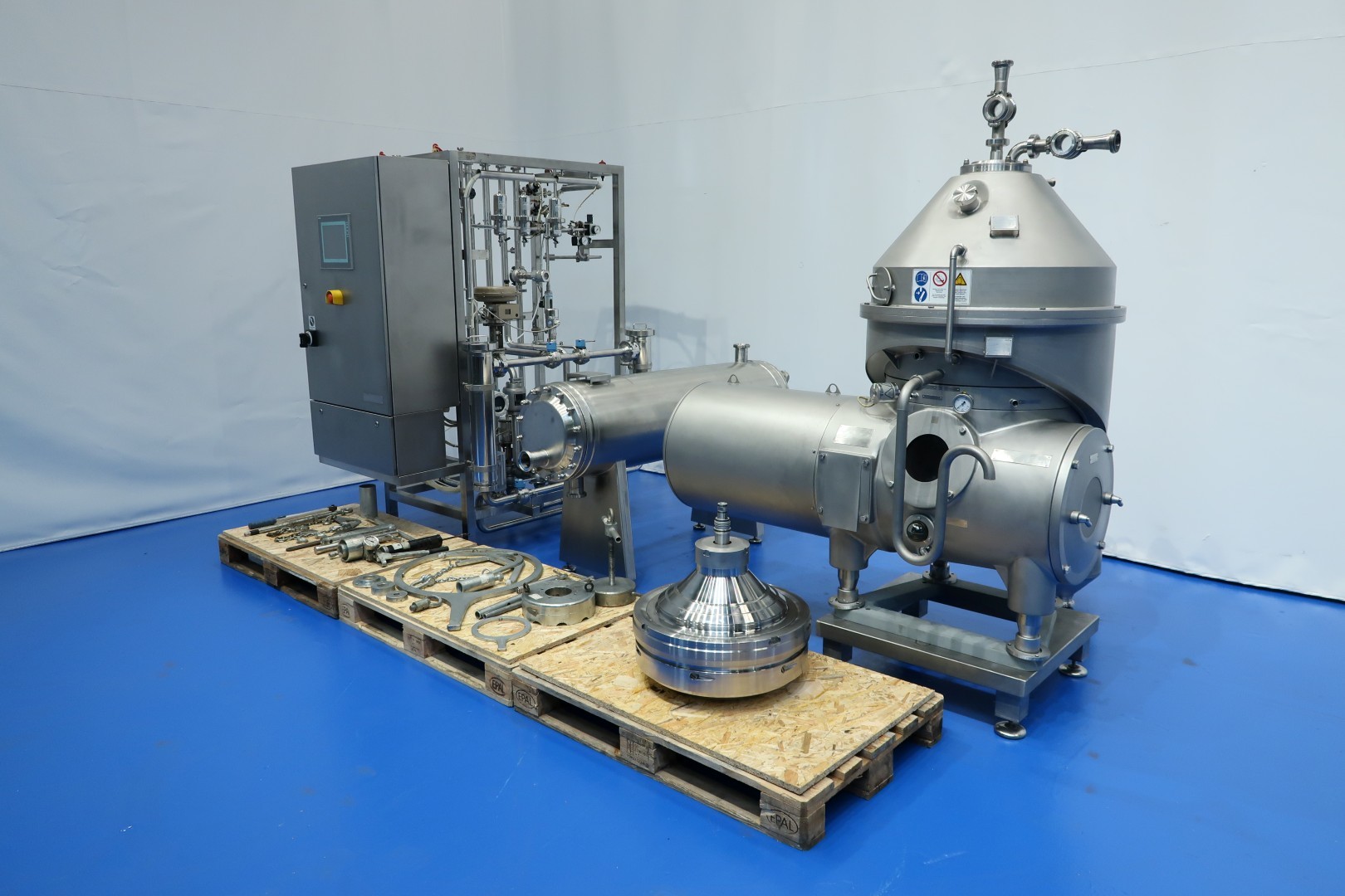 Fresh cheese - Quark - Yoghurt separator. Used for only 200hours. Nozzle separator. Dry matter adjustable by nozzle size and chosen flow between 15-21%. Input capacity of fermented skim milk 0% up to 5.400 liters per hour. Output capacity up to 1.100 kg per hour (at 18%). Max bowl speed: 6.000 rpm - solids 1,1 kg/dm3. The separator separates fermented skim milk in heavy phase, whey and light phase curd / yoghurts to concentrate the protein by a nozzle system. Ratio of input and output between 2 and 3 liter for 1 liter of concentrated end product. CIP cleanable. 6 Nozzles 0,6 mm in bowl. Including: A stainless steel skid with auxiliary equipment for the separator with on inlet milk Double filters with valves, Flow transmitter and feed flow control valve. On whey out, counter pressure, flow transmitter, valves, Sterile air filters (steam able), cooling water valves and sensors. on product outlet Product collecting hoppper. apart from the unit a Tubular product cooler GEA-Westfalia model: C1000, Foundation frame, complete set tools, and set spare parts (with 2 sets nozzles 0,6mm and 0,7mm). Closed design with sterile air filter and for extended shelf life of product. Controls: Start-delta motor starter, CPU Siemens Simatic S7 plc with touch screen hmi panel. Documentation: instruction manual, partslist and technical drawings available.