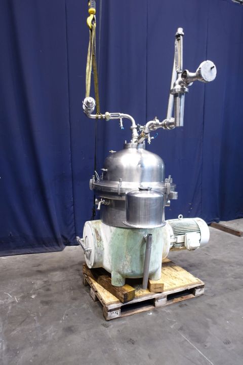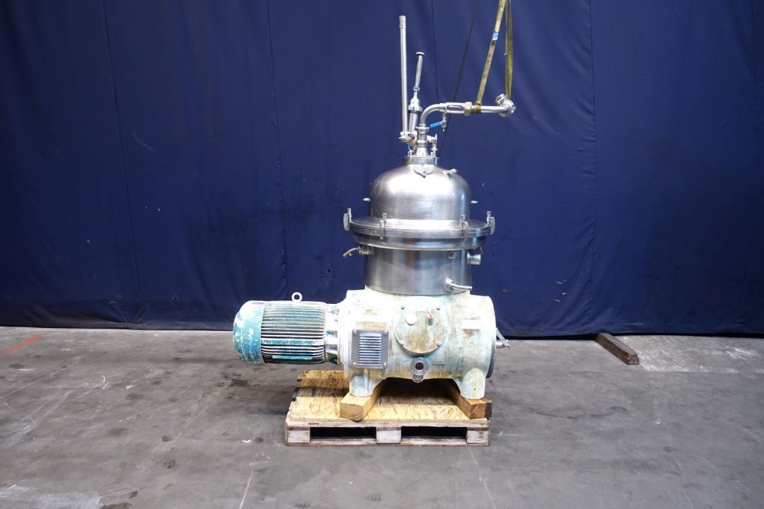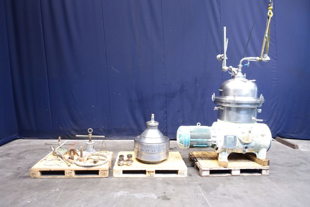 Reconditioned milk (25.000ltr/h) and whey clarifier (30.000ltr/h), self-cleaning. Including bowl, motor cover, base frame, cyclone. with sight glass and pressure gauge, manouvering water valves. Bowlspeed 4.750 rpm. Motor 30,0 kW - 59 A – 1.470 rpm. Liquid clutch. Complete set of needed tools with ring key. Total dimensions: 165x130x195 (lxwxh) cm – weight total: 2.113 kg. Fully rebuild immediate available, new control box can be made on request.