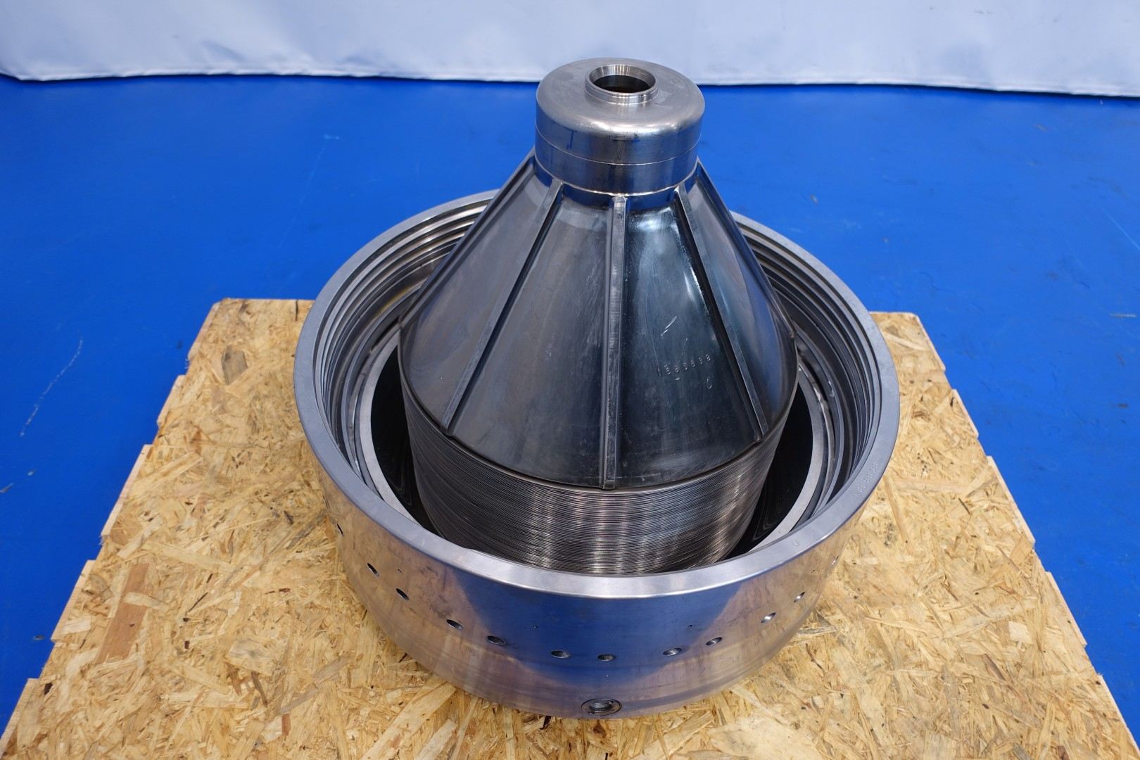 Milk and whey skimmer/separator. Self cleaning. Including bowl, motor cover, base frame, pneumatic counter pressure valve milk , E&H flowmeter on infeed and E&H flowmeter on cream outfeed. Automatic flow regulation valve for cream, manouvering water valves. With by-pass for cleaning (special design for whey and milk). Motor 18,5 kW. Fluid clutch. Bowl speed 5.920 rpm - solids 1,1 kg/dm3. Set of tools with ring key, pressing tool and 500 kg chain hoist. Controls centralized in panel of Pasteurizing unit (STN15758). Total dimensions ca. 175x135x235 (lxwxh) cm - weight: 2.079 kg.