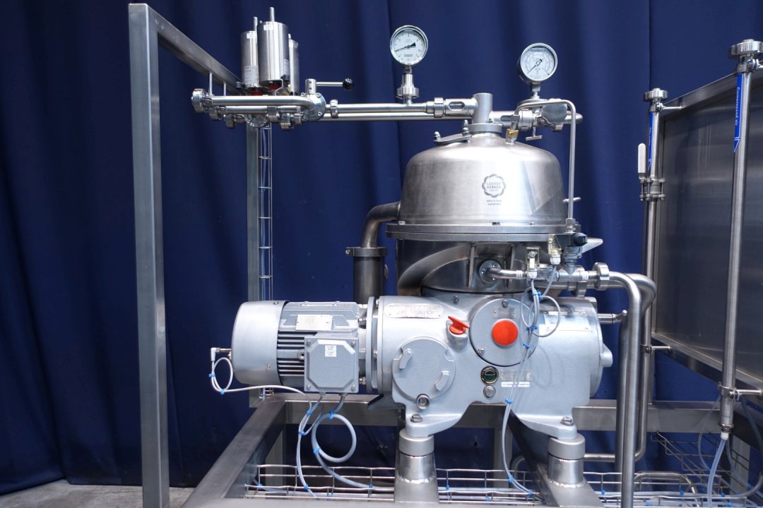 Reconditioned Water - Fat separator with single centripetal pump for heavy phase (like water/skimmilk) with self-cleaning bowl. The separator is used for separating liquid mixtures in which the proportion of light phase (for instance fatt/rest butter) is small (below 10%) or varies widely. The heavy phase is pumped out under pressure, the light fase leaves the machine by gravity through the bottom outlet. Bowl speed 9.210 rpm. Motor details: 4 kW. Ø Di in mm 271. Bowl speed: 9.210 rpm. Heavy liquids: 1,0. Solid: 1,15. by-pass product valves. Sludge collecting tank. Fully rebuild, mounted on a stainles steel frame. New control box with PLC Siemens S7-1200 and Touch Screen control panel with all messages and settings. ampère indicator motor, hour counter, frequency converter, cabling, pressure transmitters readout. Water valves for manouvering water to open and close the bowl with water reducers and constant water pressure module. Waterfilters and spare filters. Set of tools, manuals and electric scheme.