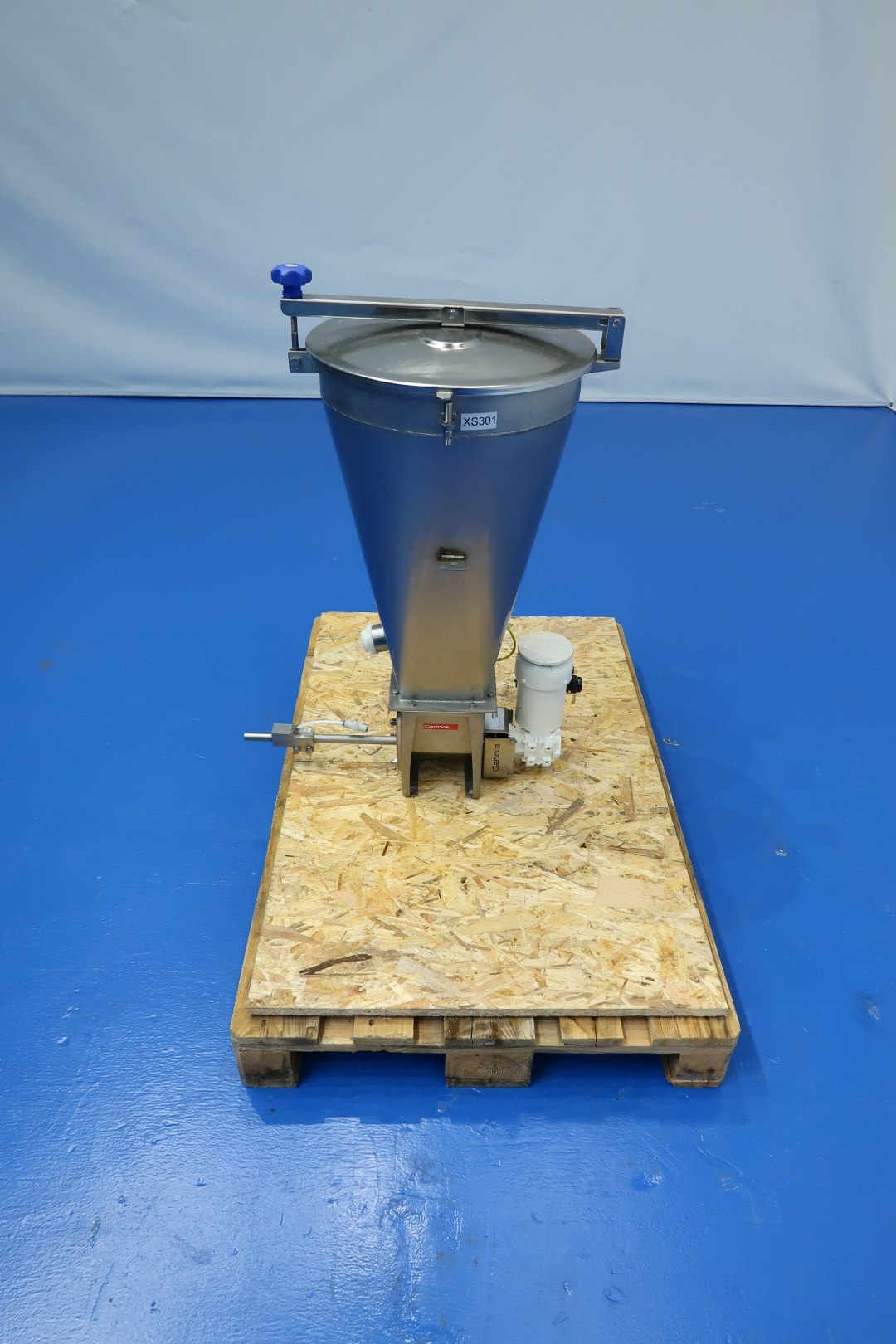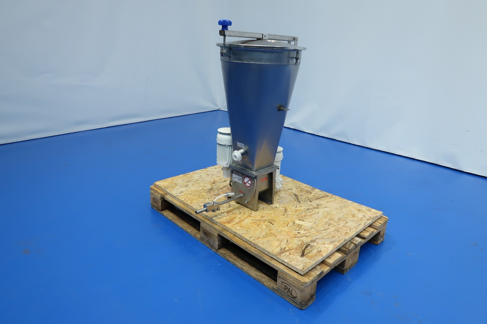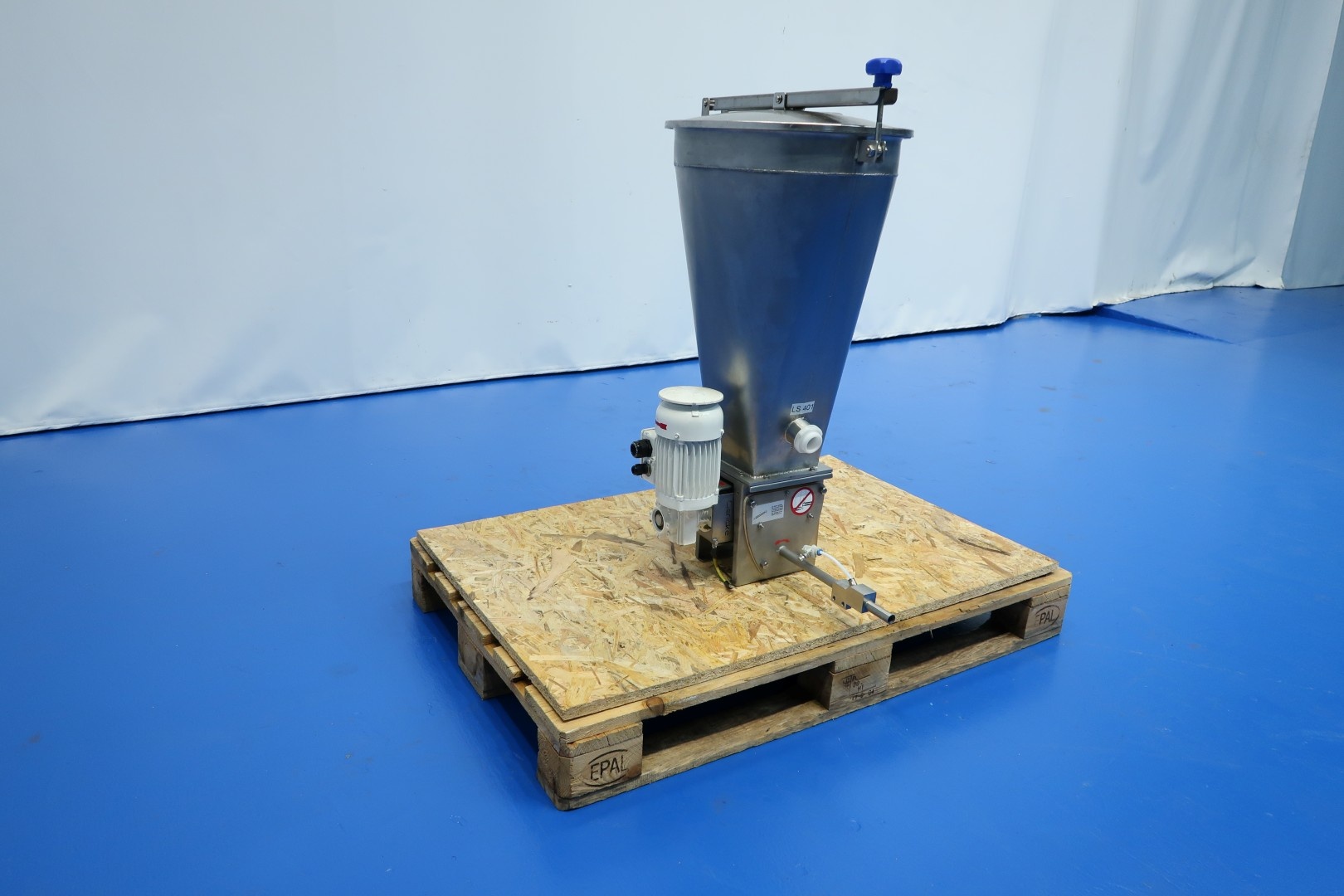 Dosing machine for powdery products. Hopper diameter 40 cm - heigth: 80 cm. Motor of agitator: 0,12 kW - 0,42 A - 50Hz - n1: 1.350 rpm - i 70 - n2: 19,5 rpm. Motor of outfeed screw: 0,12 kW - 0,8 A - 50 Hz - n1: 1.350 rpm - i: 13,5 - n2: 100 rpm. Currently outfeedscrew damaged. Total dimensions: 65x50x96 (lxwxh) cm - weight: 66 kg.
