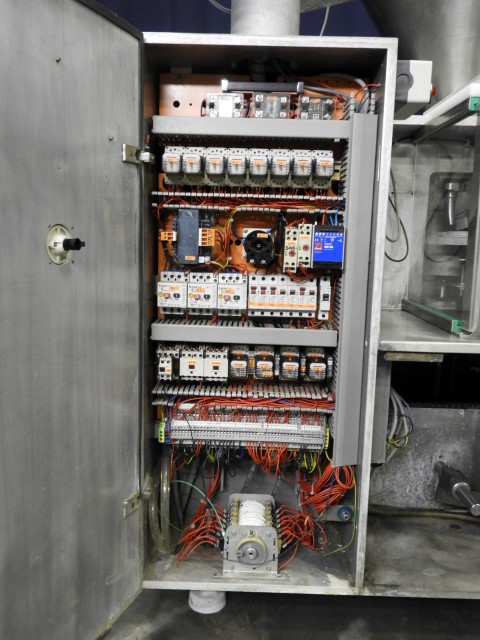 Rotary cup filling and sealing machine with 1 piston filling head. 10-Steps. Cup size round: 95 mm. Stations: cup destacking, piston main doser for viscose products with double jacketed hopper with spraybowls for cleaning without agitator, dispending by vacuum of preformed seals, heat sealing, snap cap cover station and outfeed conveyor with packing table. Manual packaging in tray. Control panel with relay controls. Machine enclosed with plexiglass guards.