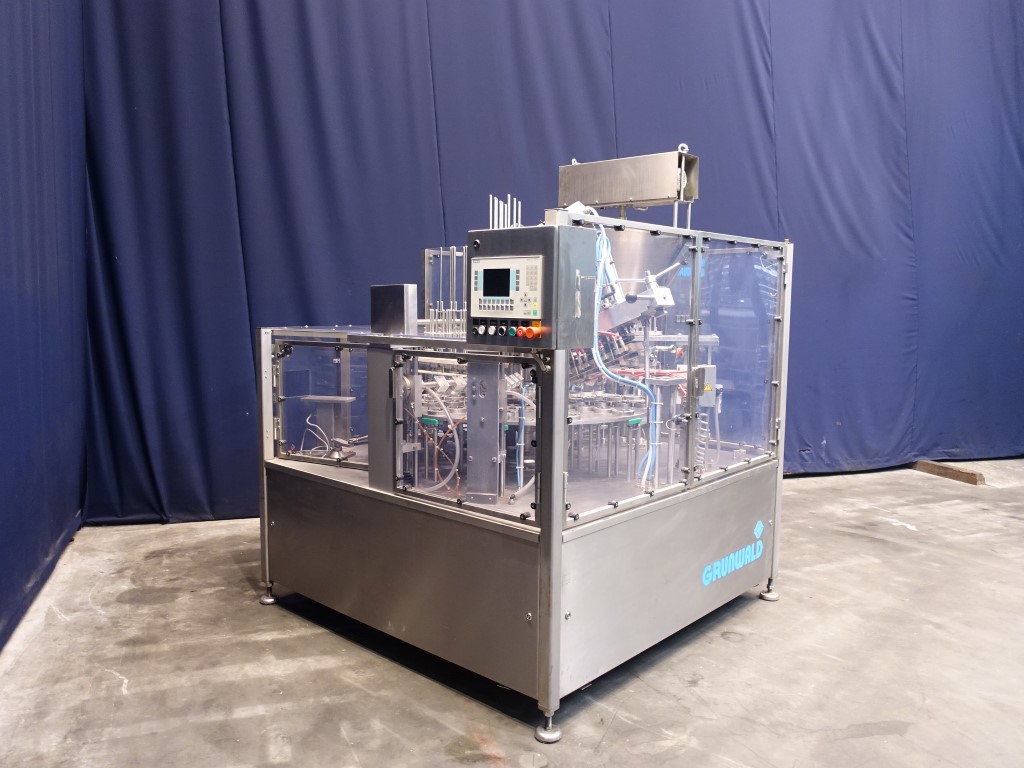 Rotatry filler with 4 heads. Cup size: 80mm with rectangular top. Stations: Cup destacking, no- or double detection, piston doser (50-250 ml) for viscose / thin liquid products with hopper and scraper agitator in hopper (manual cleaning), seal dispending by vacuum, tip sealing, heat sealing, etiket dispending by vacuum, snap-on lid, outfeed to outfeed conveyor (outfeed conveyor excluded). Machine has polycarbonate safety guards with sensors. Automatic central greasing system. Controls: Siemens S7 and Siemens Touch screen HMI. Documentation including CE declaration digital available. Total dimensions: 210 x 230 x 245 cm.