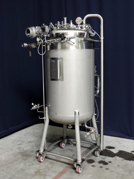 Sterile / Aseptic designed tank, with a magnetic (no seal) propellor agitator, 0.55 kW speed: n2 175 rpm, work pressure in tank up to 3 bars, (protected by break plate on 3.15bar), thank tank is insulated on top, side and bottom. The tank is cool or heatable through the double jacket with operating pressure 0-+4.5bar, there is an overpressure valve on top water inlet of jacket. Product Outlet, diameter: 34 mm tryclamp. With aseptic bottom valve (Asepco), outlet height: 50 cm, sample valve, pt-100 temp sensor, pressure transmitters in top and bottom (pressure difference), manometer and light. 2 CIP spray balls, 2 inlets, manhole in top/side round diameter 25cm. 4 mobile wheels, inner dimensions of tank diameter 54,5 cm height 120 cm outer dimensions lxwxh: 114 x 90 x 243 cm. Can be used to prepare cultures or other sterile products in a closed environment.