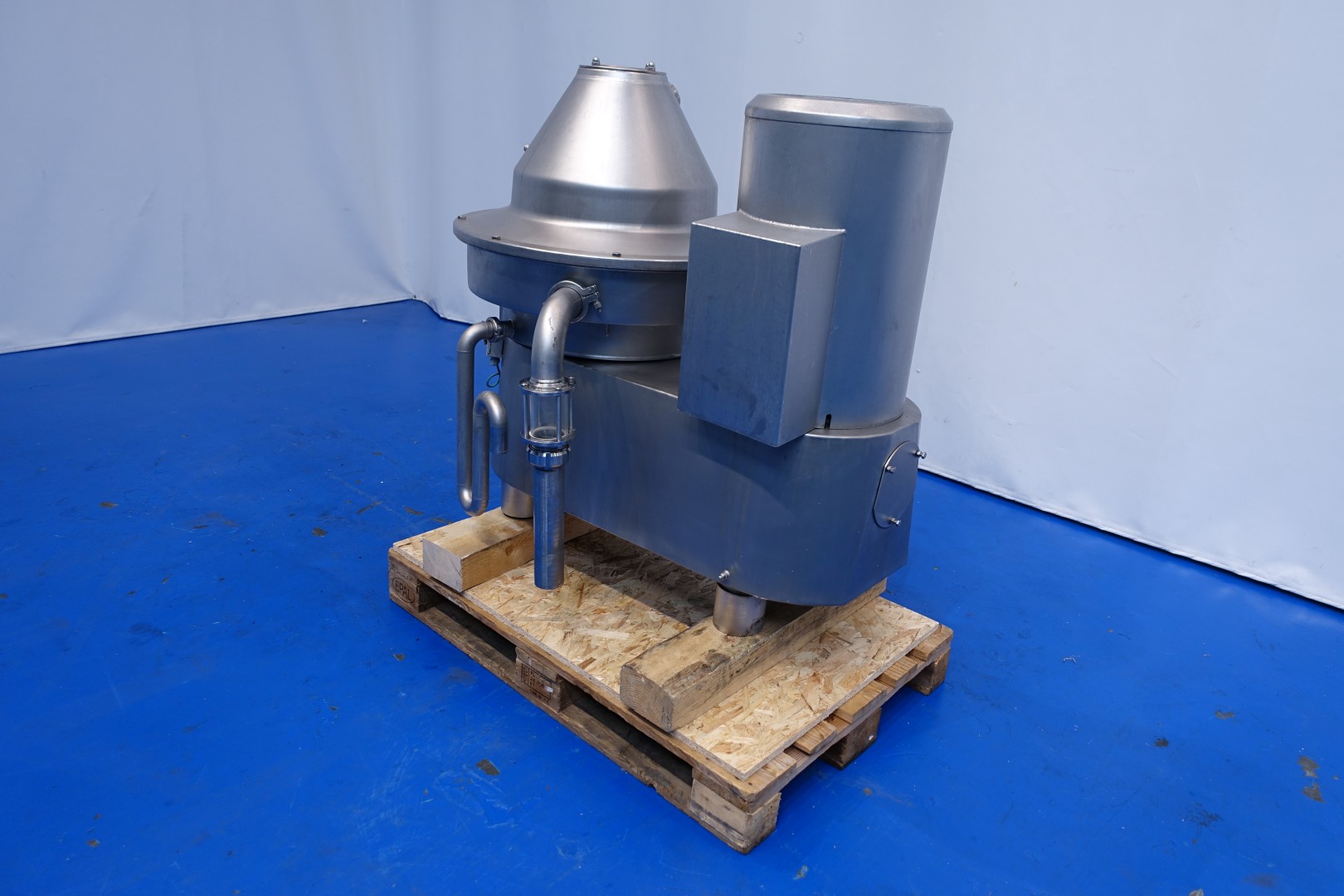 Pressing and moulding system for Big Round Cheeses. In this unit the curd is filled, in the moulds, drained and pressed. Used for production of Emmental cheeses Cylindric round model diameter 75cm. The entire press can be rotated to take out the cheeses. Suitable for 6 cheeses, with pressing cilinders, each with a cover which can be placed in a locked position. Each cilinder has a control button with 3 positions: pressing (up), neutral and release (down). Inner dimension of Cylindric press-mould: diameter 75cm Total height of mould: 32 cm after pressing up to 20cm weight per cheese: 60/85kg. Connections: 1 x 2" Din - 1 x 2,5" Din and 1 x 3" Din. Worked previously as a set with stocknumber 15793, including filling system and framework. Moulds (stocknumber 15762). Total dimensions: 610x110x122 (lxwxh) cm. - weight: 1.380 kg.