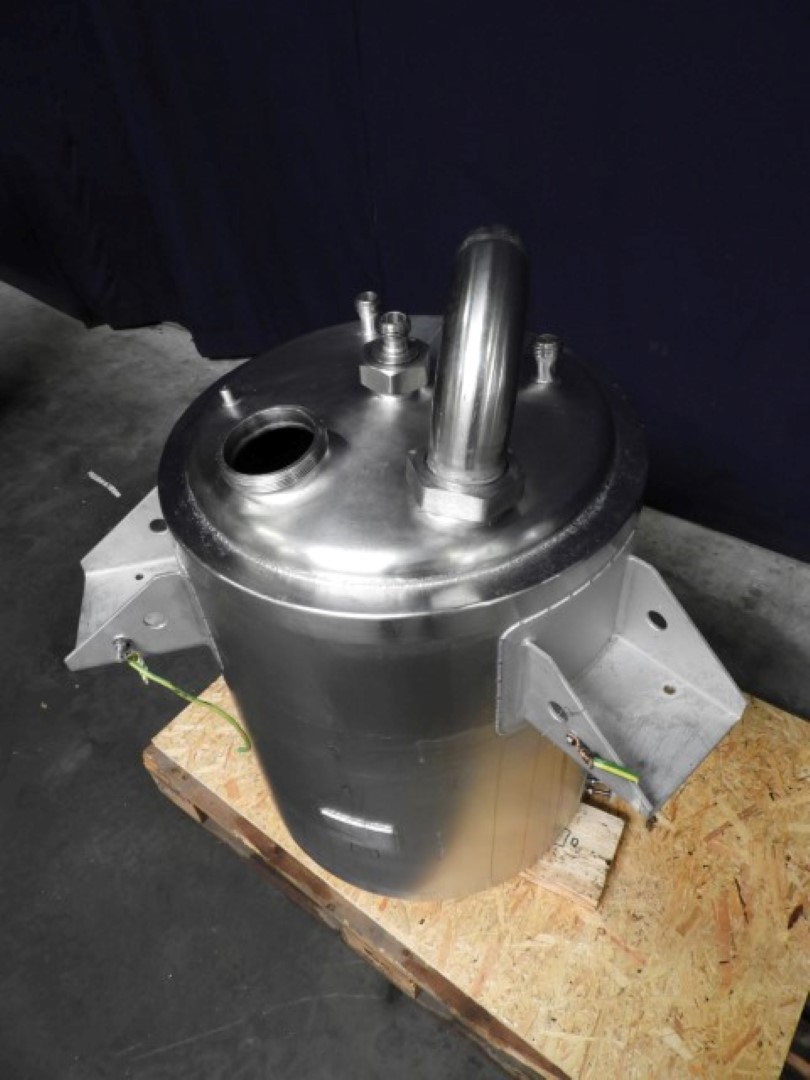 Double jacketed. No agitator. Pressure in tank: ATM. Pressure in jacket: 5 Bar. Connection: 2"Flange. Outlet to the side. CIP spray bowl. No feet. Inner dimensions of tank: diameter 580 mm, height 650 mm. Outside dimensions: lxwxh: 800 x 800 x 1000 mm.
