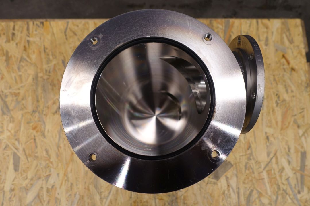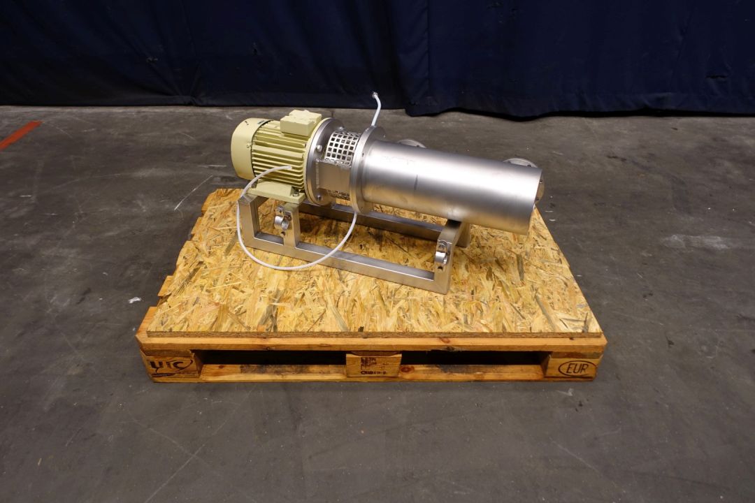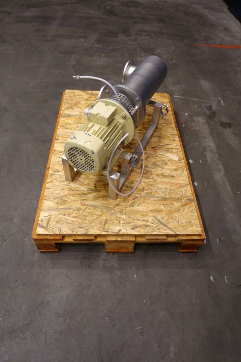Peddle gentle inline mixer. Diameter rotor: 32 mm. Length 38,5 cm. 12 Peddles on rotor. Single jacketed. Shaft speed: 950 rpm. Connections: in 150 mm / out 150 mm, Flange. Motor: 1,5 kW - 400 V - 3,9 A - 50 Hz - 950 rpm. Total dimensions 120 x 80 x 60 cm, weigth 111 kg.