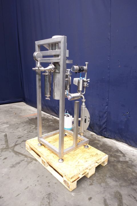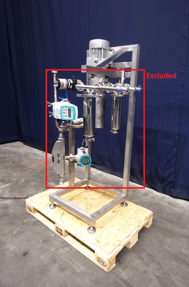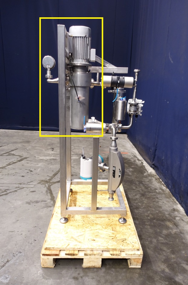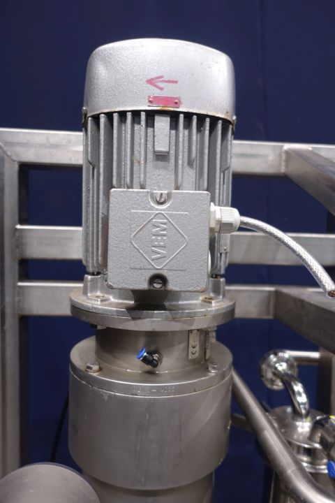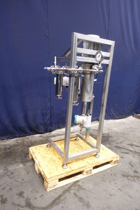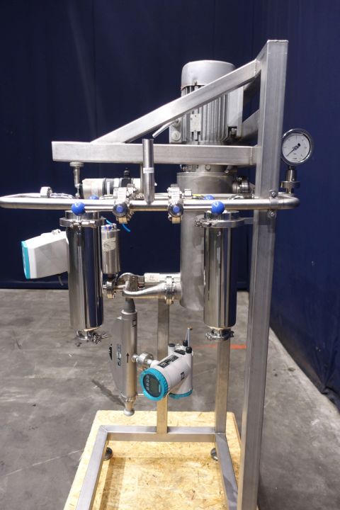 Gentle inline 'paddle' mixer with manometer. Gentle mixing with paddle mixing elements for shear sensitive products. With 2 x air connection. With flange connections. Motor: 1,5 kW - 400 V - 3,9 A - 50 Hz - 950 rpm. Built on SS frame with filters flowtransmitters, which are stocknumber 15266. Dimensions: 120x80x185 cm. Total weigth 185 kg.