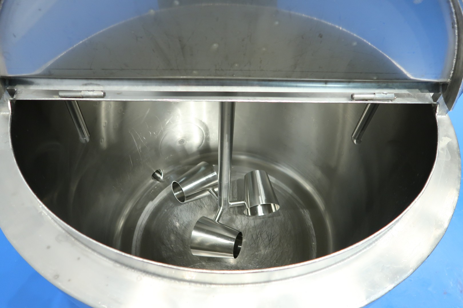 Double jacketed process tank on mobile SS frame. Top side driven agitator with 'cup' stirrer. Pressure jacket: 5 bar and volume: 1ltr. temperature: 160 °C. Complete agitator can be lifted via an air cilinder. Agitator motor driven by compressed air variable speed by manual ball valve operation. Outlet manual butterfly valve, connection 3" Din. Test video available. Total dimensions: 100x95x206 (lxwxh) cm - weight: 330 kg.