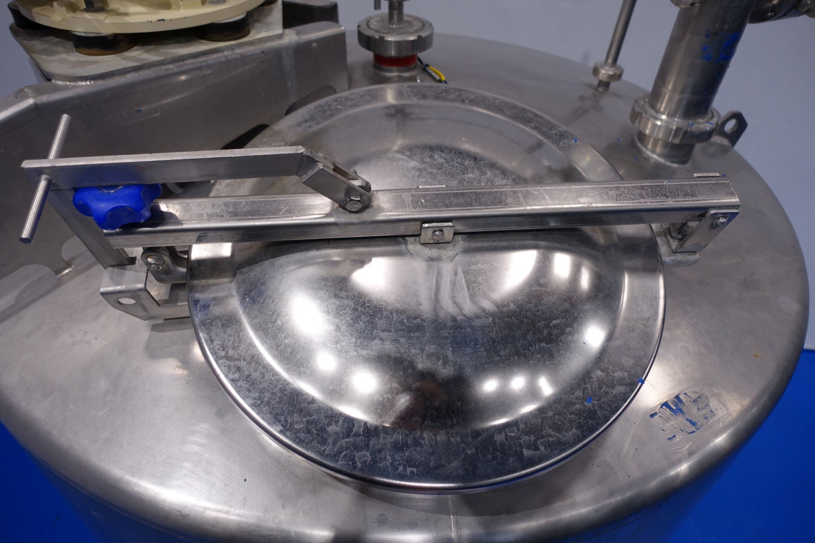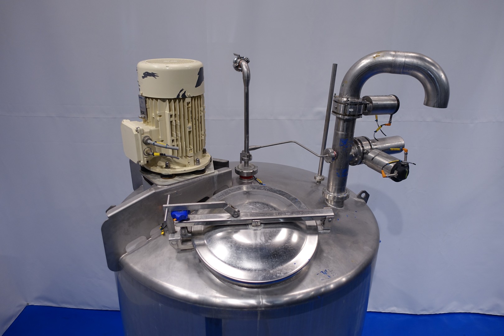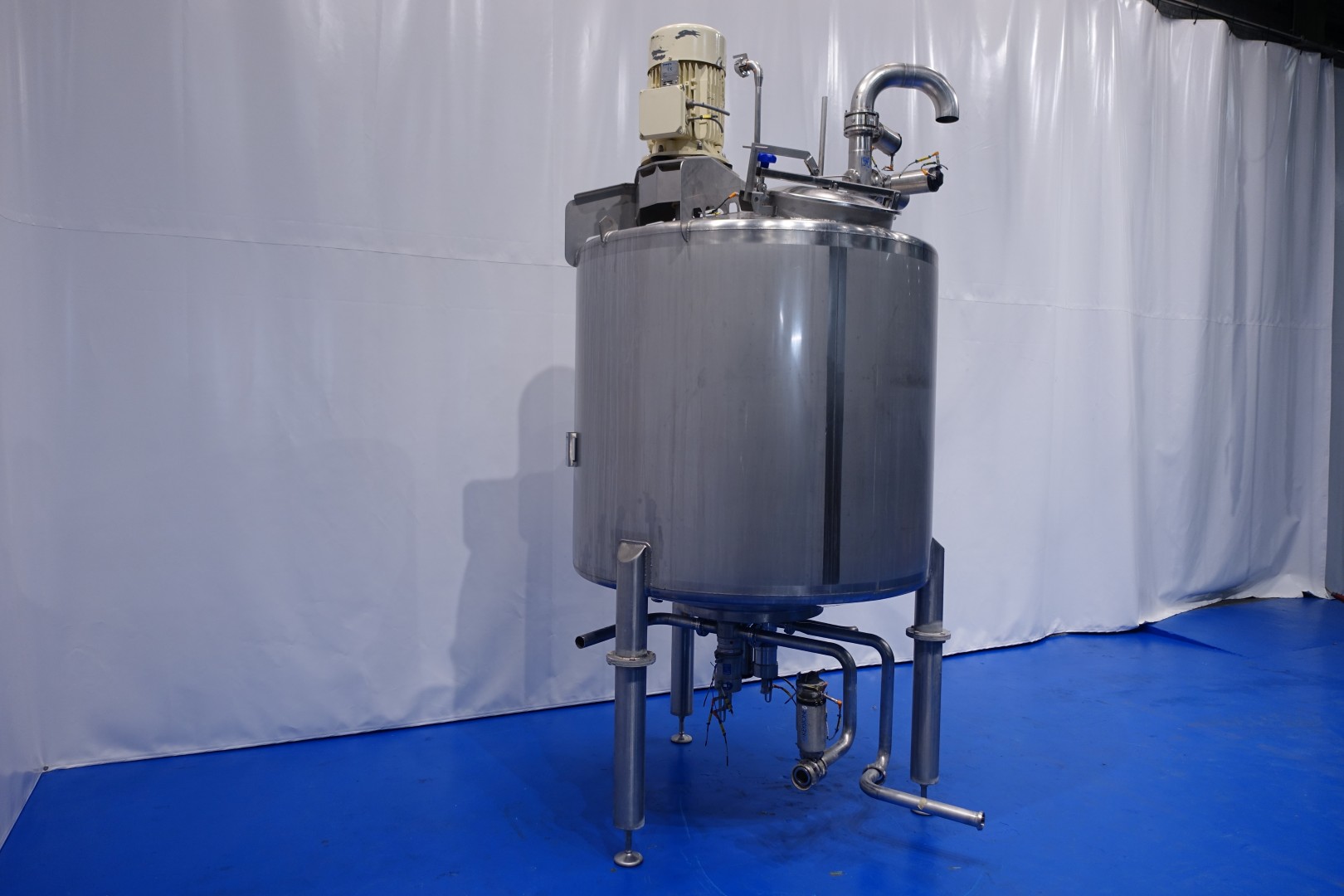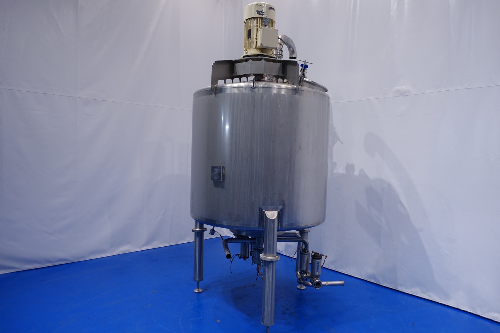 Vertical single jacketed storage tank with Jongia mix agitator. Nominal volume: 2.100 liter. Maximum cleaning temperature: 85°C.Top driven propellor agitator, Jongia type: JDR 7,5/4B - built in 2016 - motor: 5,5 kW - 12,5 A - 710 rpm. With pressure transmitter and outlet valve in bottom. 2 CIP spray bowls of which one in product inletpipe. 3 Adjustable feet. Outlet height ca. 71 cm. With 2x bottom double seat mix proof valves with 2 position sensors make: Südmo (pentair). 2 connections to be able to flush the outlet pipe even when tank is full. Manhole in top round Ø 51 cm. Inside dimensions of tank: Ø 150 cm - cylindrical height: 125 cm. Total dimensions: (lxwxh) 150x150x320 cm - weight: 544 kg.