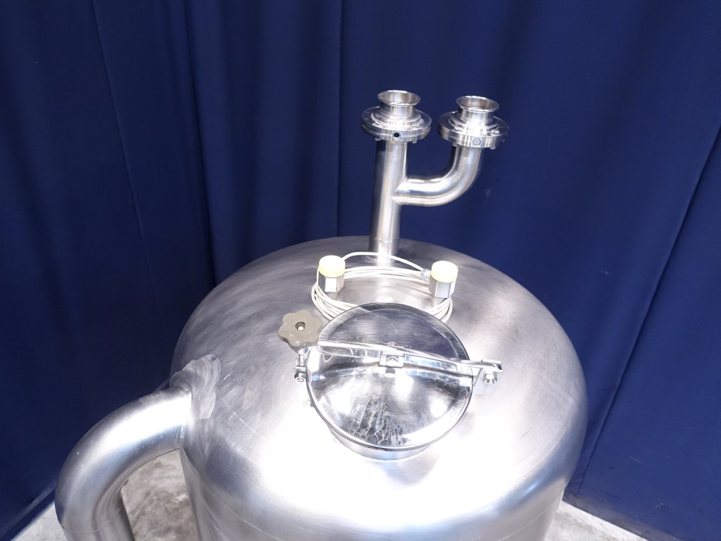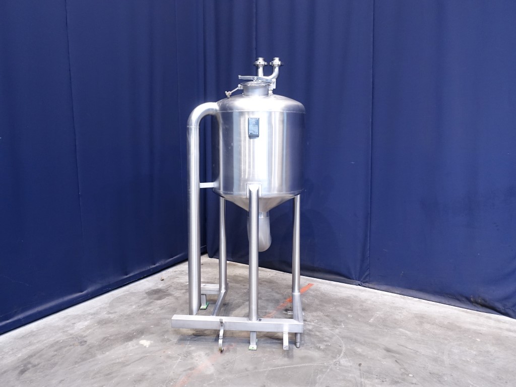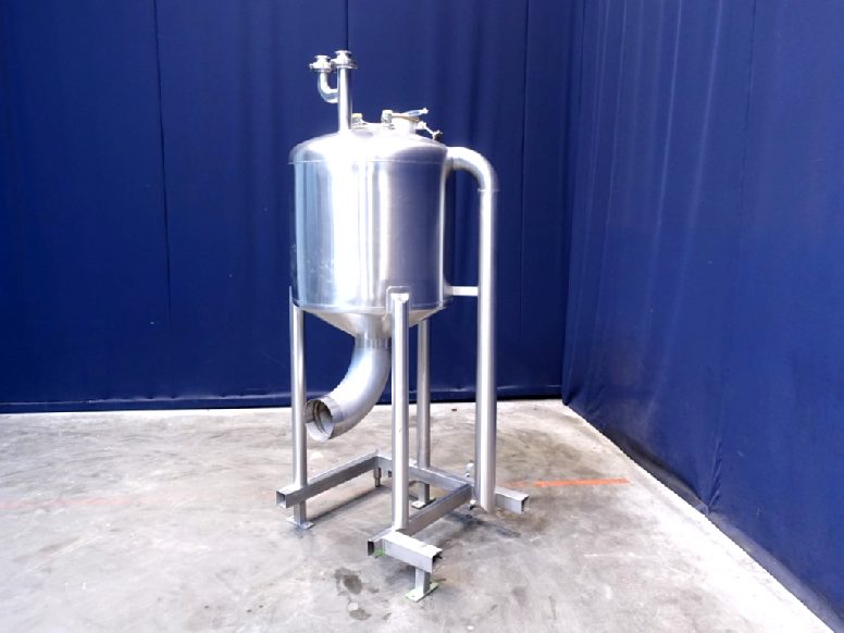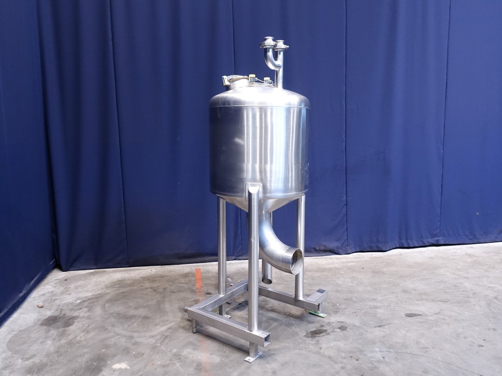 Vertical level tank. Pressure in tank atmospherique. Conical bottom. Product outlet, 8'' and outlet height: 70 cm. Material: 304L. Connections for: high and low level sensors. Manhole in top, round, diameter 200 mm. 4'' Overflow tube. Butterfly valves on inlet. 4 Feet. Inside dimensions of tank: diameter 800 mm and height 600 mm. Total dimensions: 110 x 110 x 240 cm.