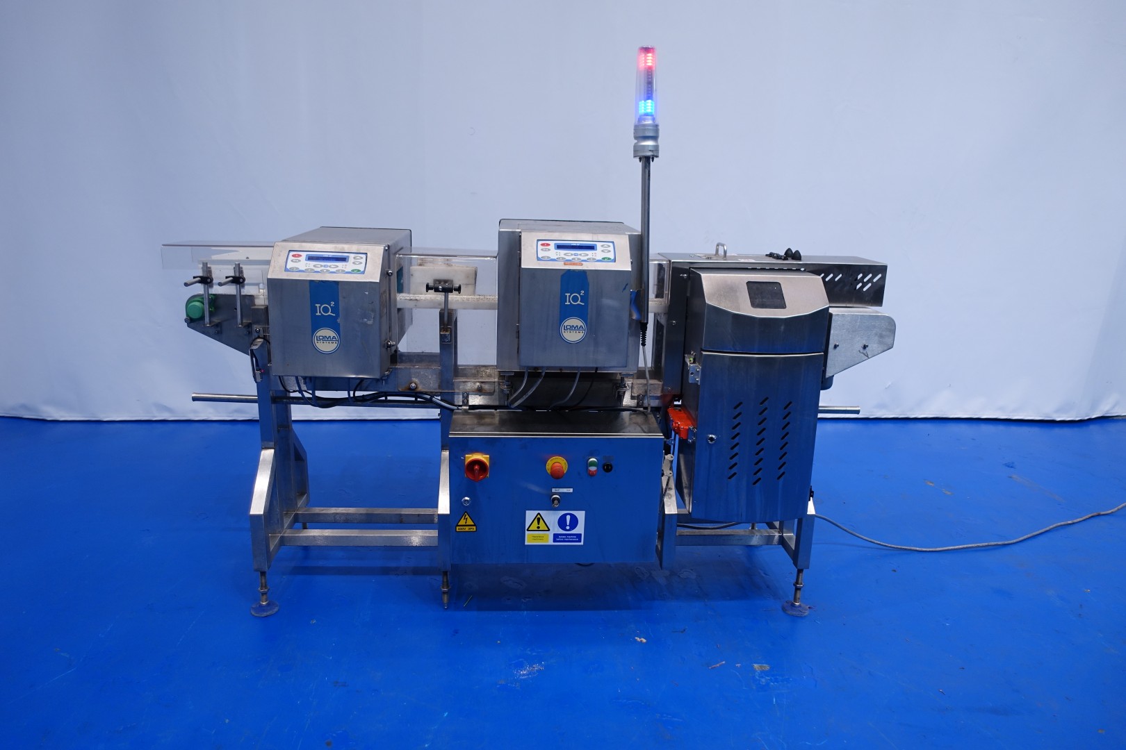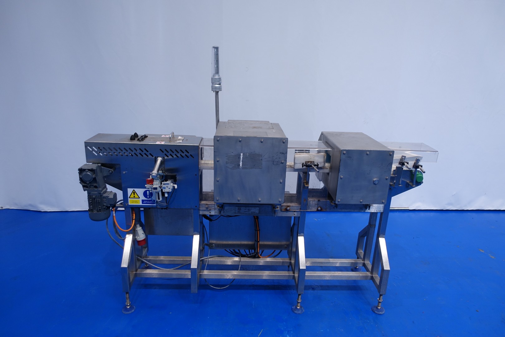 Metal detector, through put, size of product maximum: 15 x 8 (wxh) cm (aperture size 15x12,3 cm). Including conveyor; length 210 cm - width 10 cm, ejecting system by pneumatic arm with collecting tray. Total dimensions: 217x65x166 (lxwxh) cm - weight: 288 kg.